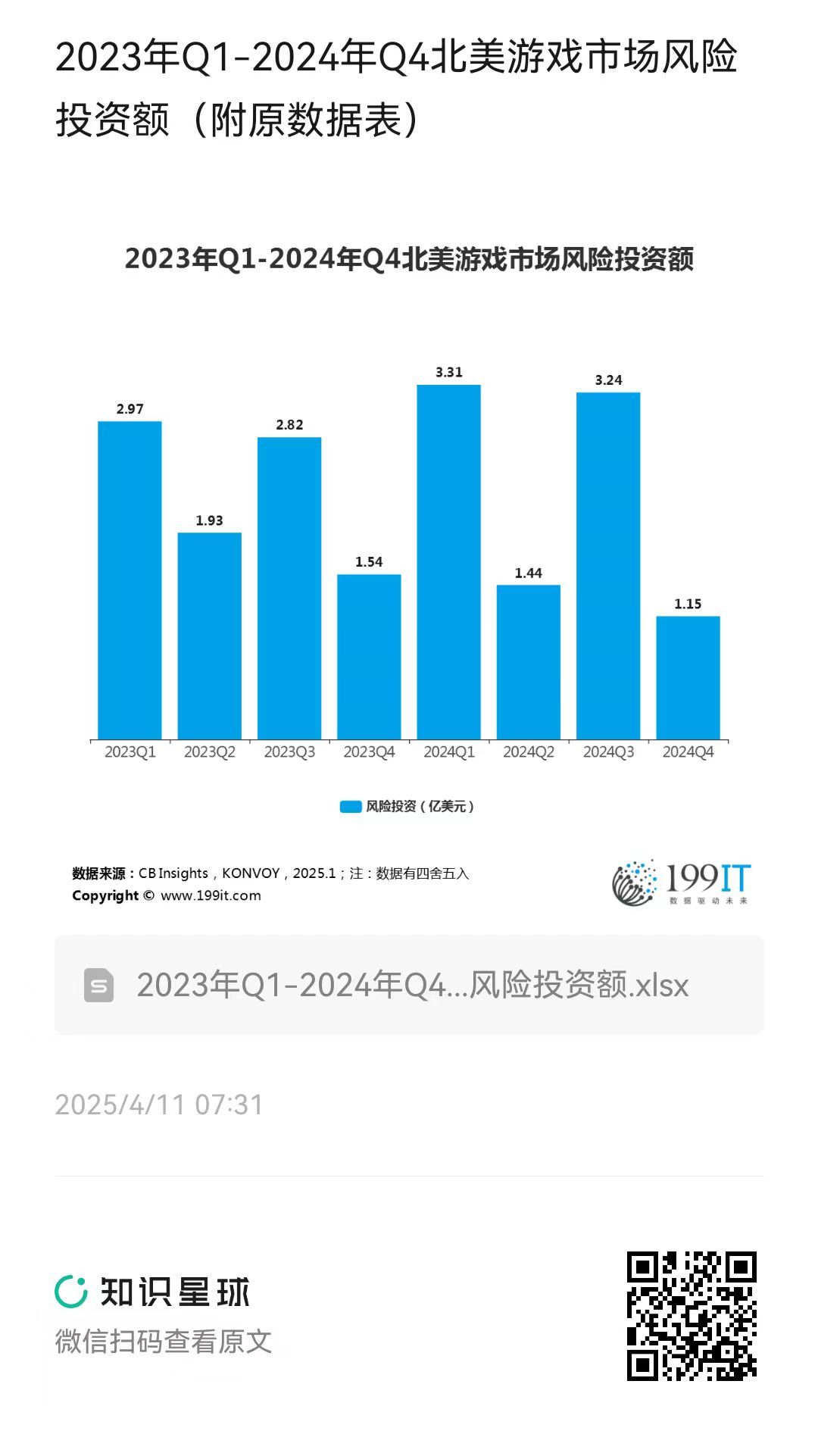 2023年Q1-2024年Q4北美游戏市场风险投资额(附原数据表) ​​​