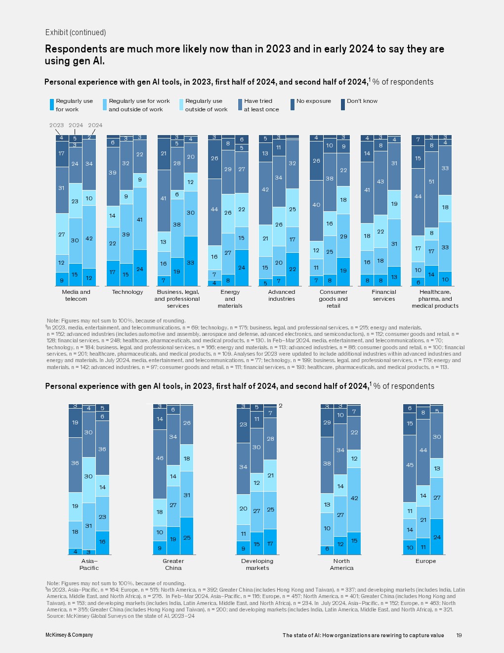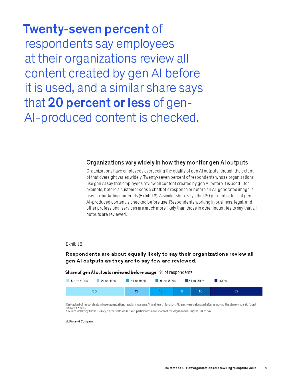 AI的价值来自改变公司的运营方式。最新调查显示,在所有测试的25个属性中,工作流程的重新设计对组织从生成式AI使用中看到EBIT影响的能力影响最大。组织在部署生成式AI时正开始重塑其工作流程。21%报告其组织使用生成式AI的受访者表示,他们的组织已从根本上重新设计了至少部分工作流程。