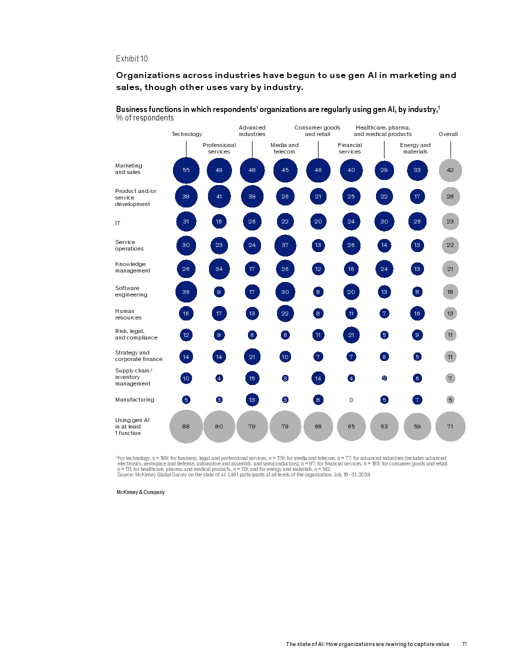 麦肯锡最新的全球人工智能调查发现,组织正开始采取能够推动利润影响的措施——例如在部署生成式人工智能时重新设计工作流程,并让高级领导者担任关键角色,如监督人工智能治理。调查结果还显示,组织正在努力减轻日益增长的与生成式人工智能相关的风险,同时为新的AI相关职位招聘人才,并对员工进行再培训以参与AI部署。年收入至少5亿美元的公司比规模较小的组织变革更快。总体而言,人工智能(包括生成式AI和分析型AI)的使用持续保持增长势头:超过3/4的受访者表示,他们的组织至少在某一业务职能中使用AI。特别是生成式AI的使用正在快速增长。