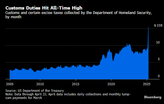 财政部的数据显示,4月关税和其他特定商品消费税收入至少将达到154亿美元。根据汇总的数据,以美元计,这将创下单月历史最高纪录。
