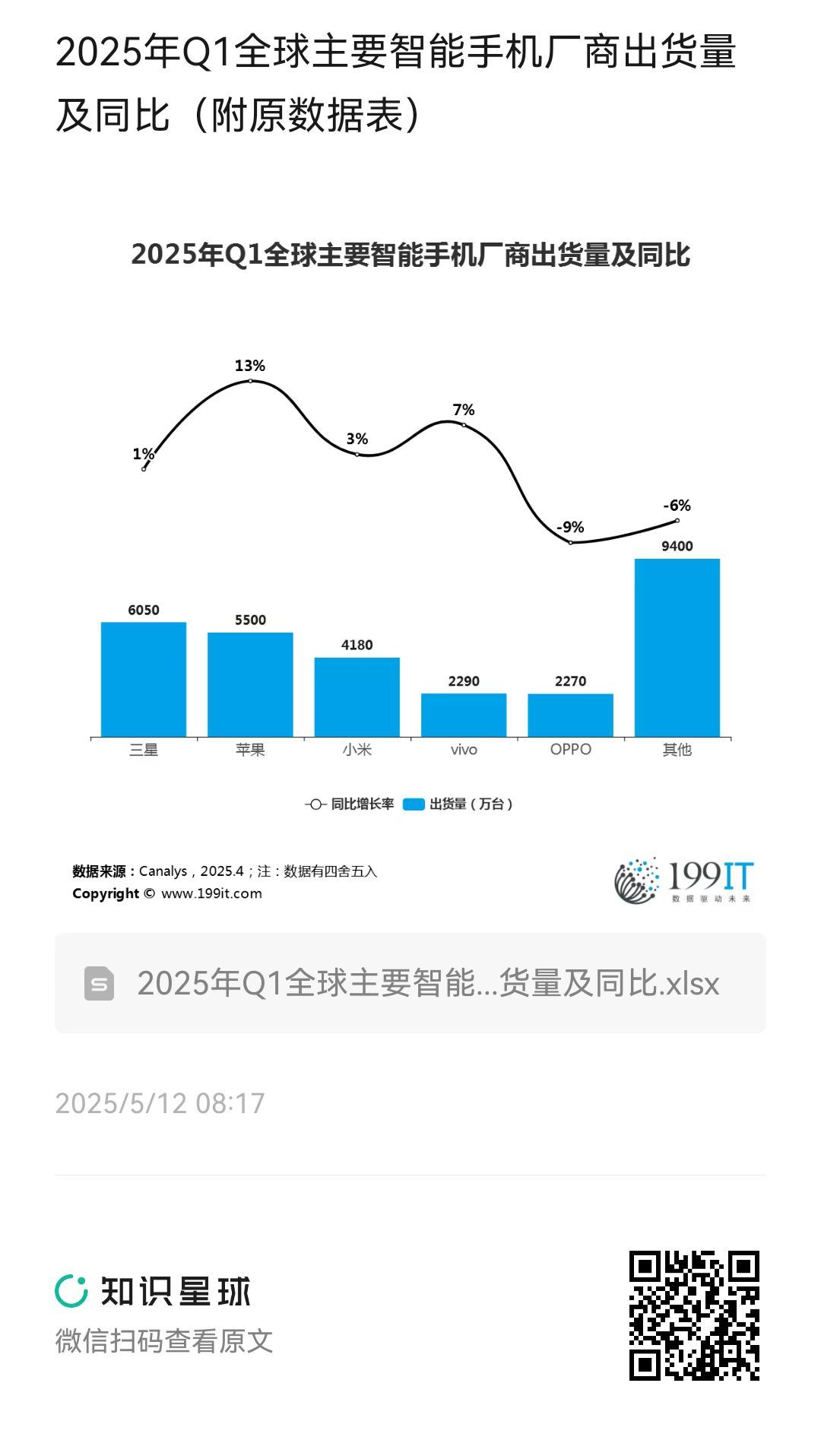 - 2025年Q1全球主要智能手机厂商出货量市场份额(附原数据表)