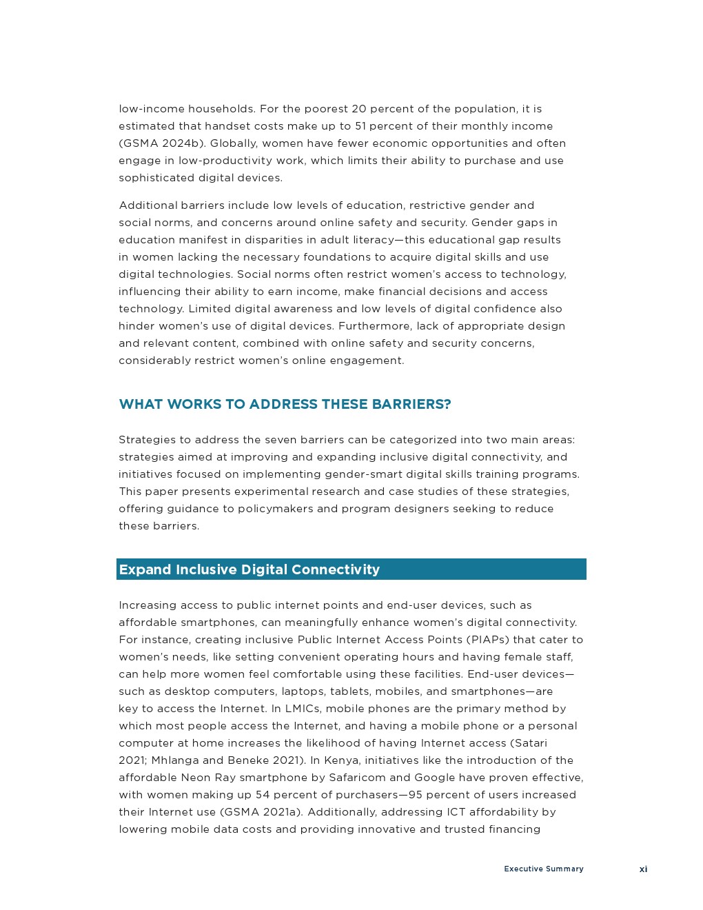 在政策与项目层面,报告分析了100余项计划,提出以“连接扩展”与“性别敏感培训”为双支柱的设计框架。有效做法包括建设女性友好的公共上网点、提供可负担终端融资方案、结合课堂式与同伴式教学、采用碎片化学习与行为激励机制,并配套托幼与交通支持。实验研究显示,基于短信的商业培训、同伴参与与行为干预可显著提升女性储蓄、还款与创业表现。