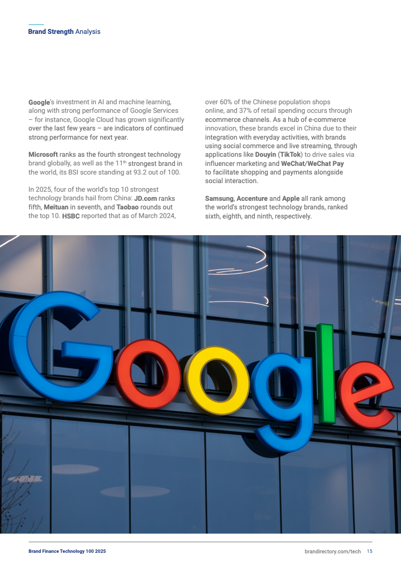 品牌强度维度呈现出不同于品牌价值的结构。微信以95.2的品牌强度指数连续第二年成为全球最强科技品牌,体现其在中国市场的高渗透率与生态黏性。值得注意的是,微信品牌价值却同比下降21%,显示“强认知、弱预期”的分化现象,反映监管、增长天花板对长期现金流预期的影响。