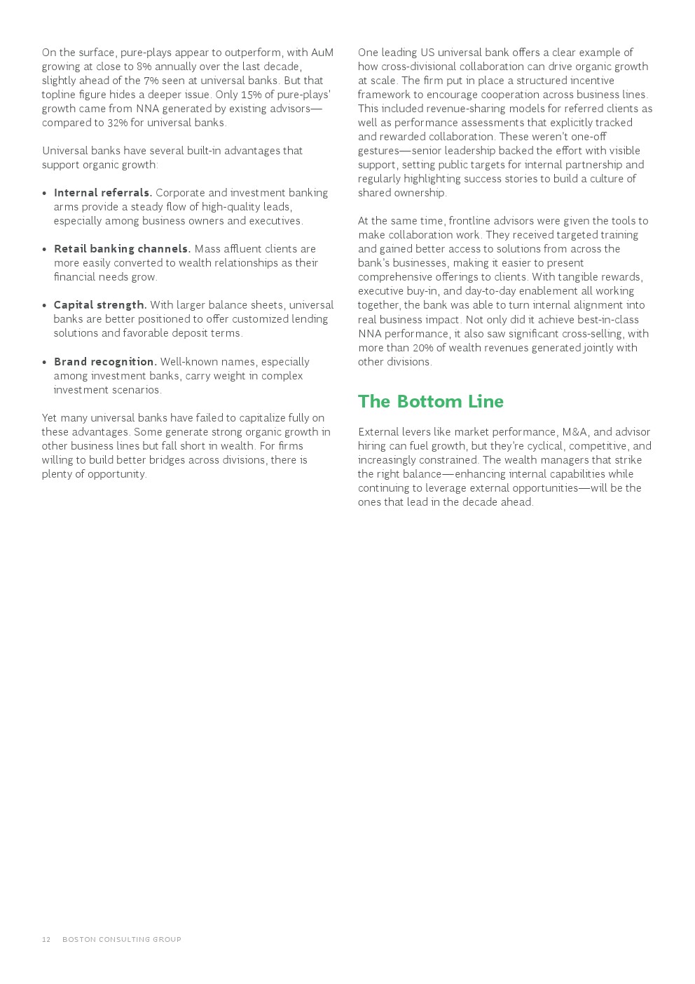 • 综合银行有机增长表现优于专业机构,其AuM增长的32%来自现有顾问团队,是专业机构(15%)的两倍,这得益于其线索生成的结构性优势