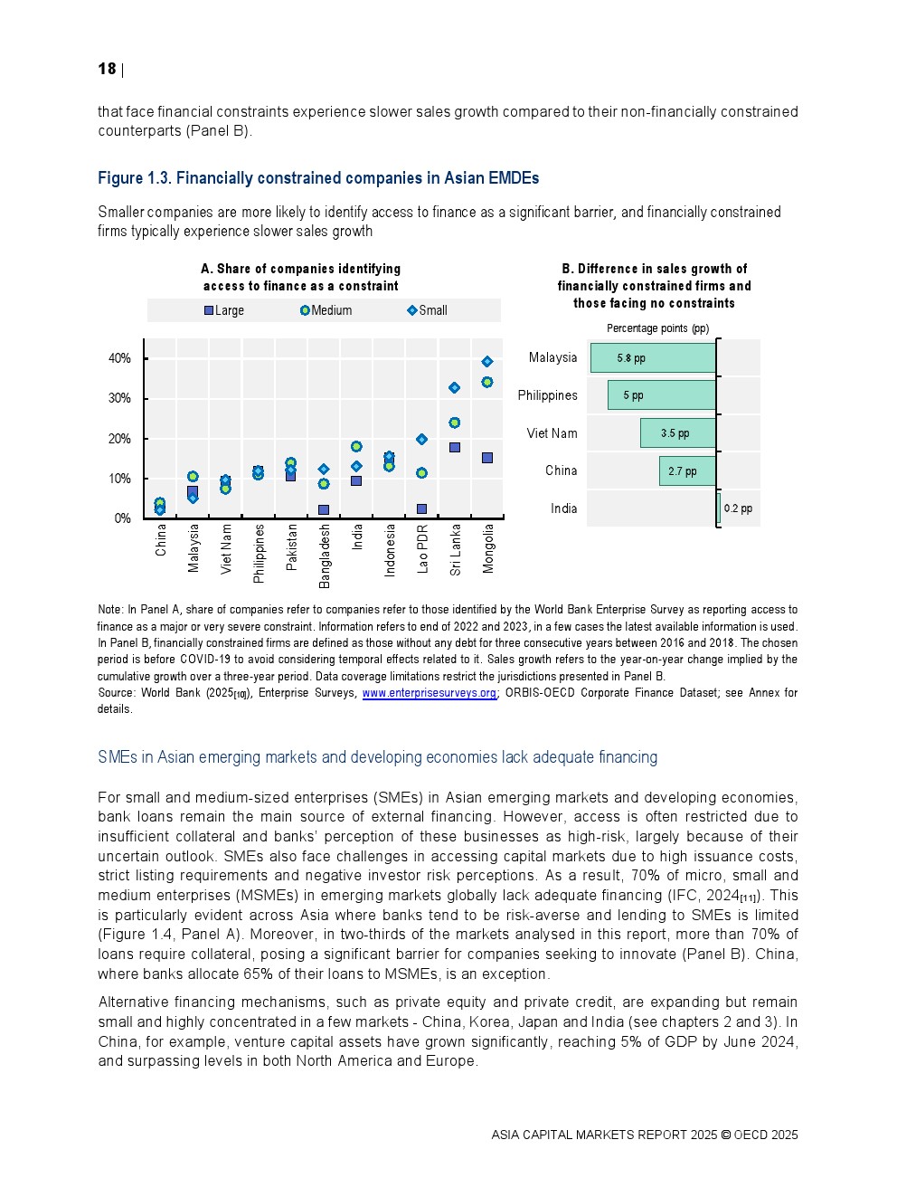 尽管市场融资在该地区的作用日益增强,但在所分析的亚洲国家中,仍有一半的企业融资以银行为主导,信贷占GDP的比例高于全球水平。亚洲非金融企业的债务融资绝大部分是银行贷款,而非债务证券,后者仅占总债务融资的14%。最大的问题在于那些信贷和市场融资均未充分发展以支持经济增长的国家,许多企业可能面临融资约束。