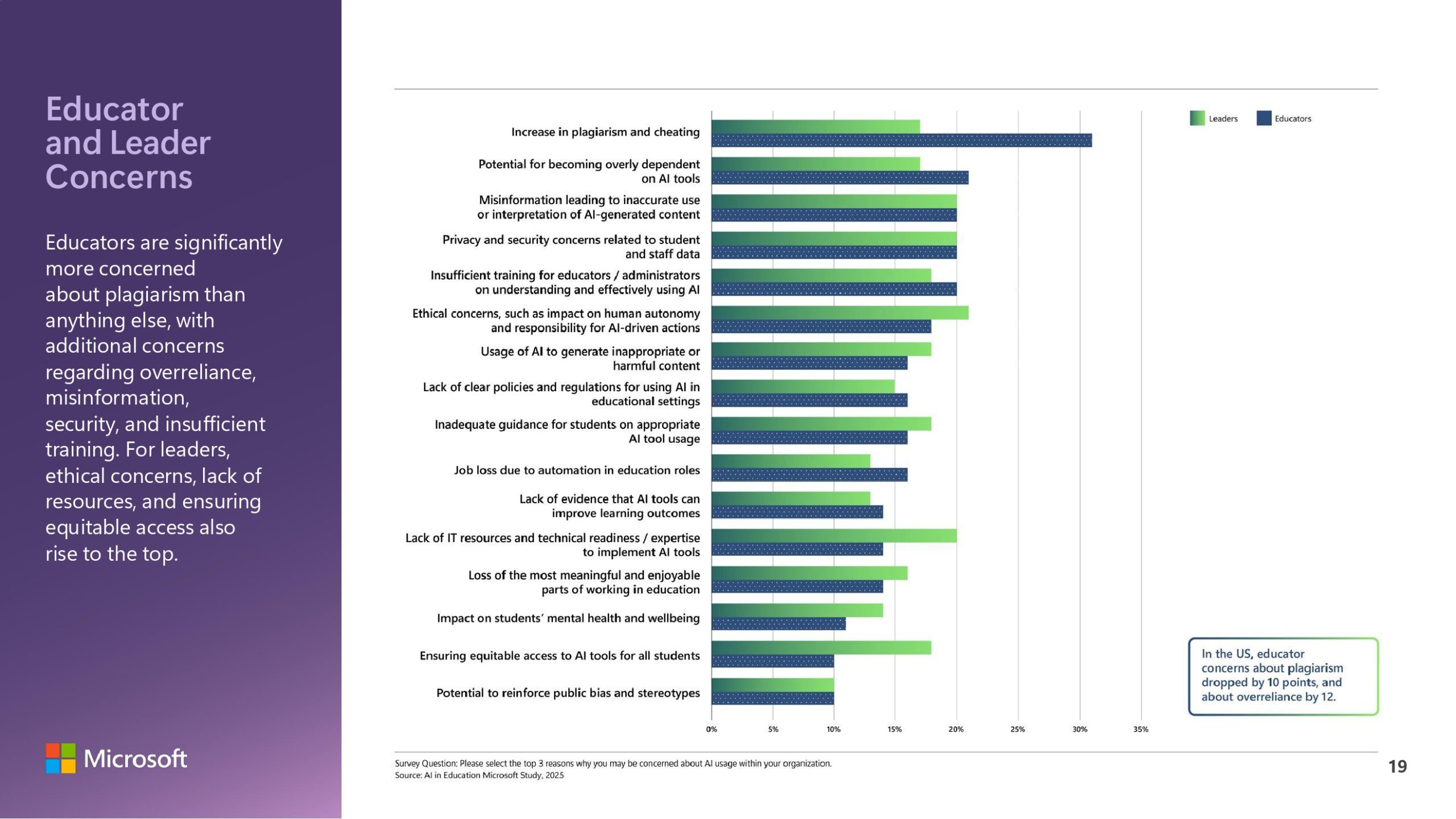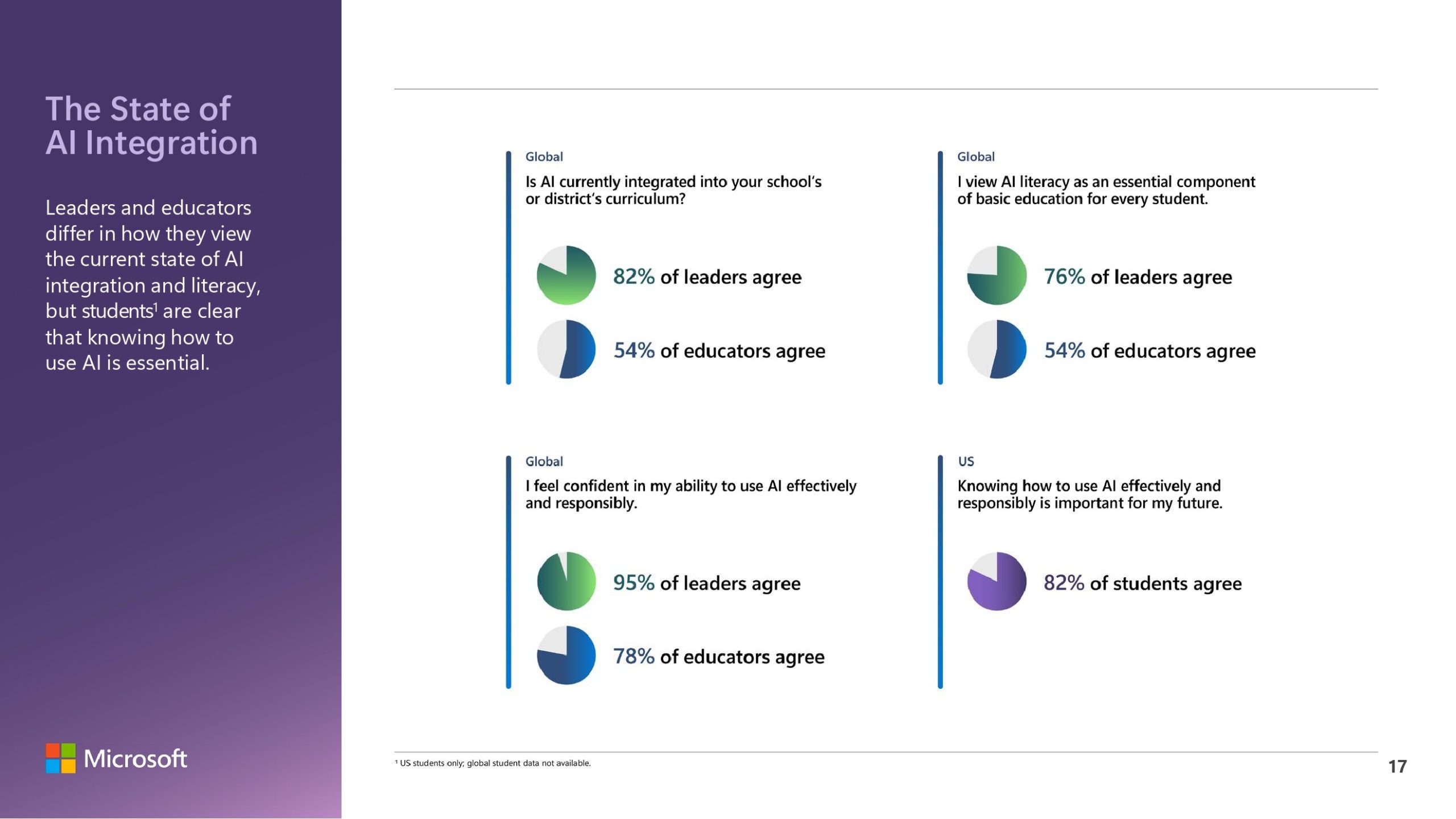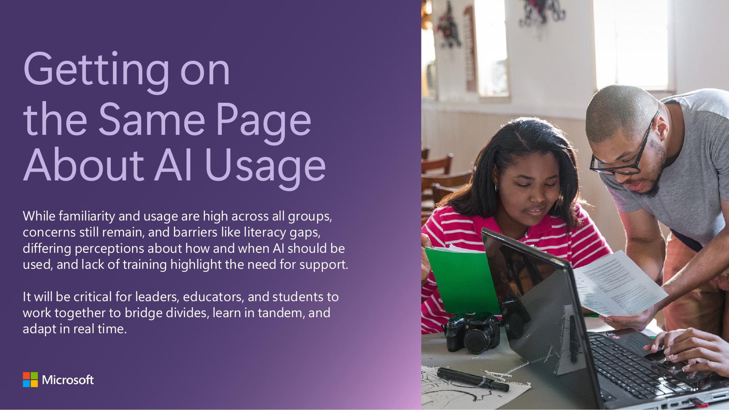 尽管各群体对 AI 的熟悉度和使用率都很高,但担忧仍然存在,诸如素养差距、对 AI 使用方式和时机的不同看法,以及缺乏培训等障碍凸显了支持的必要性。领导者、教育工作者和学生必须共同努力弥合分歧、同步学习并实时调整,这一点至关重要。