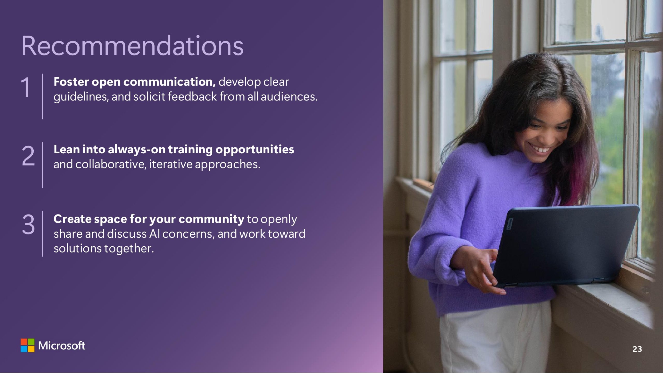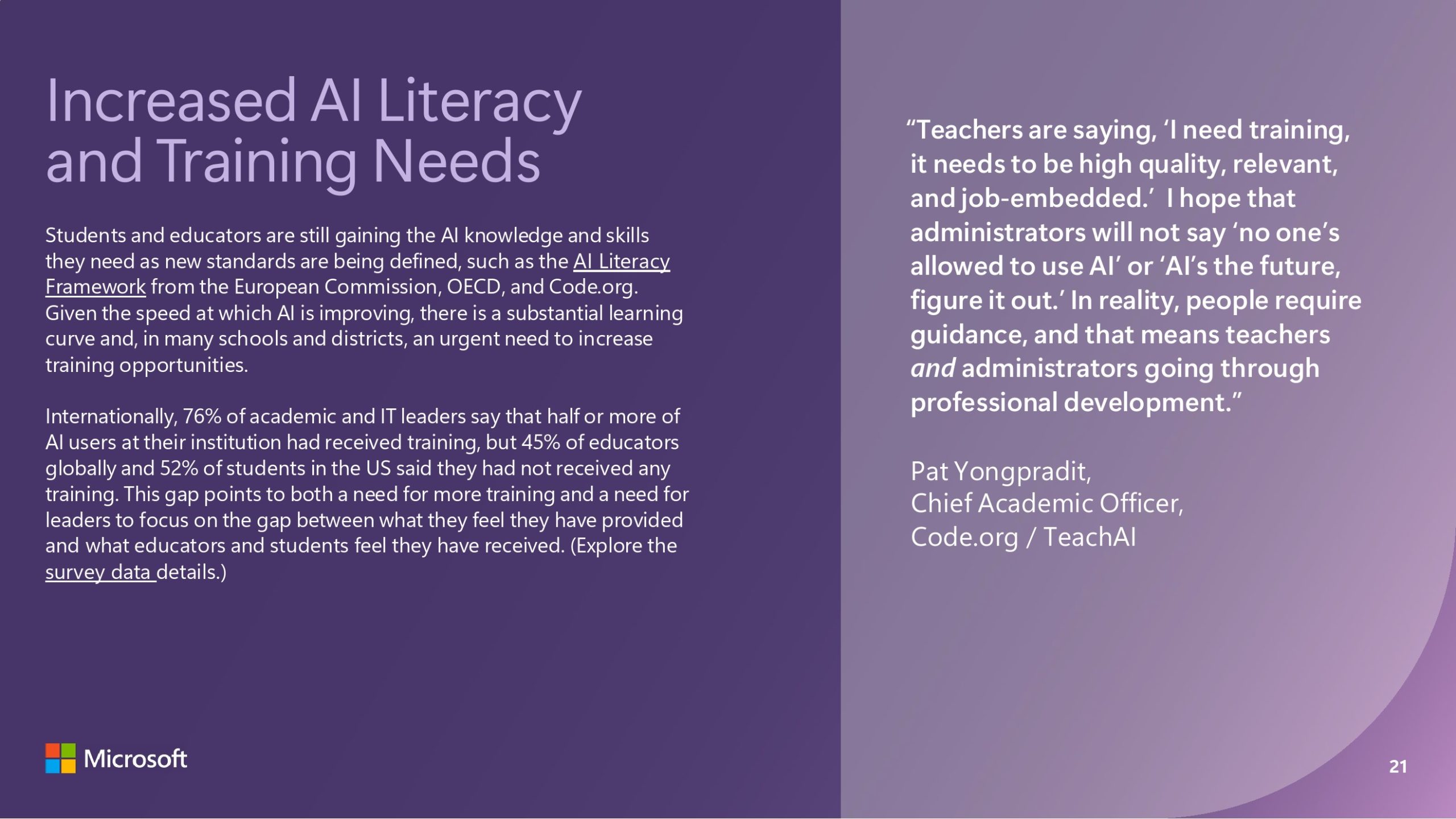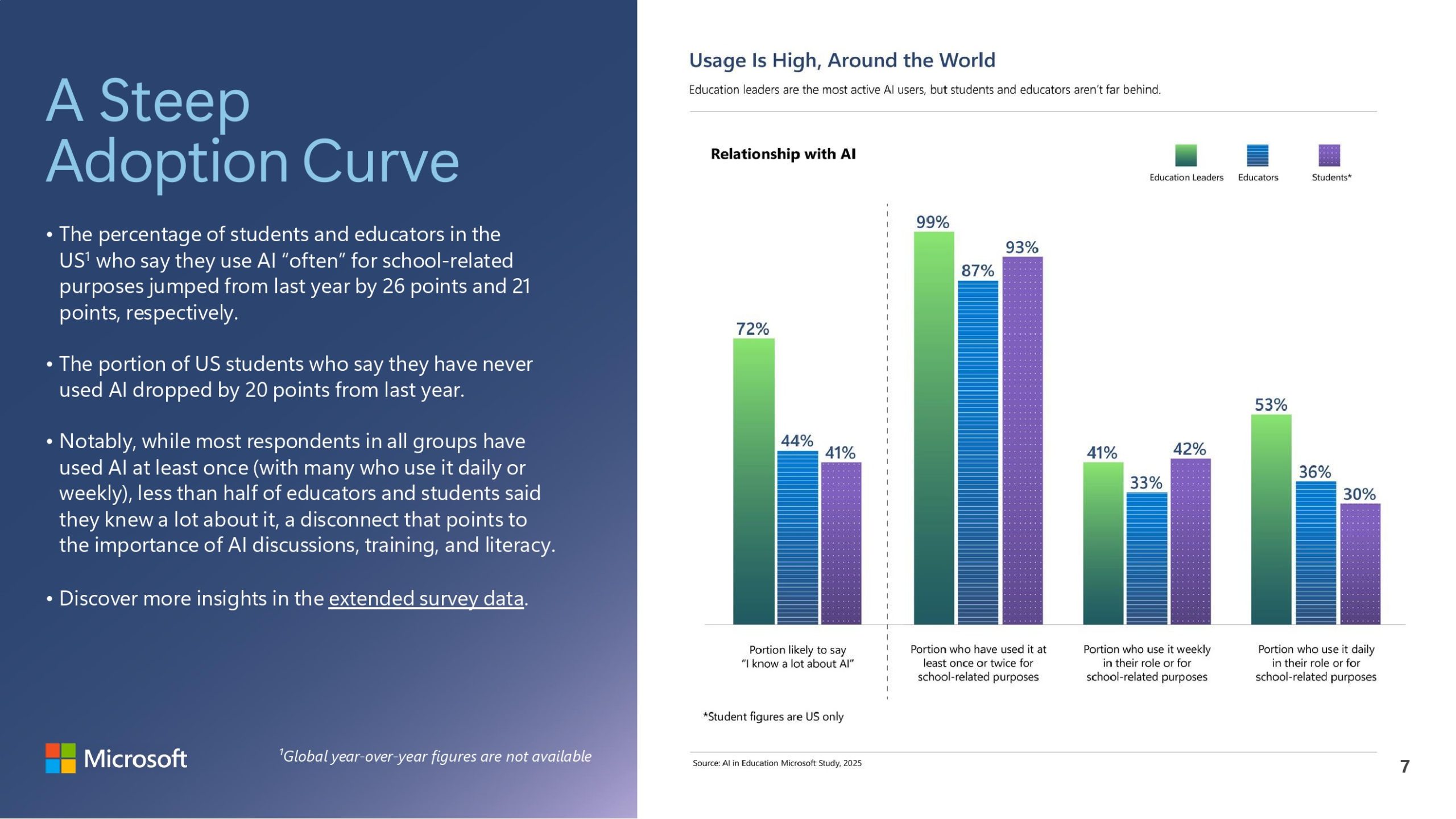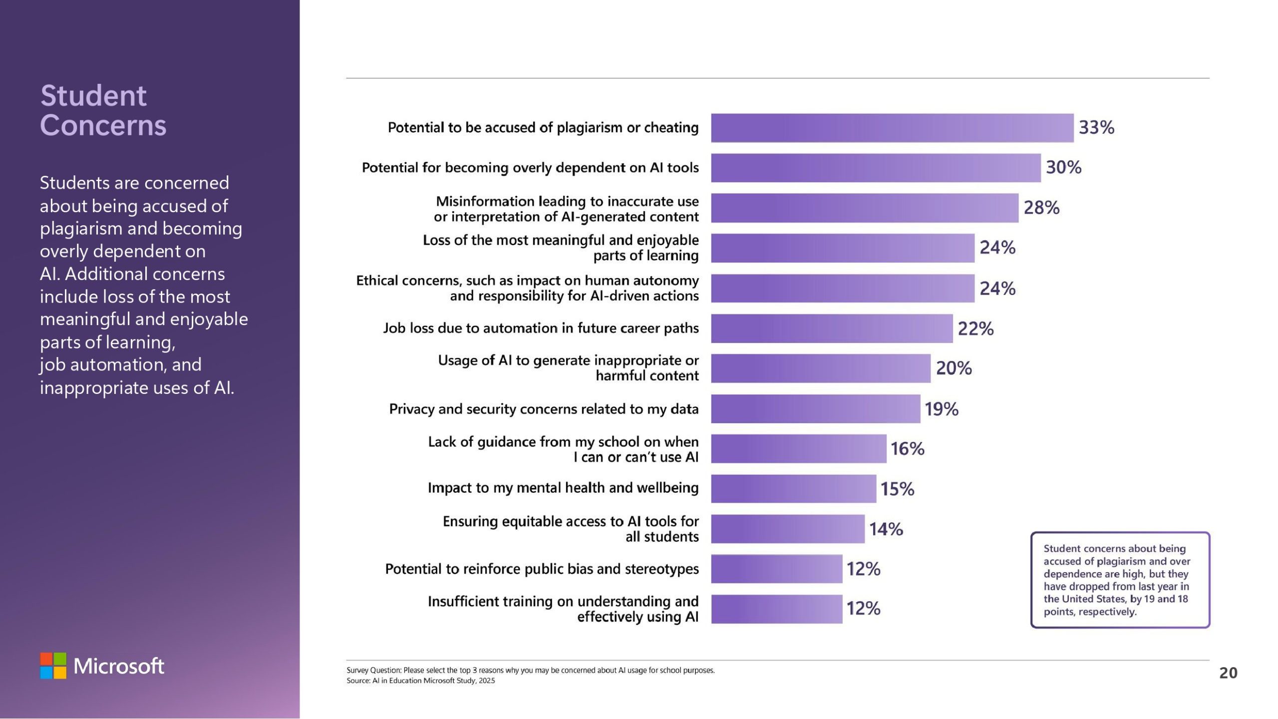 尽管各群体对 AI 的熟悉度和使用率都很高,但担忧仍然存在,诸如素养差距、对 AI 使用方式和时机的不同看法,以及缺乏培训等障碍凸显了支持的必要性。领导者、教育工作者和学生必须共同努力弥合分歧、同步学习并实时调整,这一点至关重要。