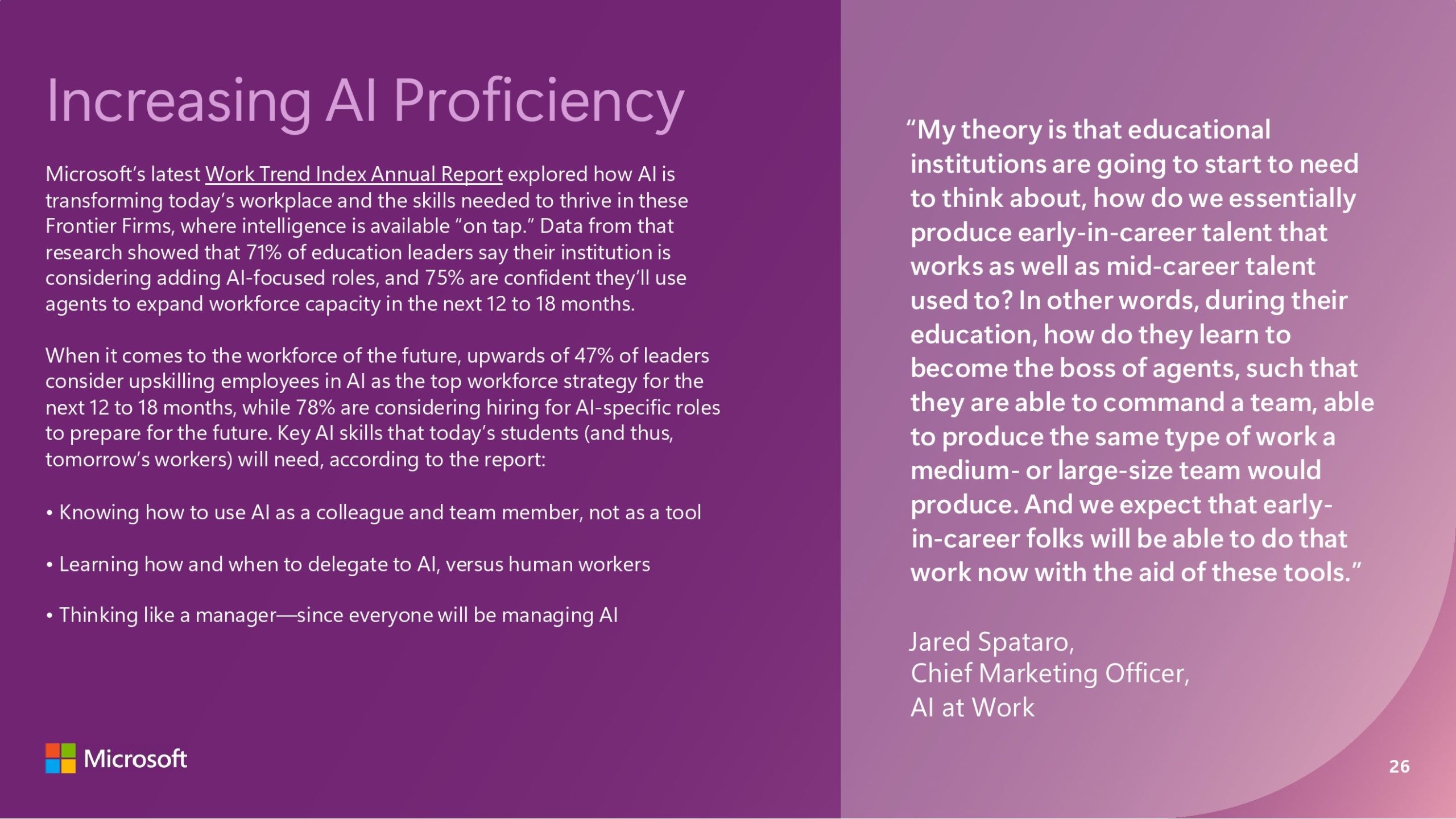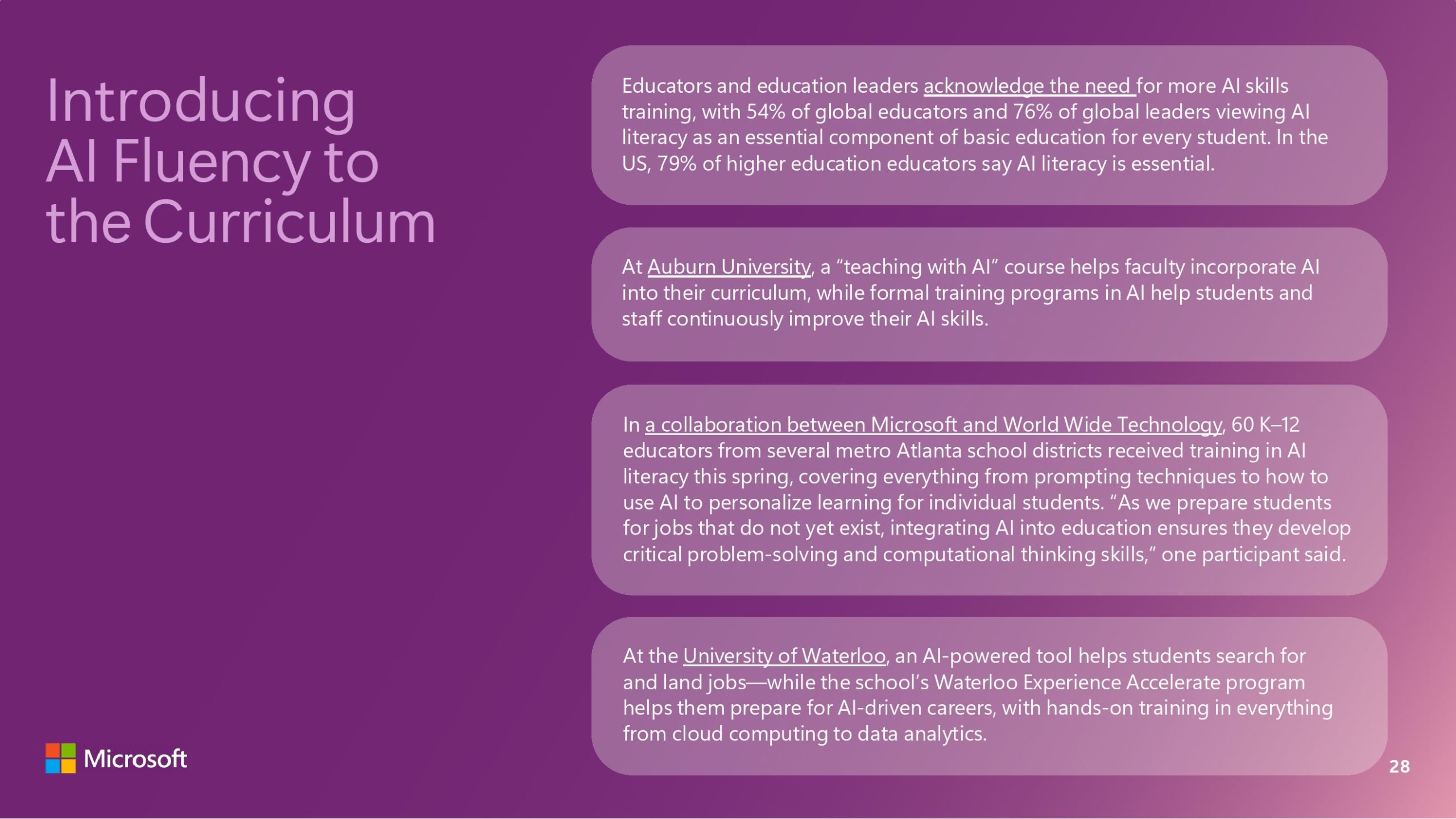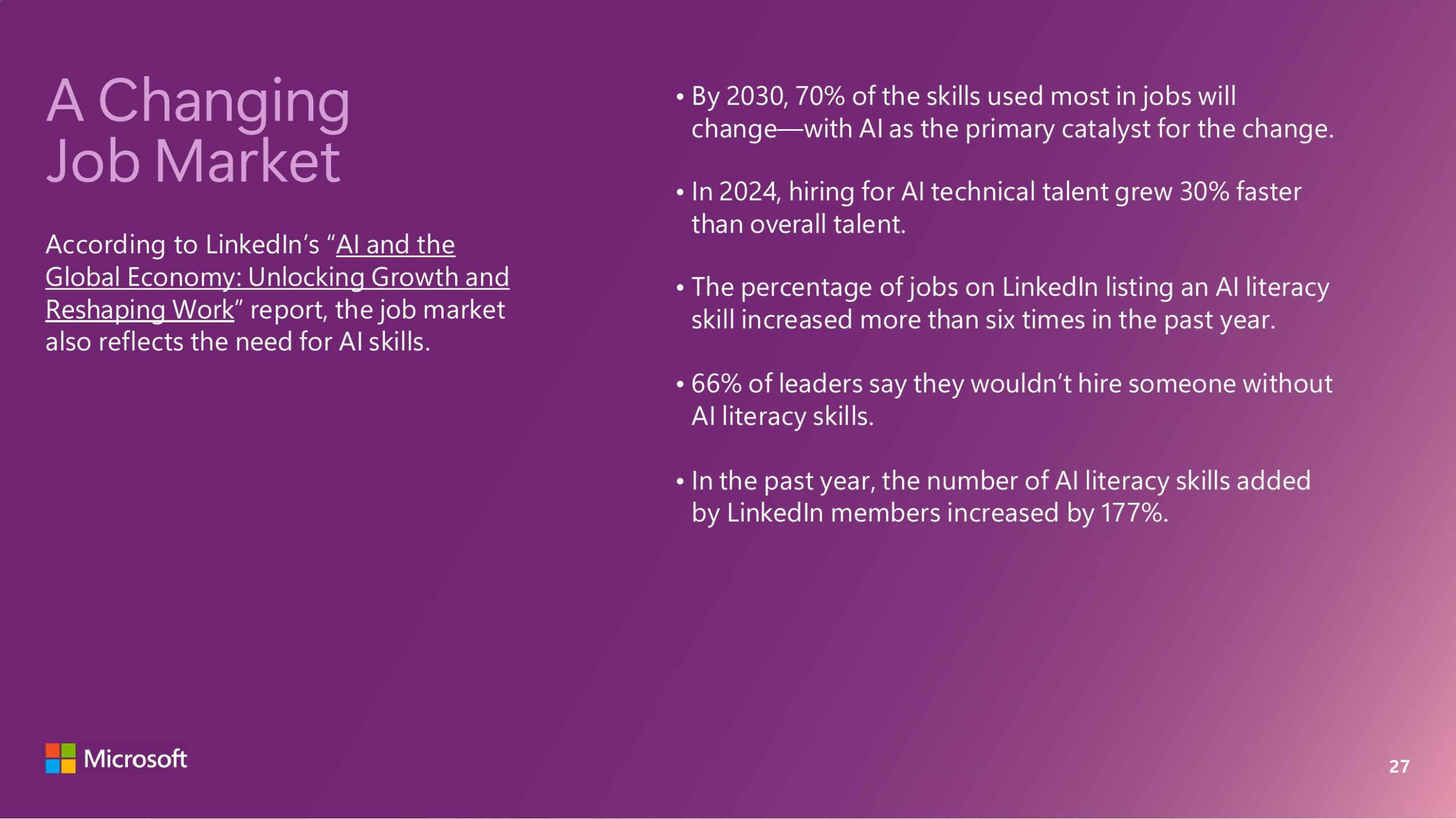 在美国,AI 熟练度是新员工最需要的技能——同时还包括冲突调解和适应性等更人性化的技能。这些技能的协同运用,对于即将进入新工作世界的学生来说至关重要。正如 LinkedIn 最近的“AI 与全球经济”报告所指出的:“为劳动力提供在 AI 未来中蓬勃发展所需的技能不仅是一个机会,更是一项紧迫任务。”