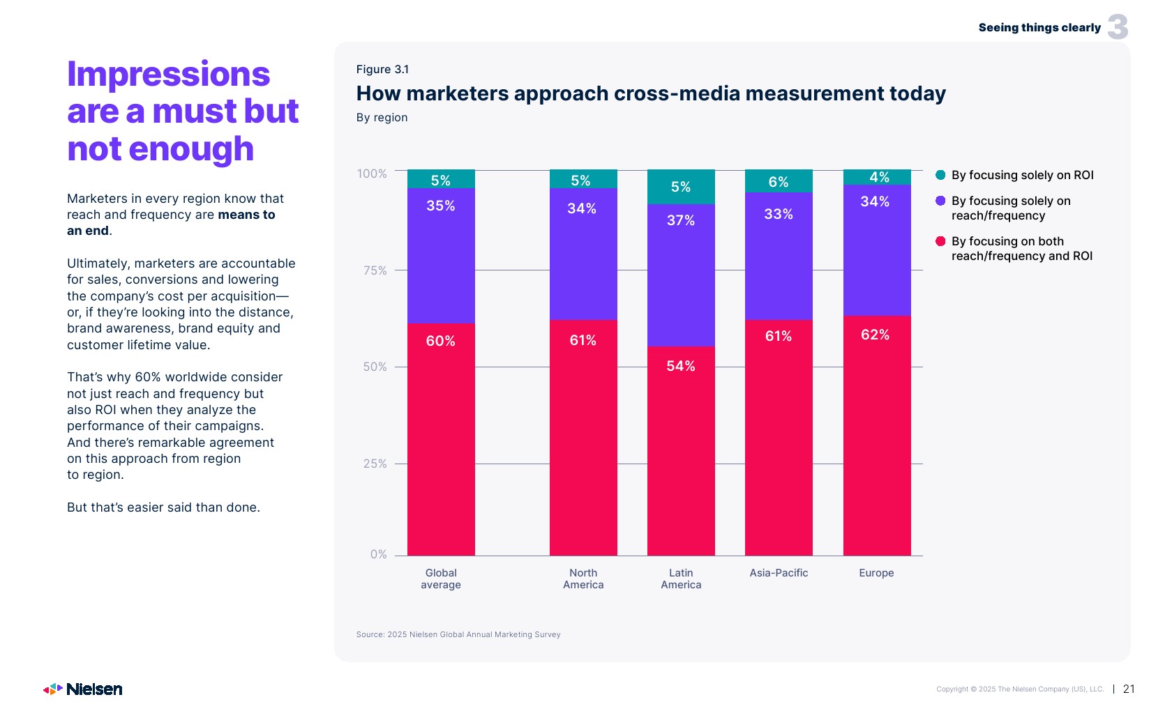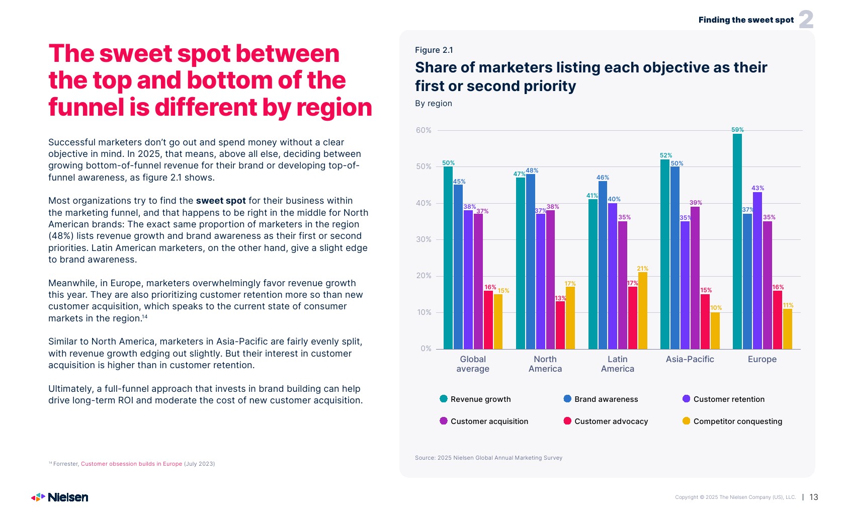 多数企业试图在营销漏斗中找到最适合自身业务的平衡点。北美品牌恰好处于中间位置:该地区48%的营销人员将收入增长和品牌认知同时列为首要或次要目标。而拉美营销人员则更侧重品牌认知建设。