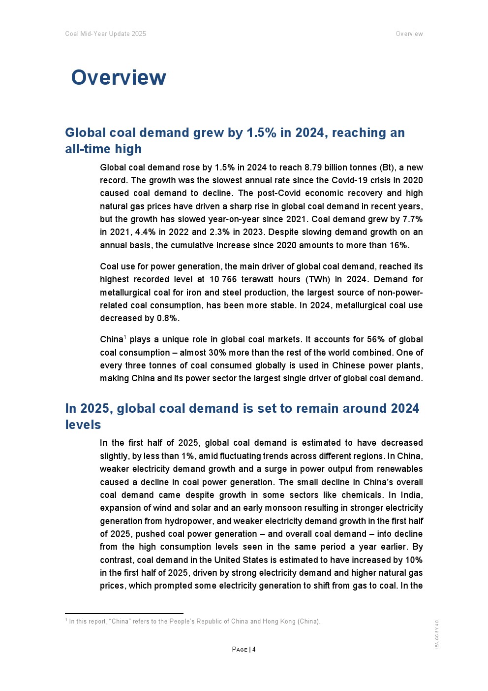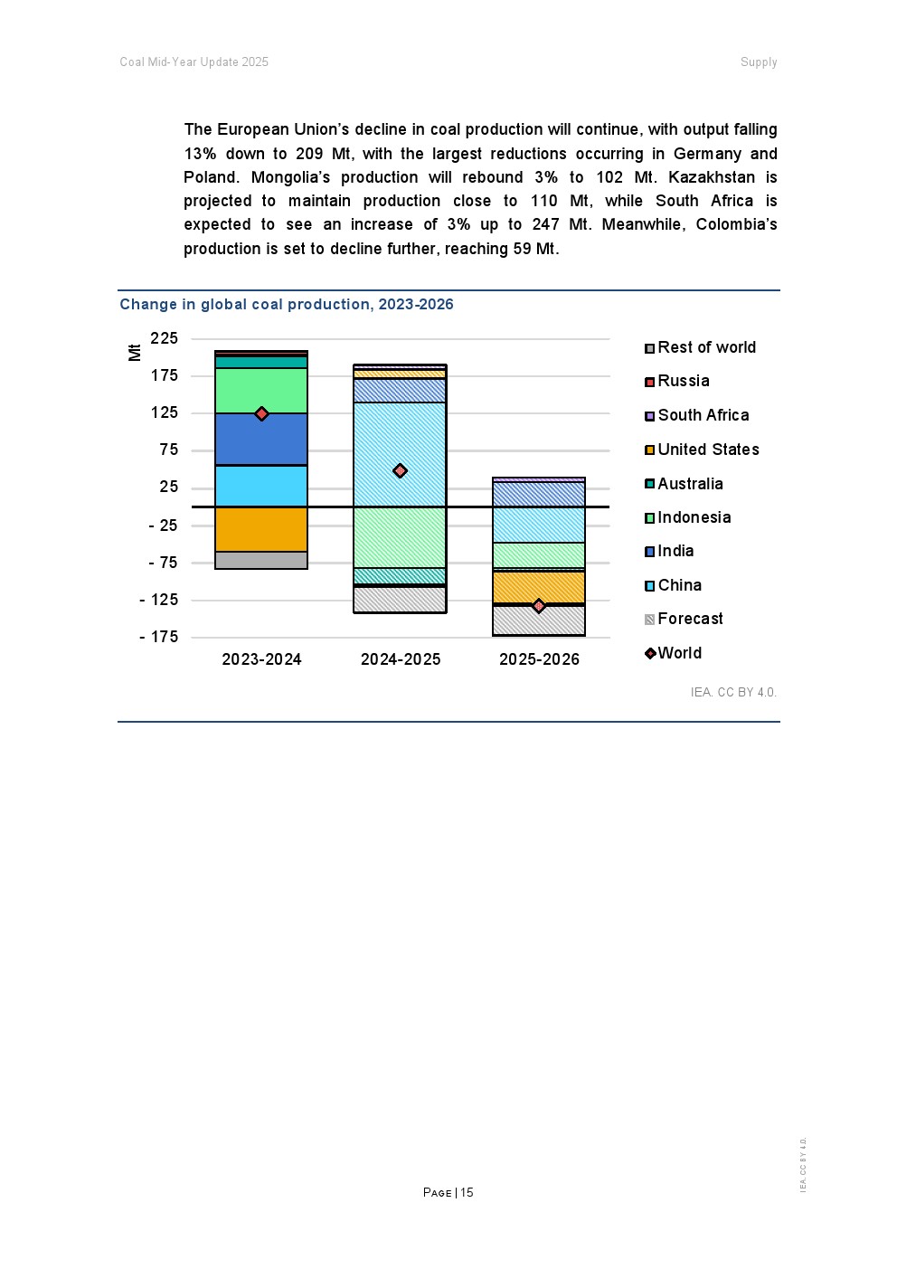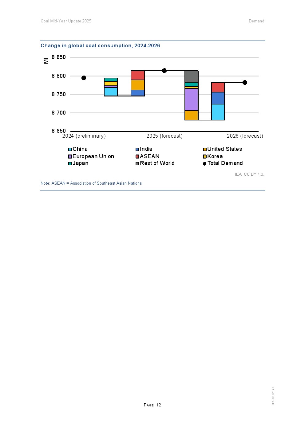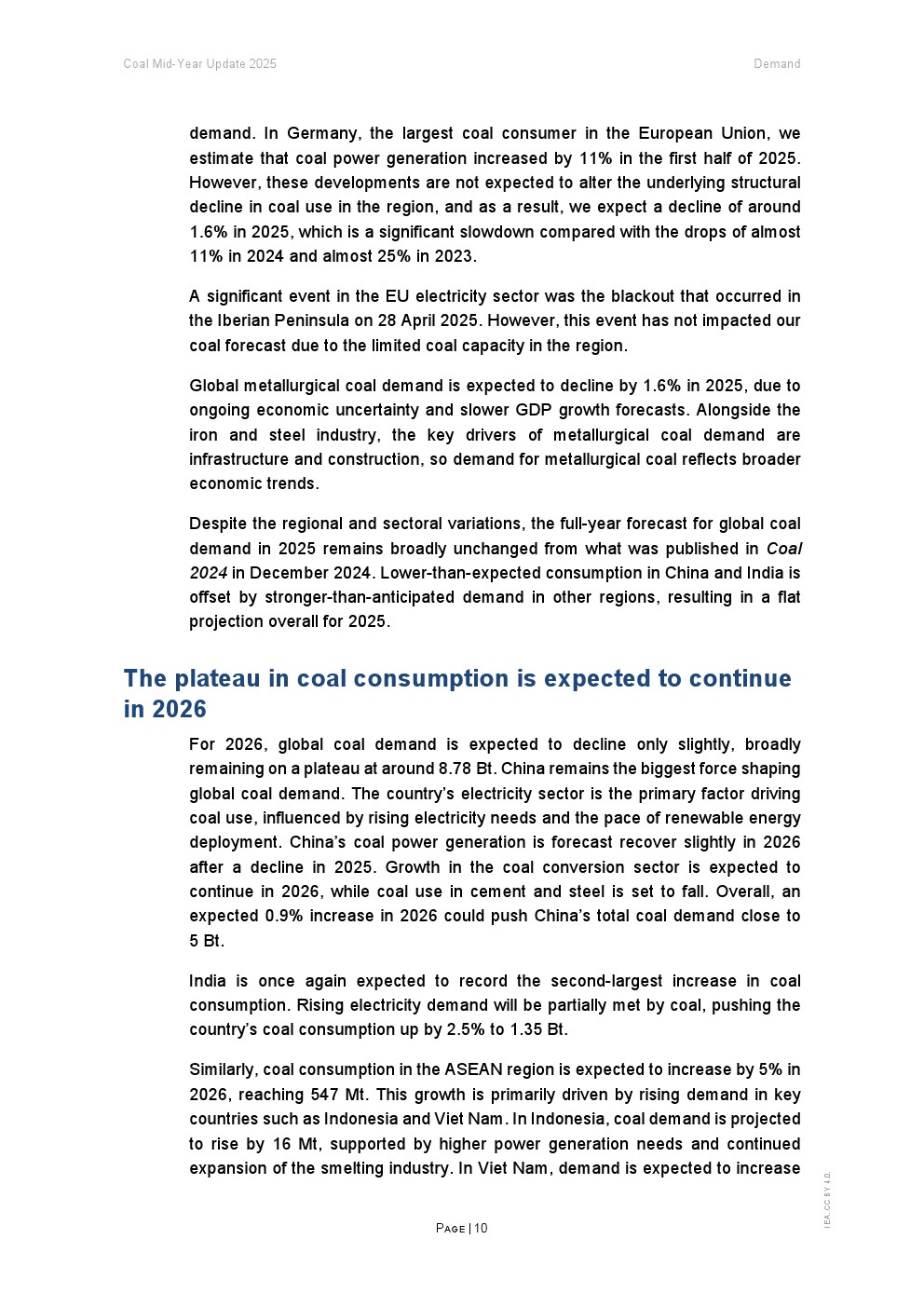 从区域看,中国占全球煤炭消费的56%,其电力部门单独消耗了全球约三分之一的煤炭。2025年上半年,受可再生能源快速增长和用电需求放缓影响,中国煤电发电量同比下降约3%,全年煤炭需求预计小幅下降0.5%,但2026年或将再次接近50亿吨水平。