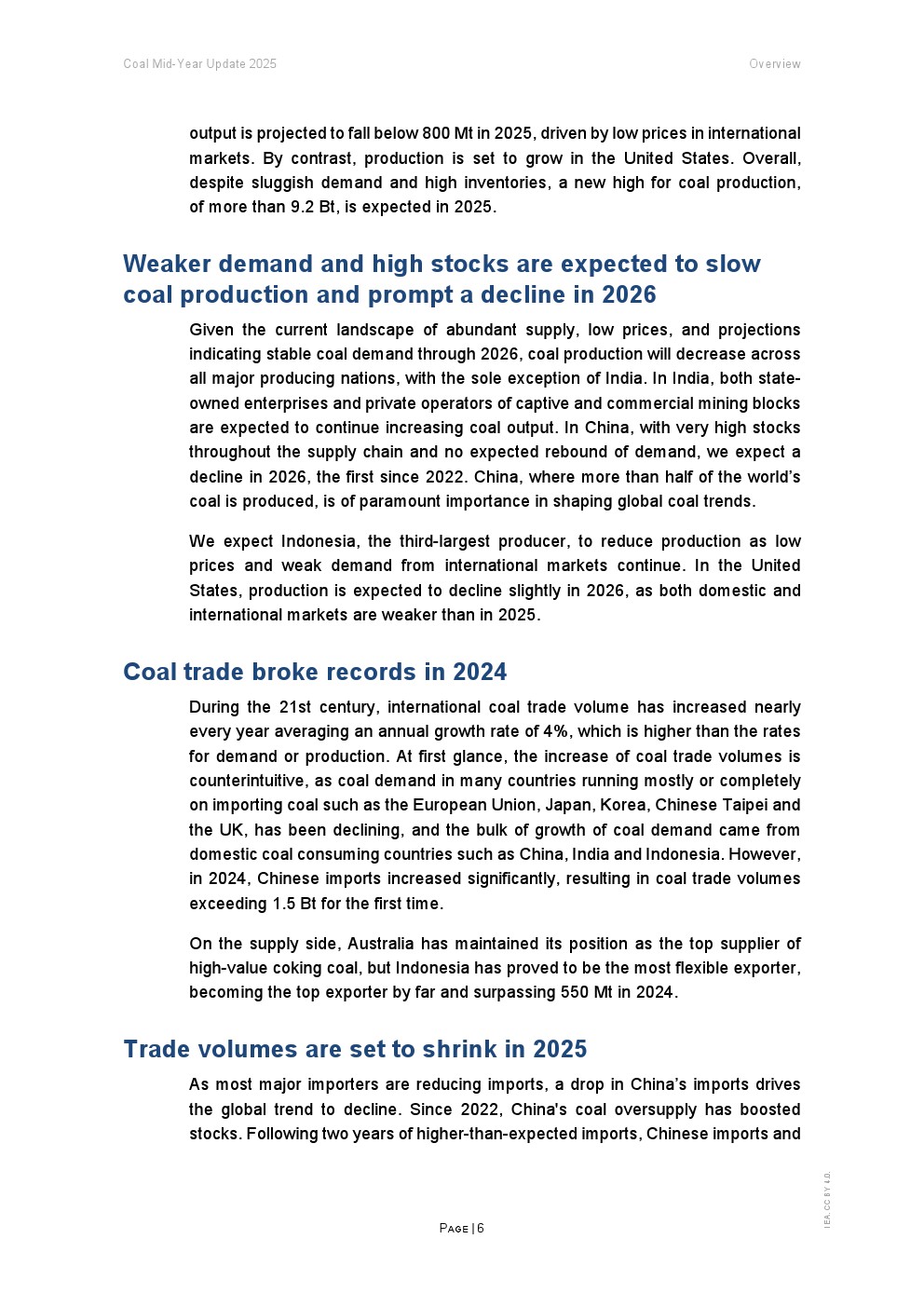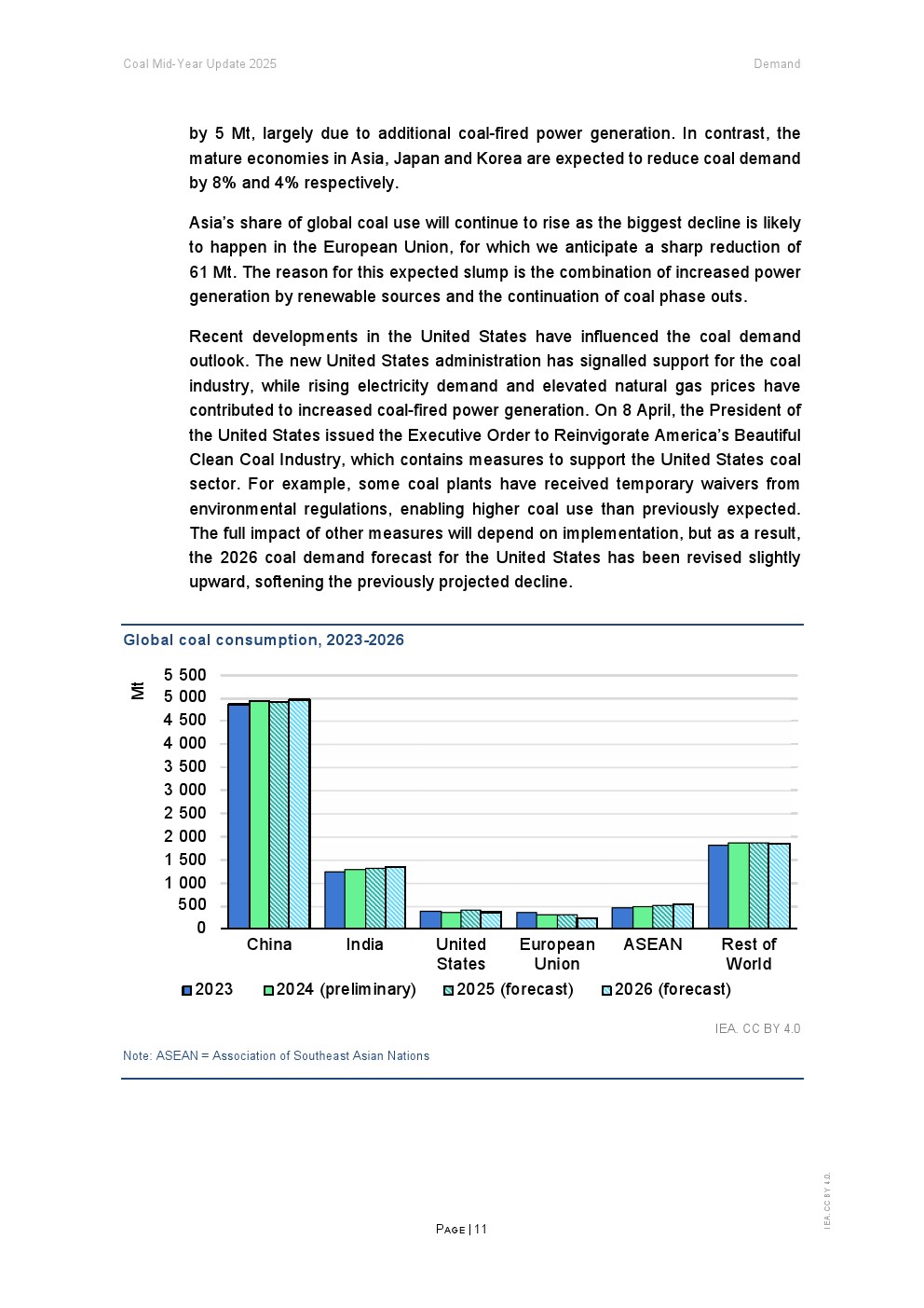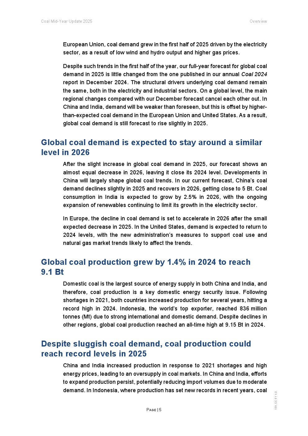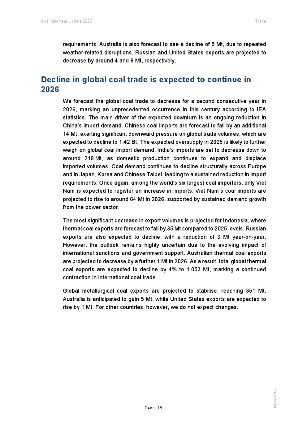 从区域看,中国占全球煤炭消费的56%,其电力部门单独消耗了全球约三分之一的煤炭。2025年上半年,受可再生能源快速增长和用电需求放缓影响,中国煤电发电量同比下降约3%,全年煤炭需求预计小幅下降0.5%,但2026年或将再次接近50亿吨水平。