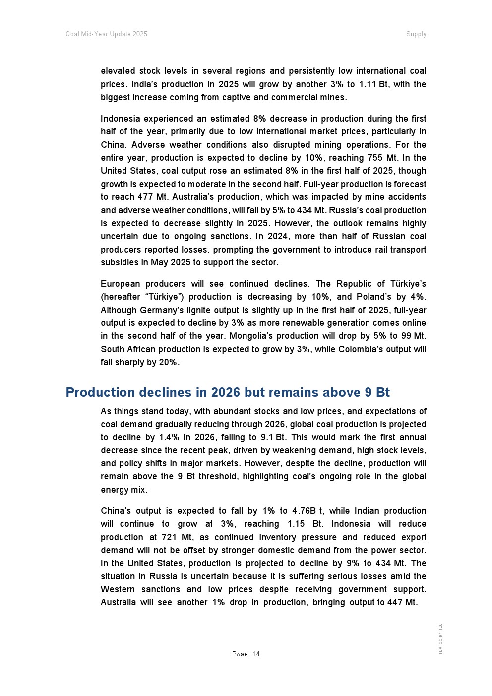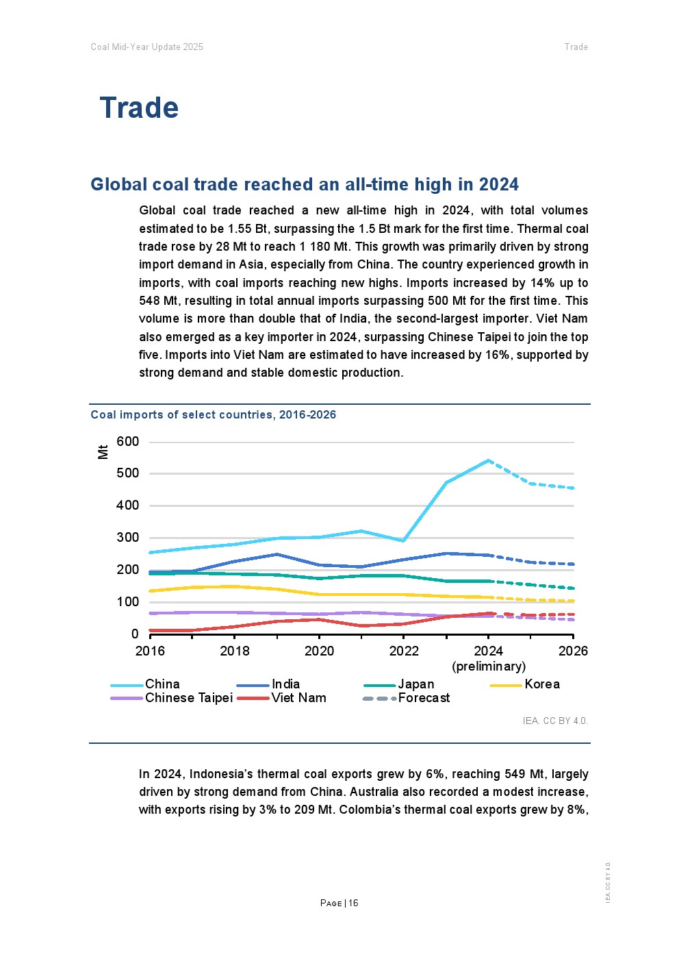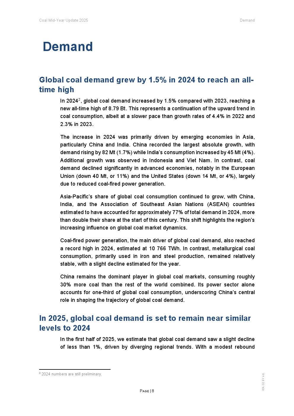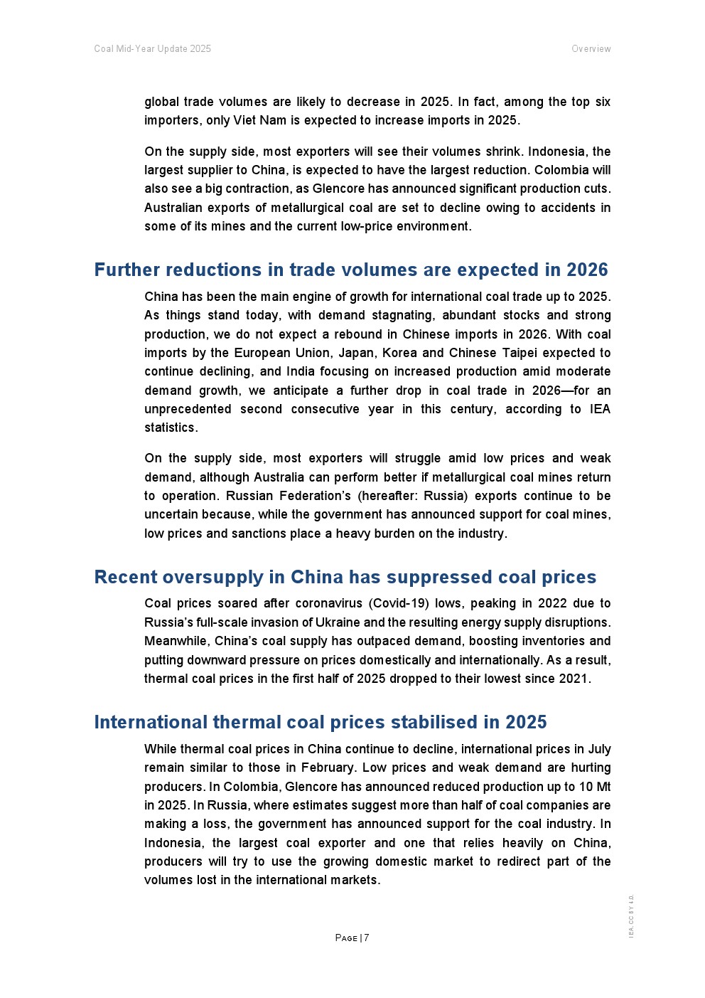 从区域看,中国占全球煤炭消费的56%,其电力部门单独消耗了全球约三分之一的煤炭。2025年上半年,受可再生能源快速增长和用电需求放缓影响,中国煤电发电量同比下降约3%,全年煤炭需求预计小幅下降0.5%,但2026年或将再次接近50亿吨水平。