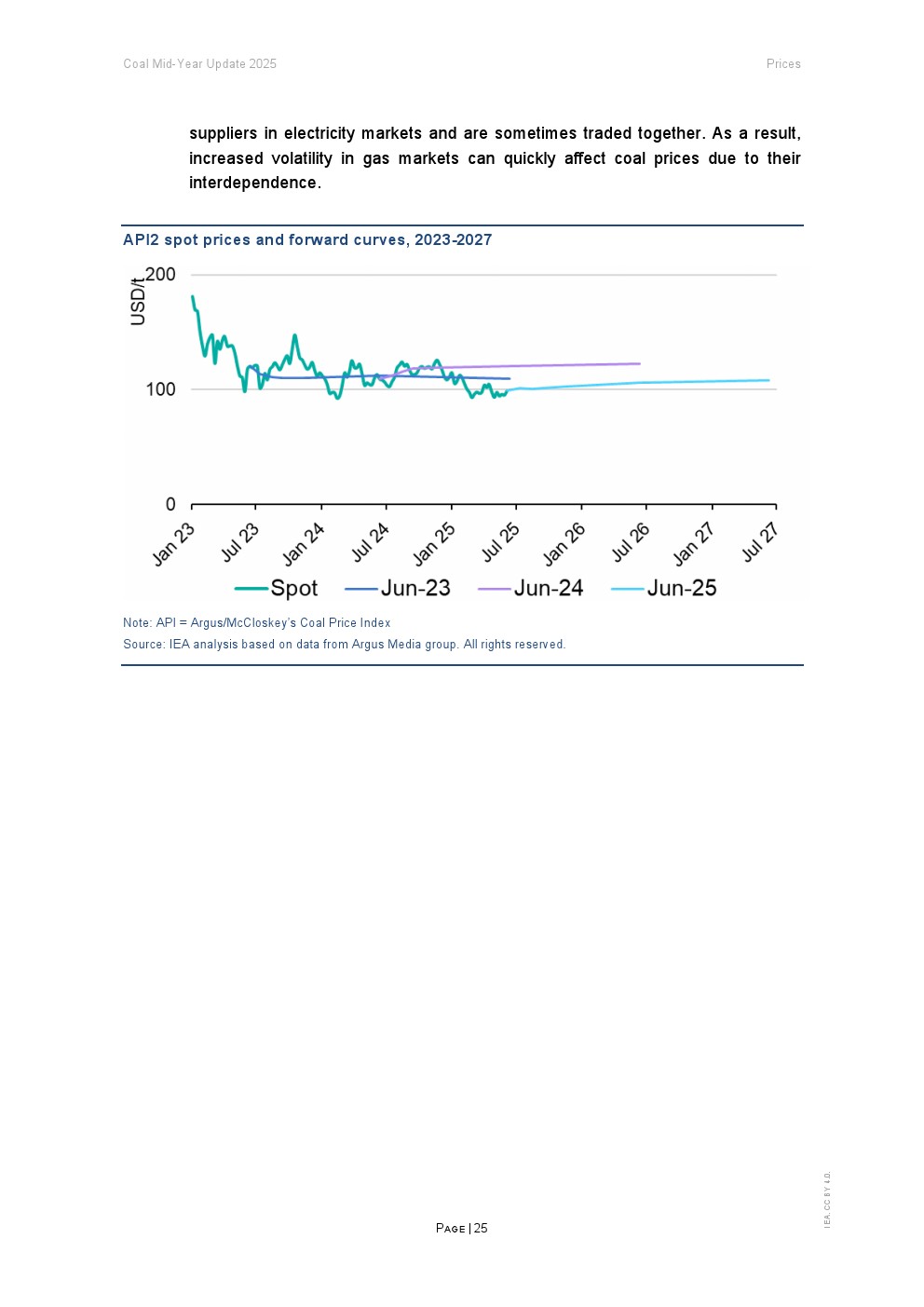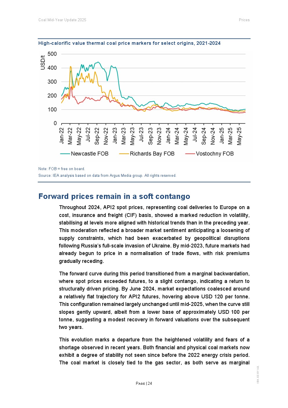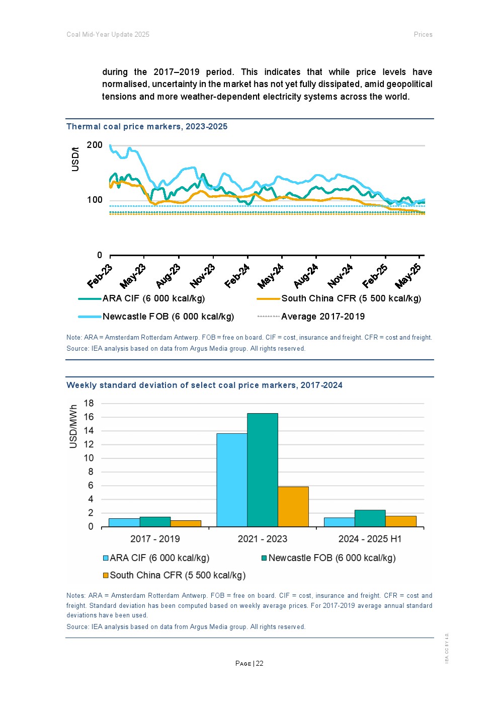 价格层面,2025年上半年国际动力煤价格已跌至2021年以来最低水平。中国和印度的高库存对价格形成持续压制,纽卡斯尔和ARA基准价接近每吨100美元。价格虽已显著回落,但波动率仍高于2017至2019年平均水平,显示市场不确定性尚未完全消散。