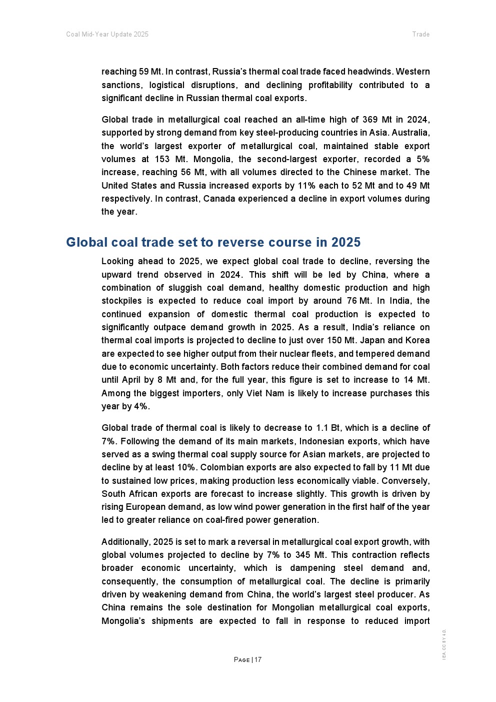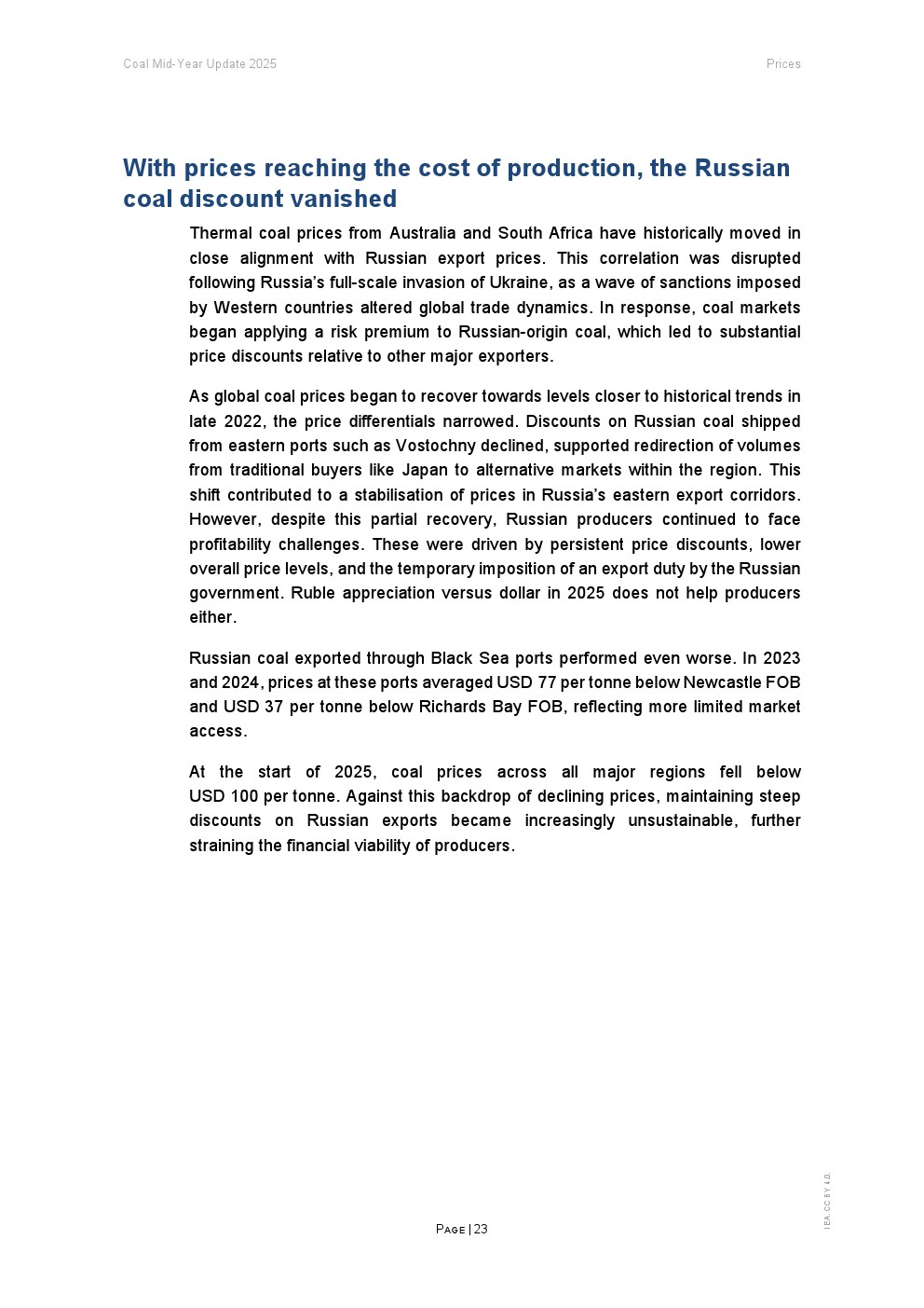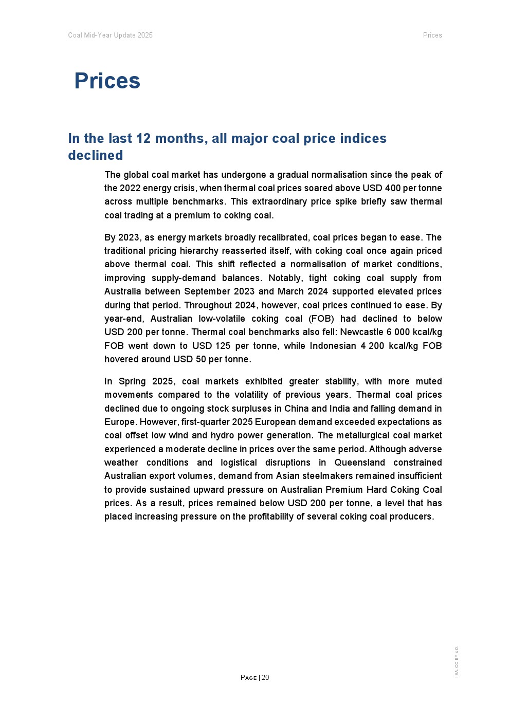 价格层面,2025年上半年国际动力煤价格已跌至2021年以来最低水平。中国和印度的高库存对价格形成持续压制,纽卡斯尔和ARA基准价接近每吨100美元。价格虽已显著回落,但波动率仍高于2017至2019年平均水平,显示市场不确定性尚未完全消散。