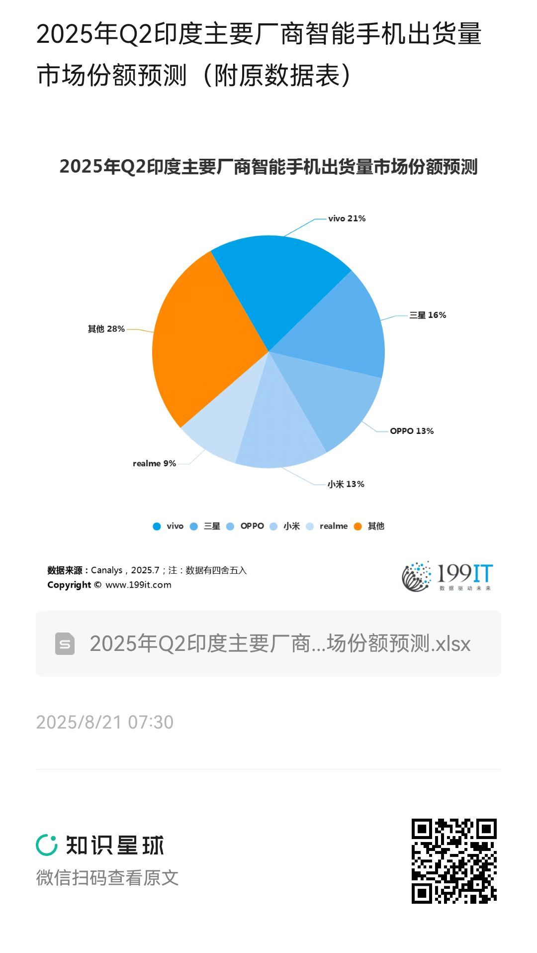 - 2025年Q2全球主要厂商智能手机出货量市场份额(附原数据表)