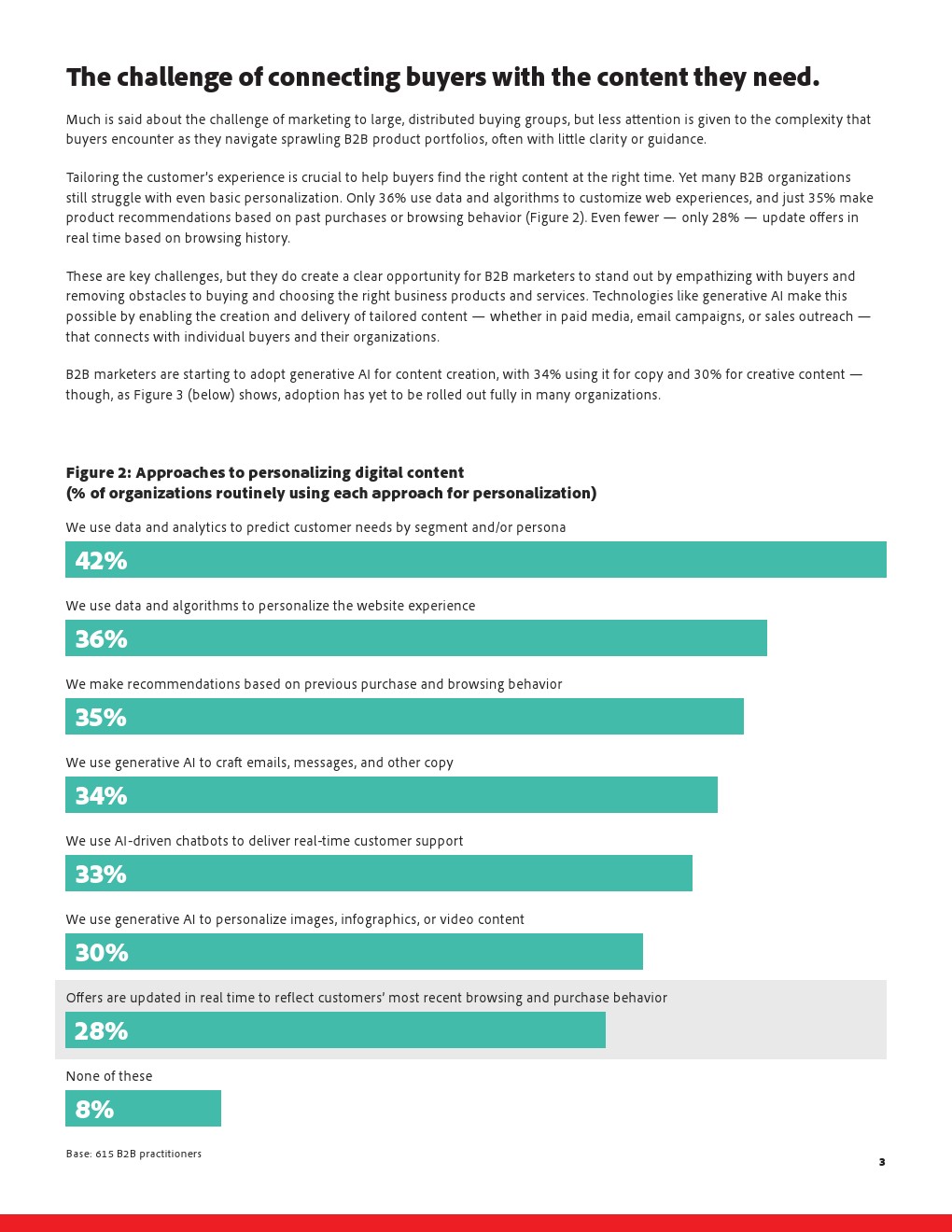 在内容同质化背景下,个性化能力成为B2B组织的短板。仅36%的企业使用数据和算法来定制网站体验,基于历史行为进行产品推荐的比例为35%,能够实时更新内容和报价的企业仅占28%。这意味着多数B2B买家仍需在复杂产品组合中自行筛选信息,增加了决策成本,也拉长了销售周期。