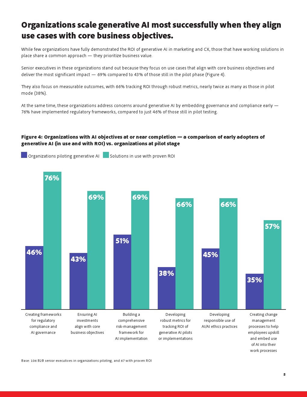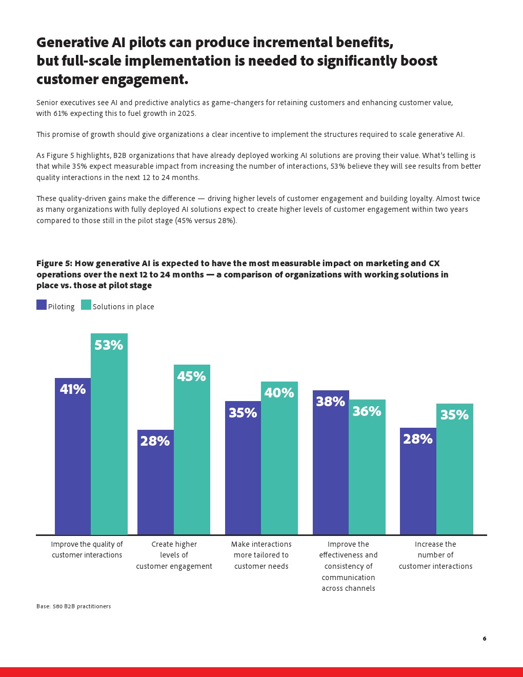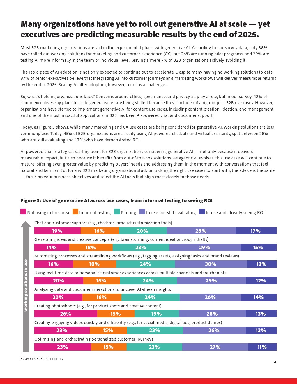 生成式AI正在被视为破解上述困境的关键工具,但其应用仍停留在初级阶段。当前仅38%的B2B组织已经在营销或客户体验中部署可运行的AI解决方案,26%仍处于试点阶段,29%仅在团队层面进行零散测试。然而,高达87%的高管相信,在2025年底前,AI嵌入客户旅程将带来可量化回报,预期与现实之间存在明显时间差。