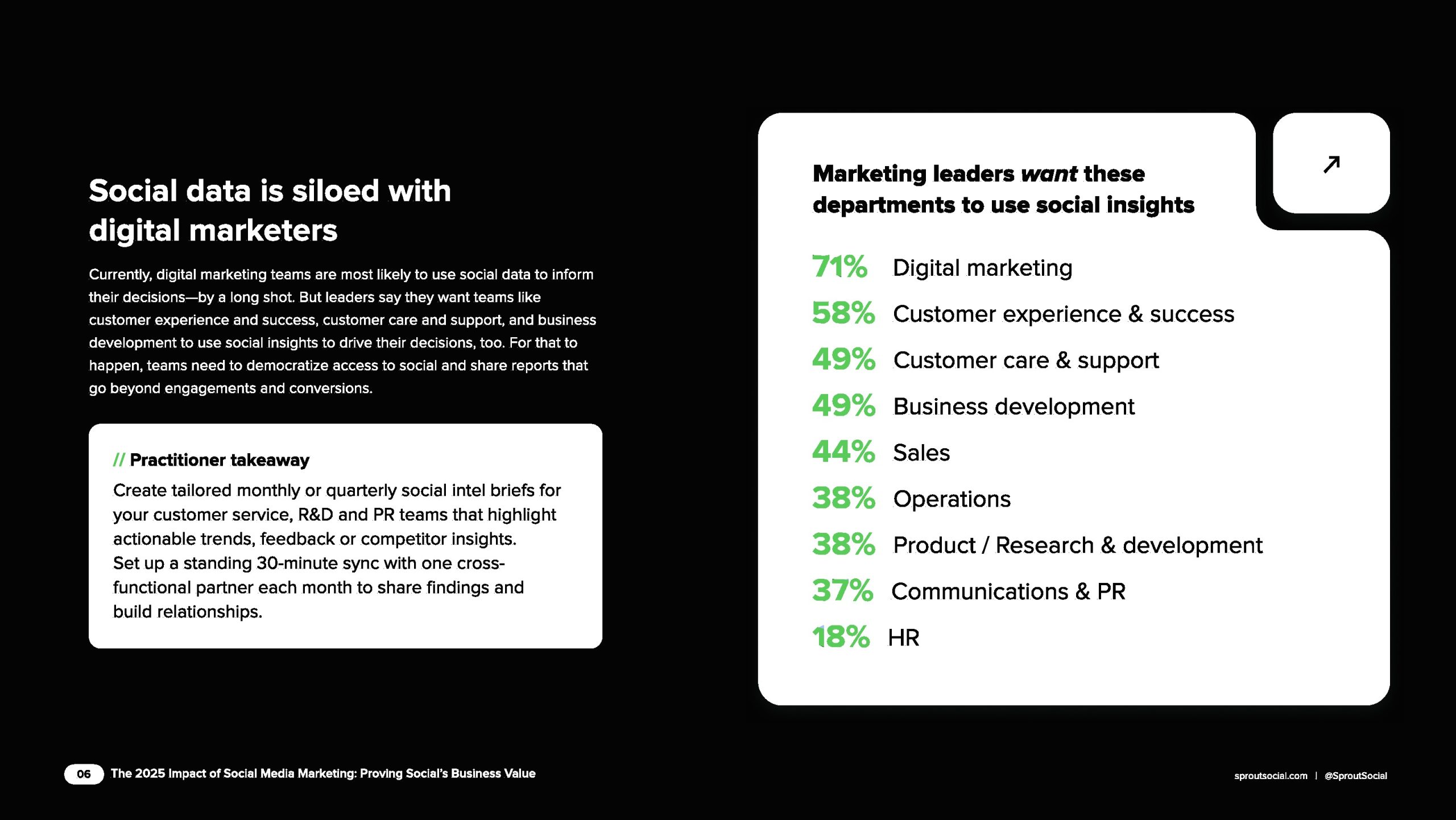 数据孤岛问题进一步放大了这一矛盾。报告显示,71%的社交数据仍主要服务于数字营销团队,而客户体验、客服支持、业务拓展等部门的使用比例均低于50%。更关键的是,只有不到一半的企业将社交数据系统性接入CRM体系,这直接限制了多触点归因模型的构建能力,也削弱了社交媒体对收入与管道贡献的可视化程度。