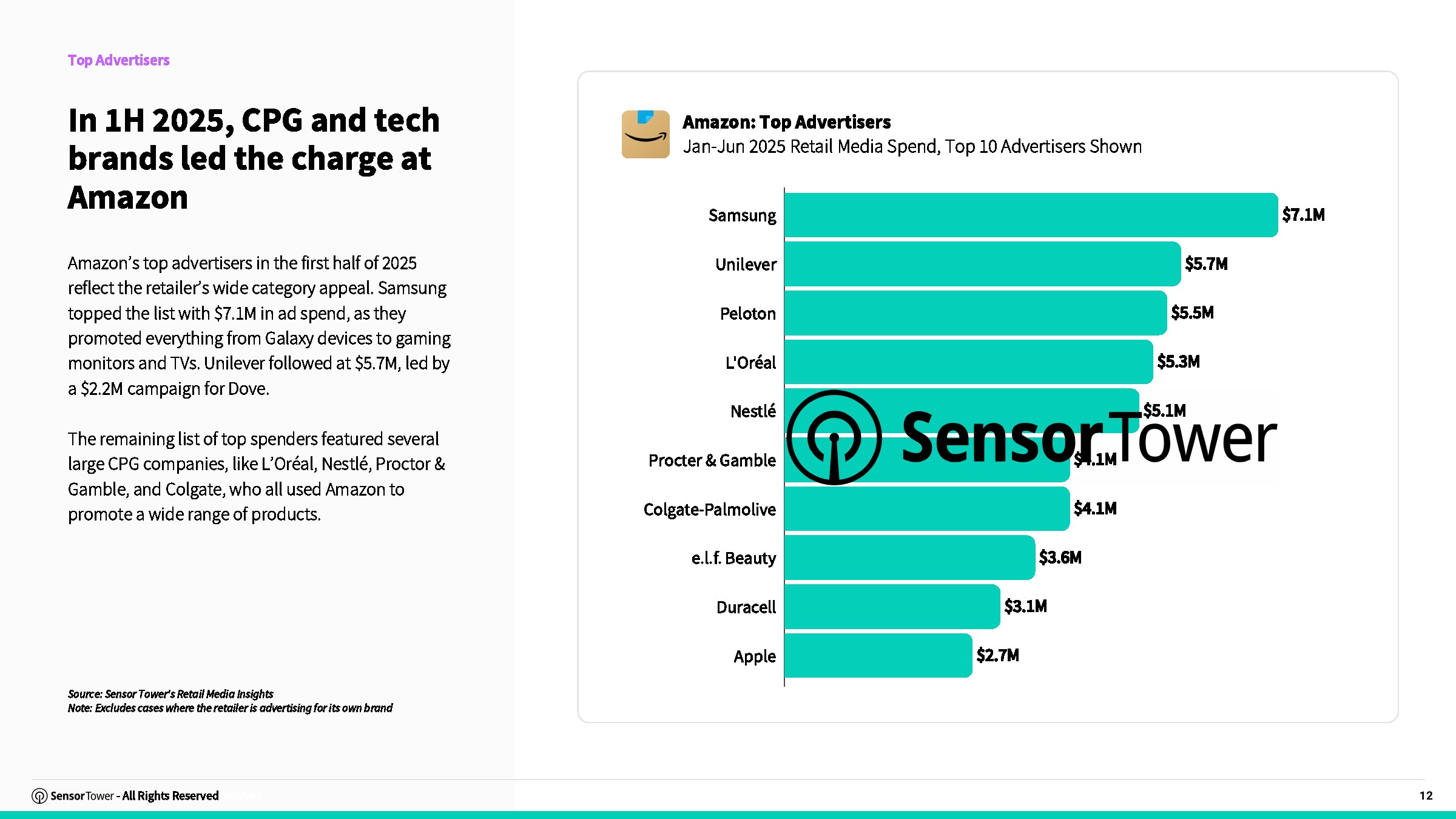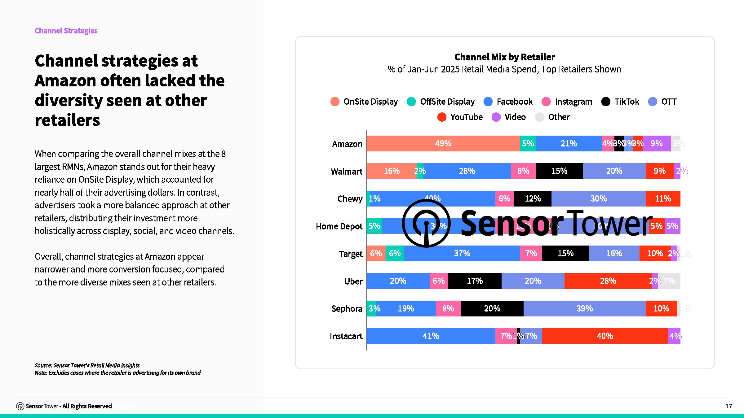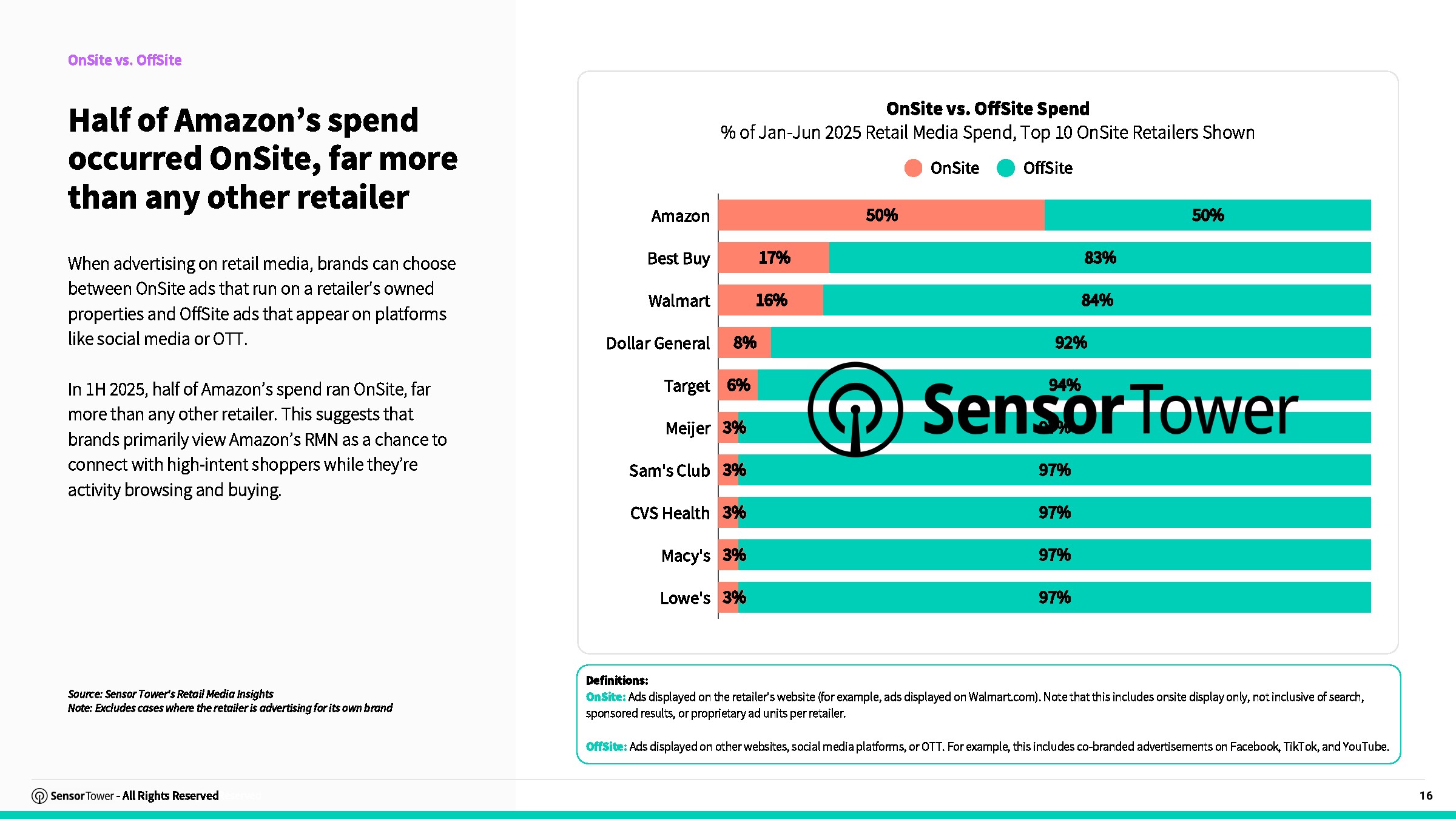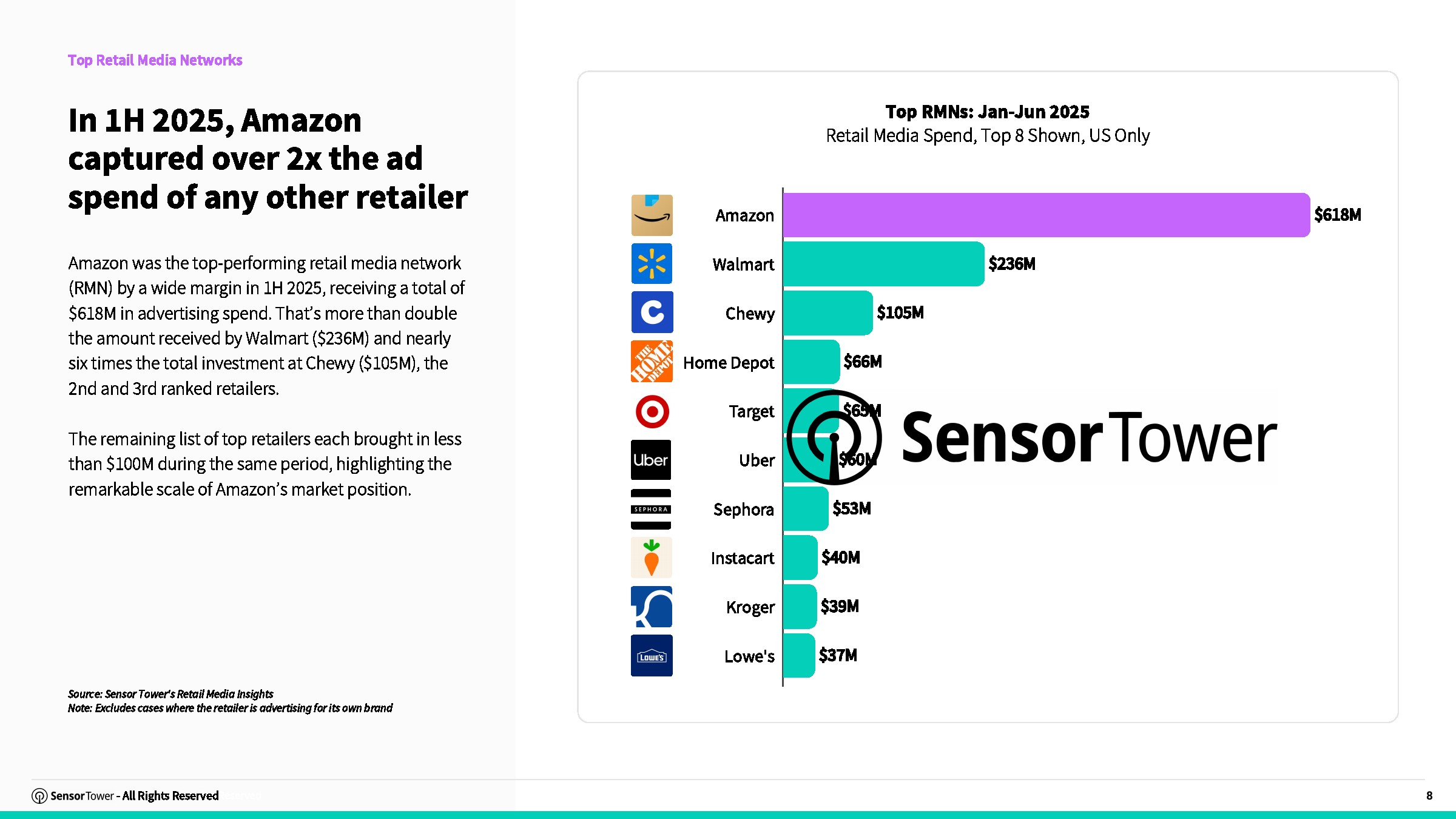 2025年上半年,亚马逊半数支出用于站内广告——远超其他零售商。这表明品牌将亚马逊RMN视为连接高意向购物者的机会,尤其是在用户主动浏览和购买期间。