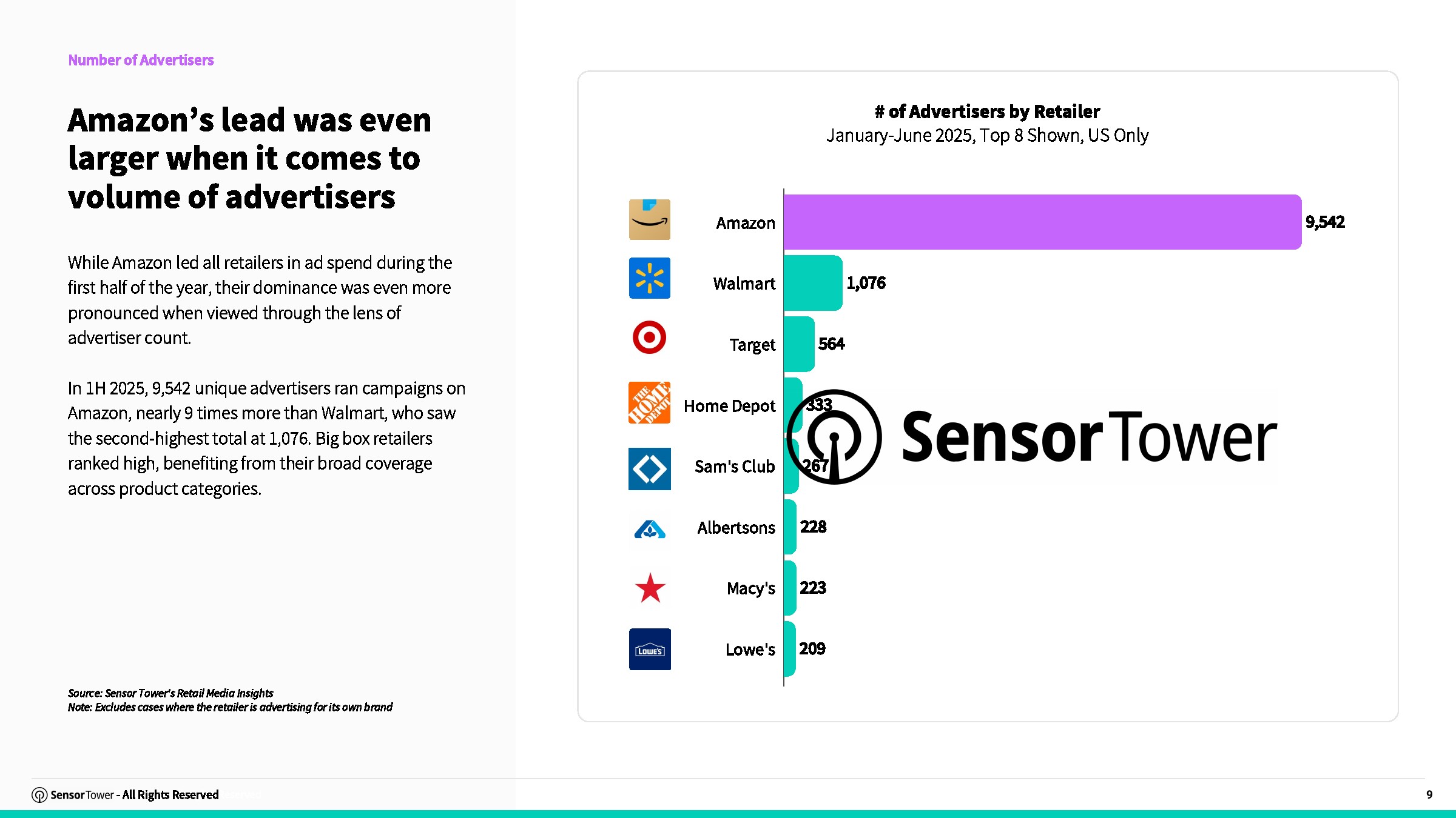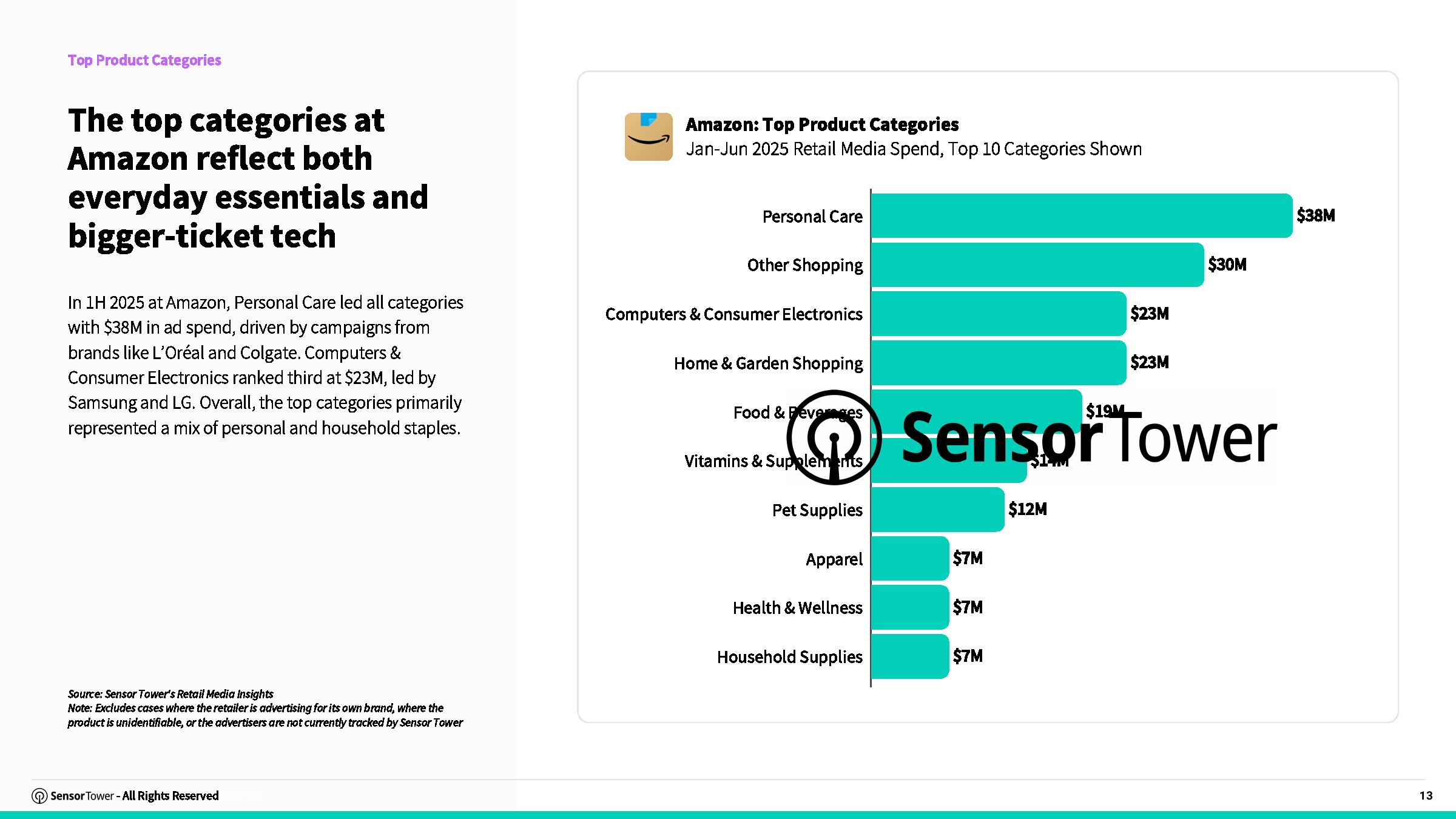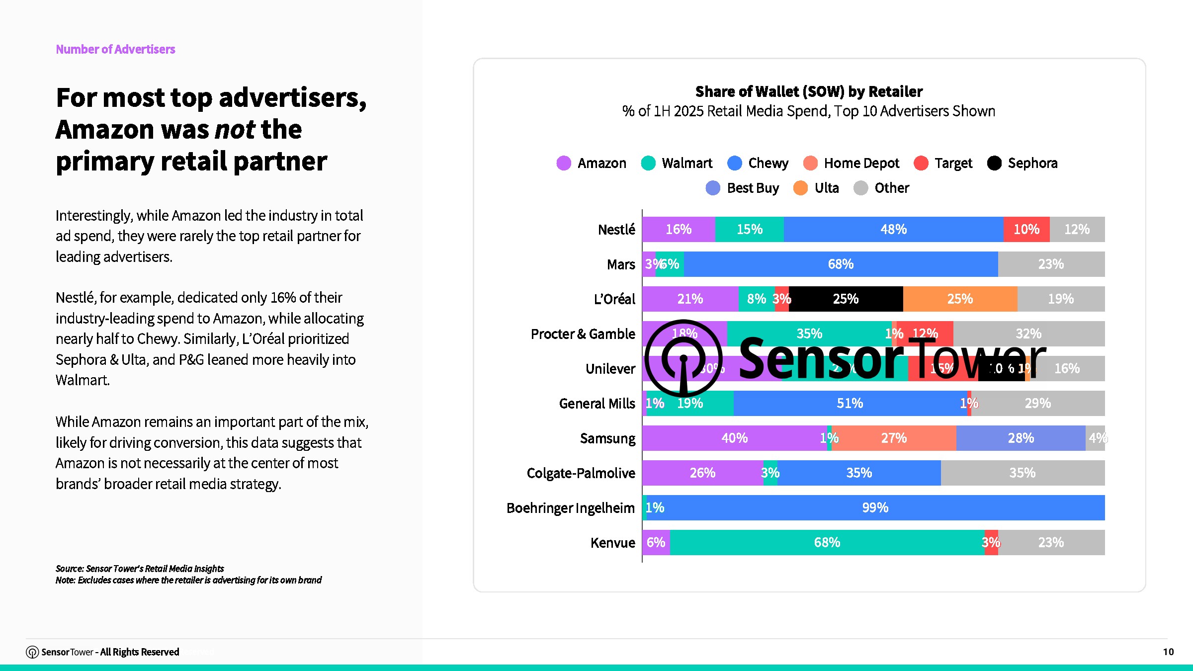 2025年上半年,亚马逊半数支出用于站内广告——远超其他零售商。这表明品牌将亚马逊RMN视为连接高意向购物者的机会,尤其是在用户主动浏览和购买期间。