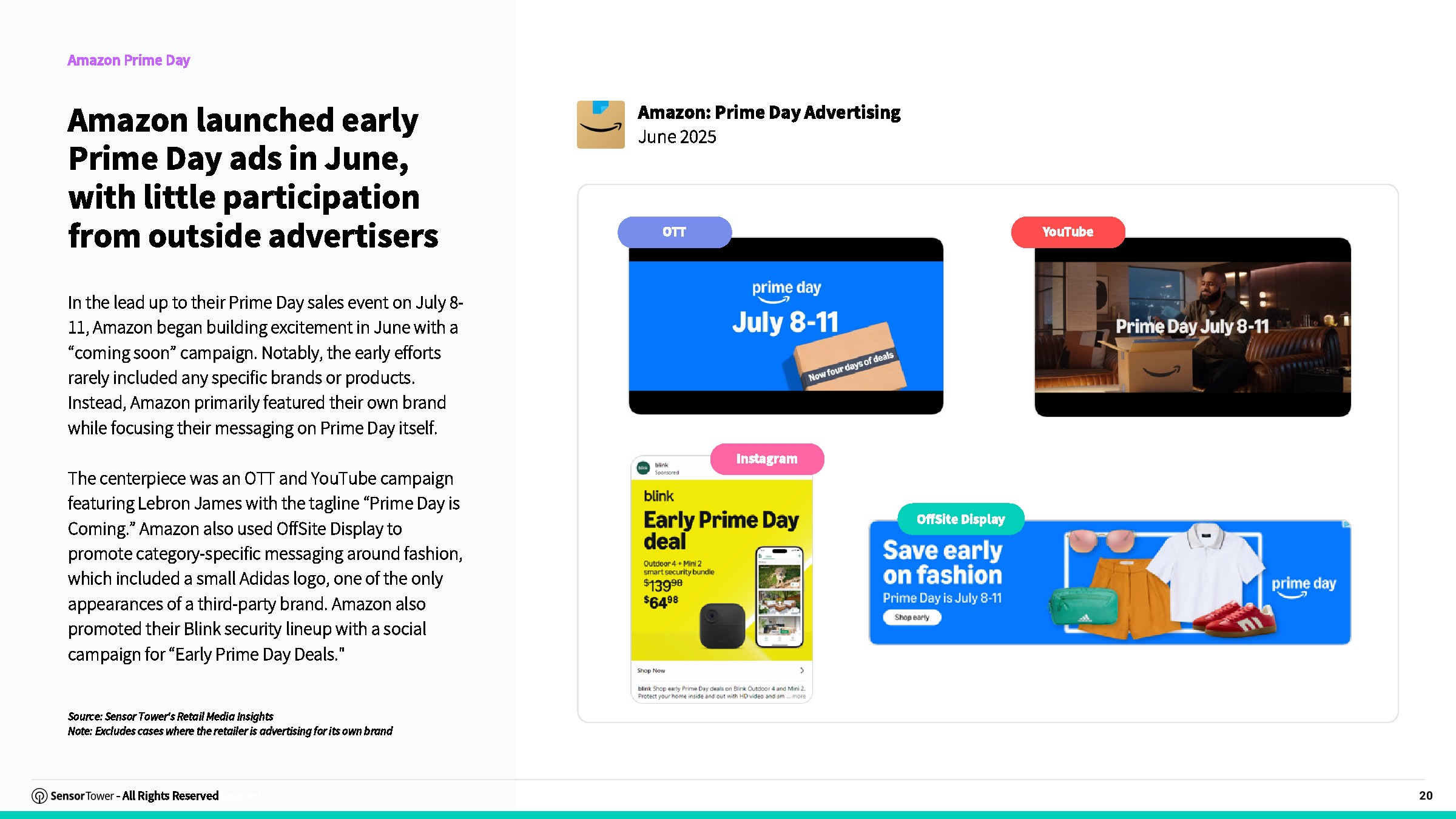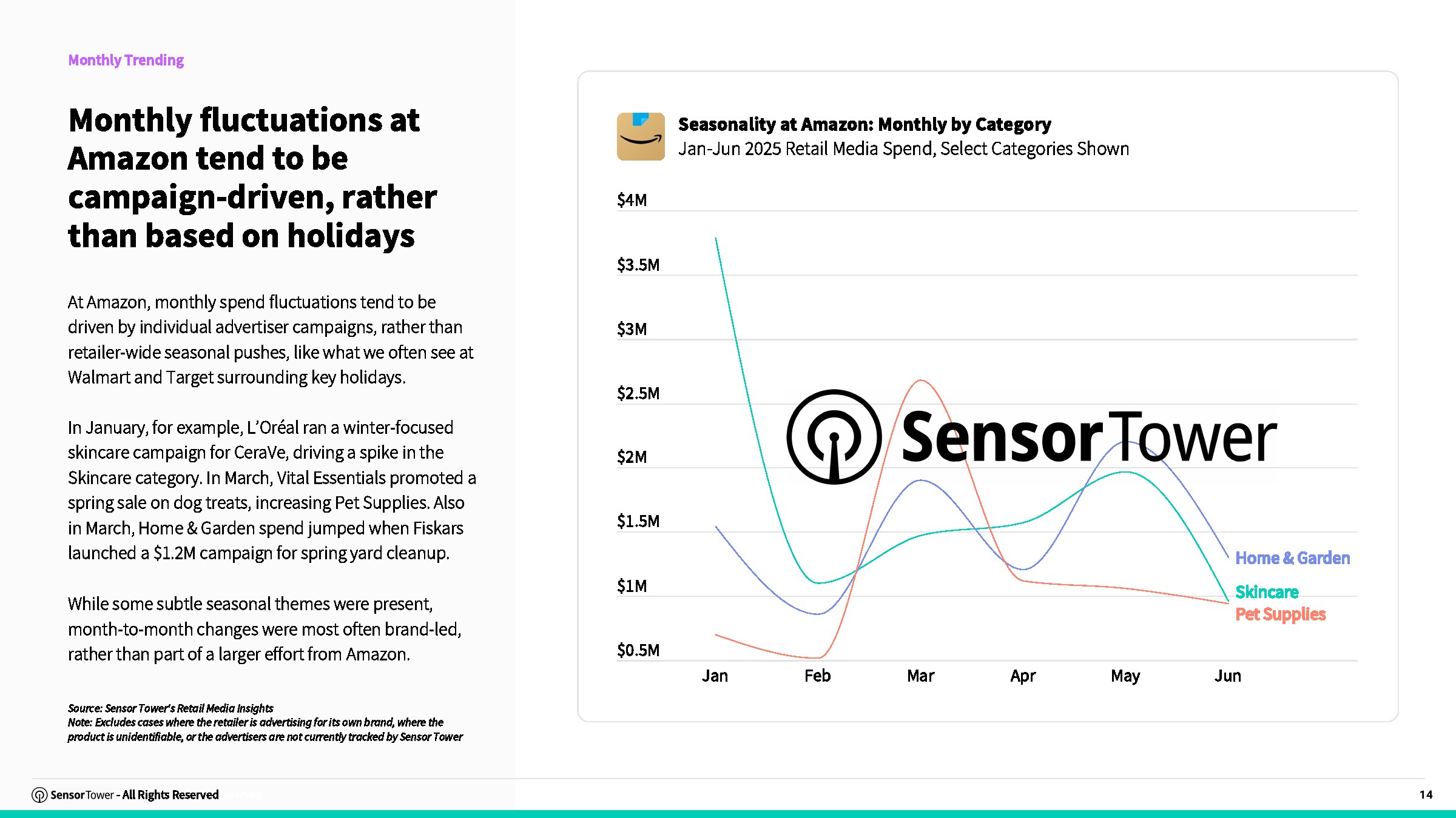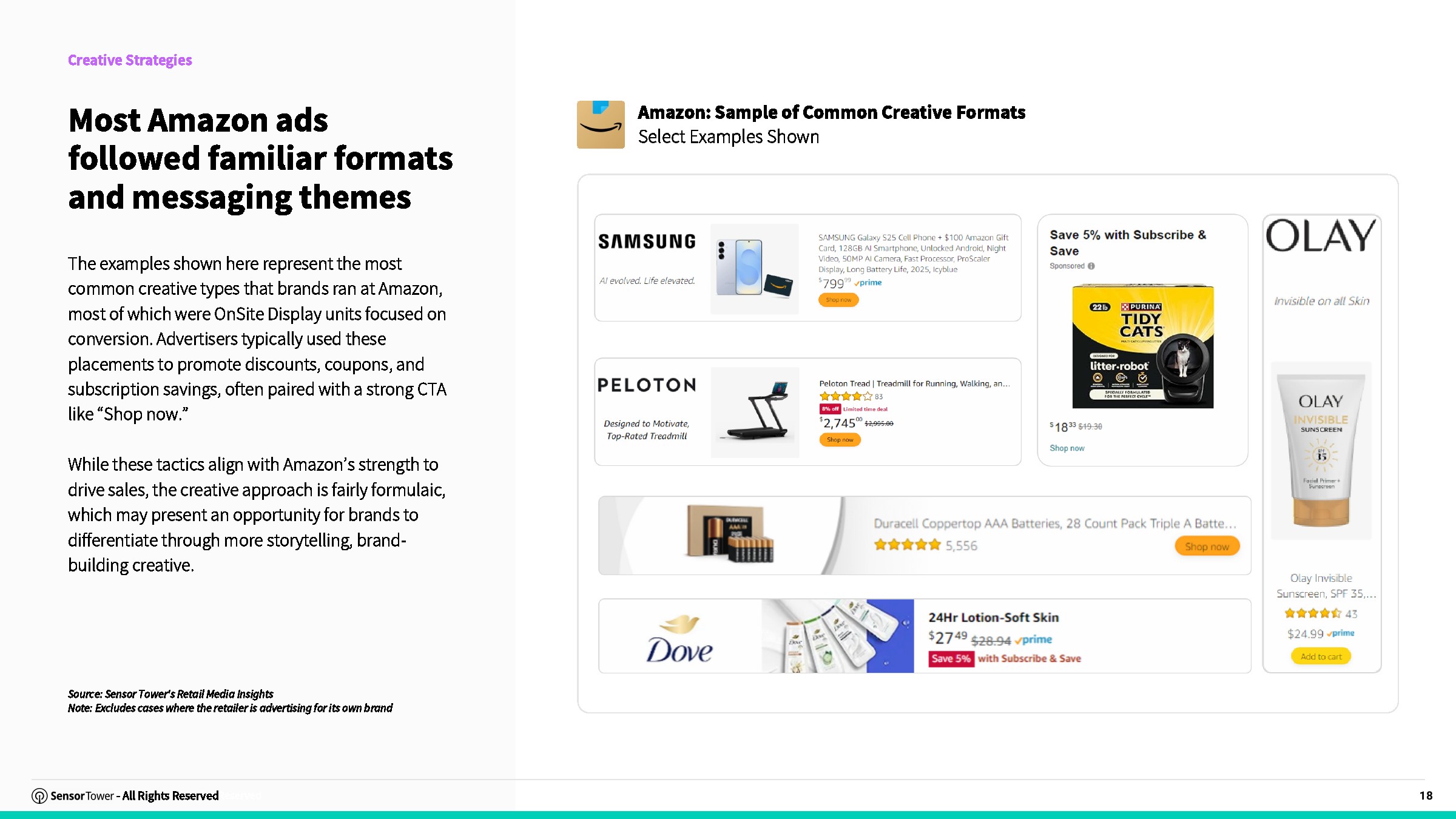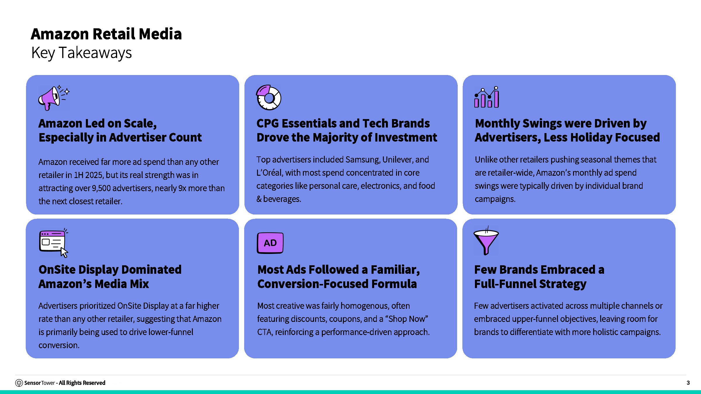 2025年上半年,亚马逊半数支出用于站内广告——远超其他零售商。这表明品牌将亚马逊RMN视为连接高意向购物者的机会,尤其是在用户主动浏览和购买期间。