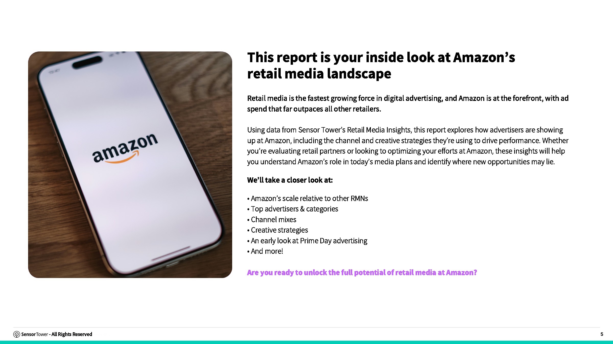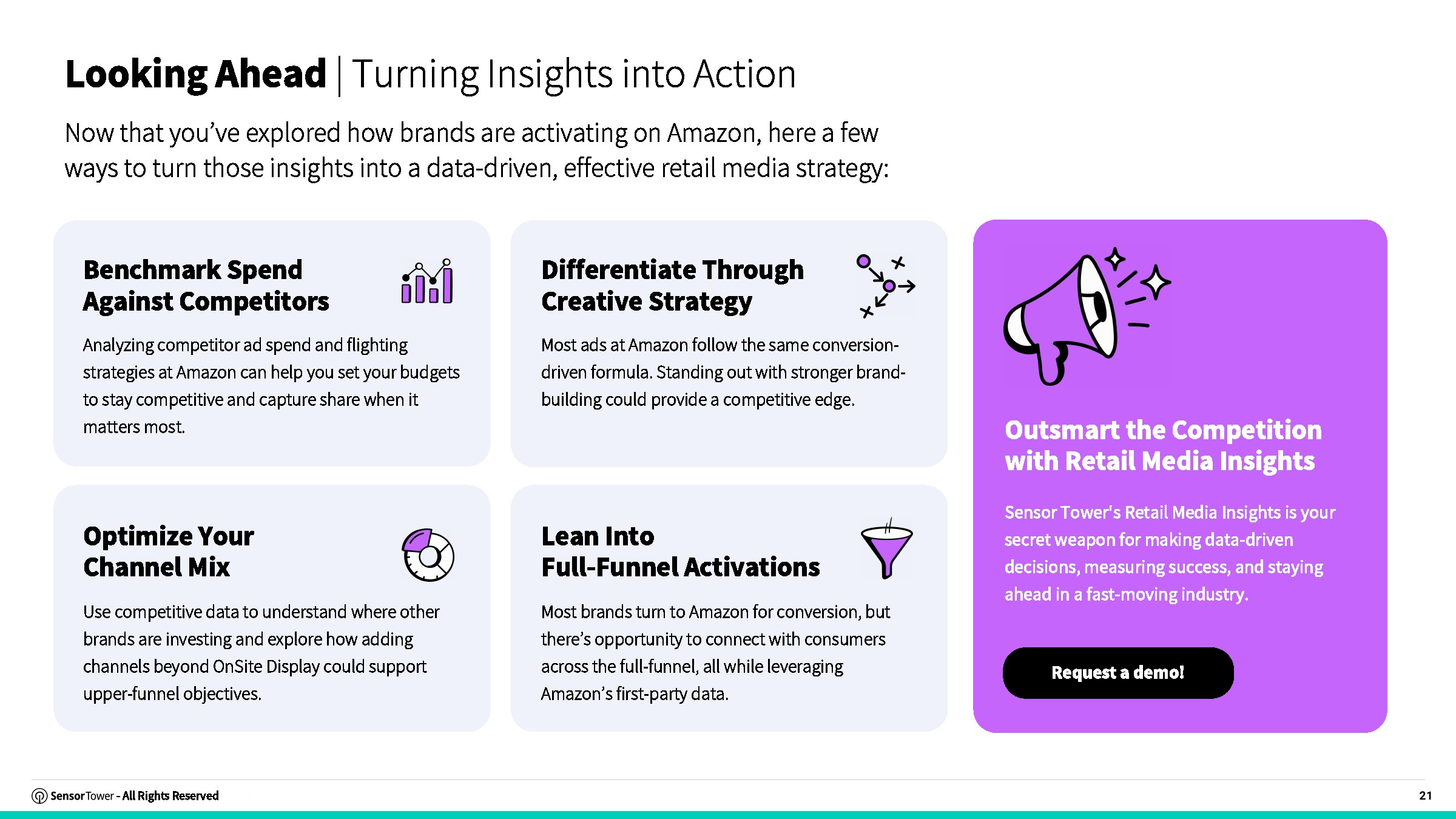 但这仅是冰山一角。无论零售媒体已是您数字战略的支柱,还是尚在考虑中,我们对亚马逊的内部观察将展示如何利用最大规模的RMN,以及我们的零售媒体洞察如何帮助您优化渠道组合、差异化策略并对标竞争对手。需要更多洞察?