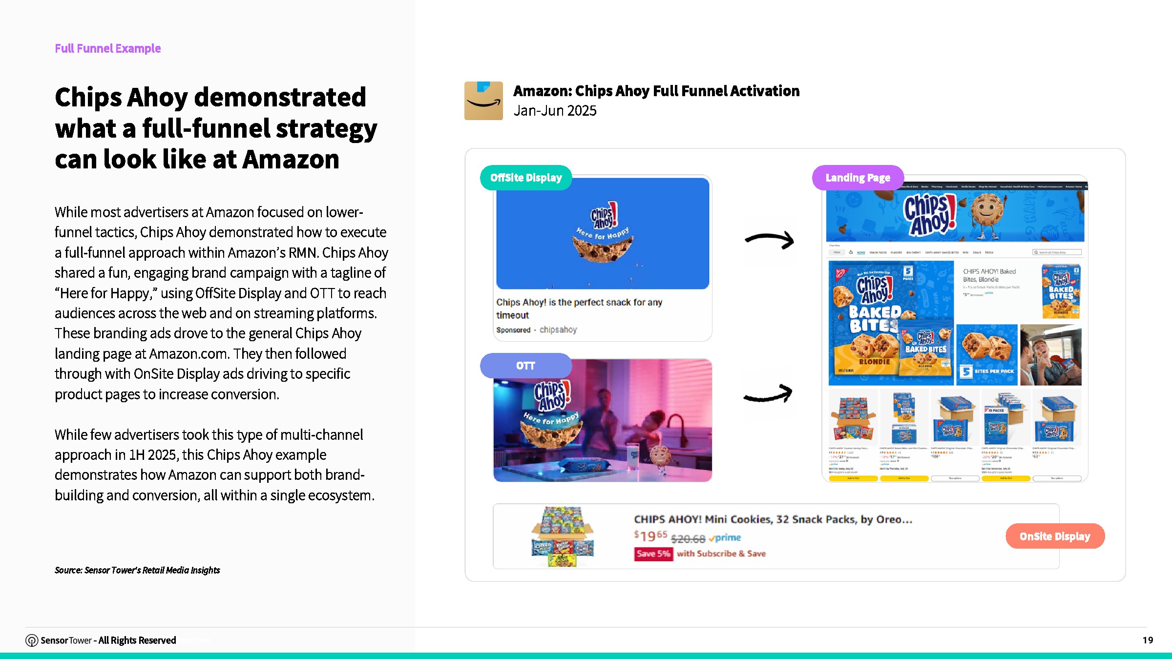 虽然多数亚马逊广告主专注于漏斗底层策略,但趣多多(Chips Ahoy)展示了不同策略,演示了如何在亚马逊RMN内实施全漏斗营销。