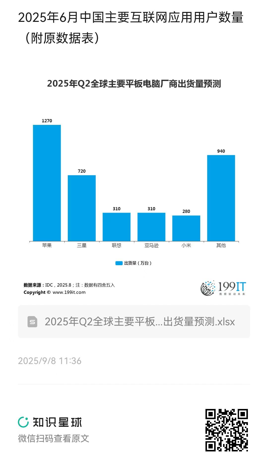 - 2025年Q2全球主要平板电脑厂商出货量市场份额预测(附原数据表)