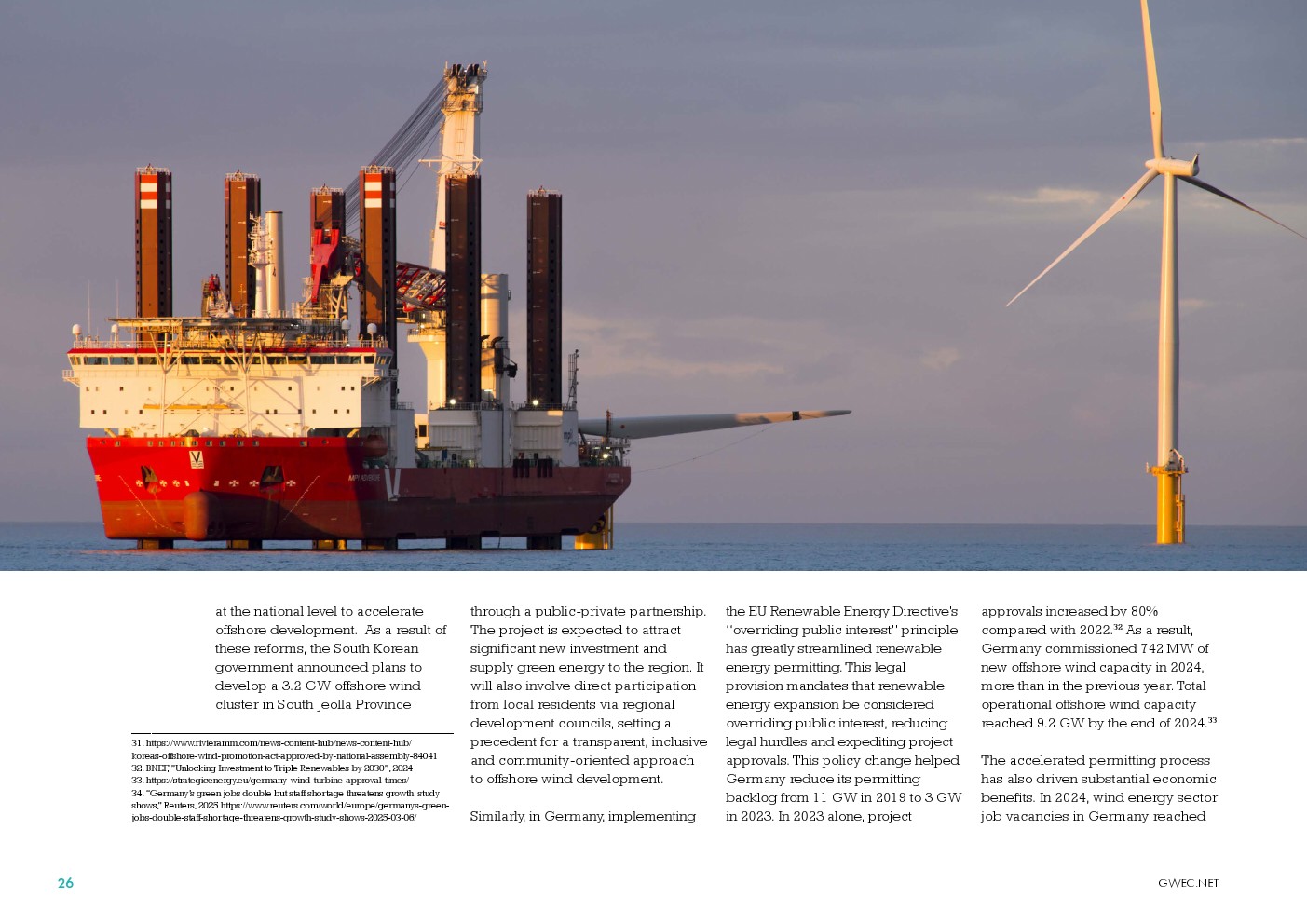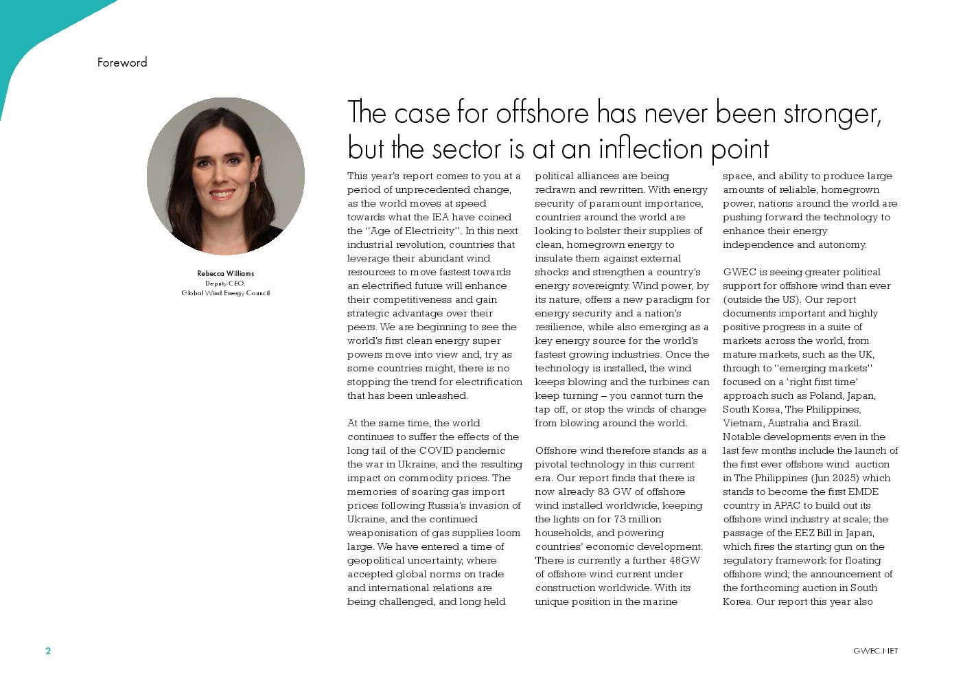 随着世界进入”电气化时代”,海上风电正迅速扩展到亚太、东南亚和拉丁美洲等新区域,这些地区的政策制定者日益认识到该技术的战略价值。政治支持不仅促进经济增长和能源安全,还有助于实现全球1.5°C气候目标,因为它帮助发展中国家获取满足其能源需求并支持可持续发展的清洁、可负担的电力。