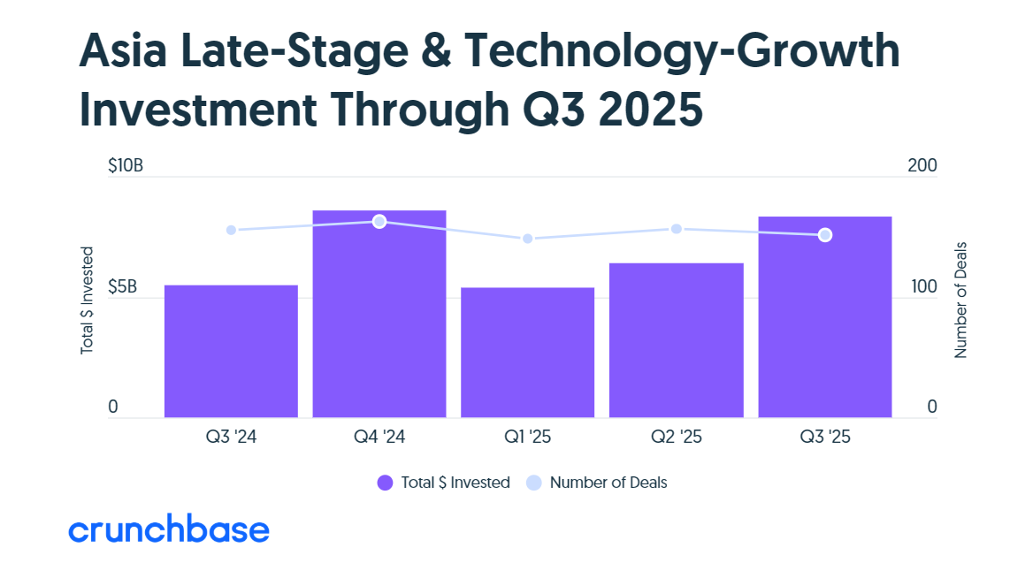 总体而言,后期阶段和技术成长型投资交易在亚洲各地获得了最大的资金份额。