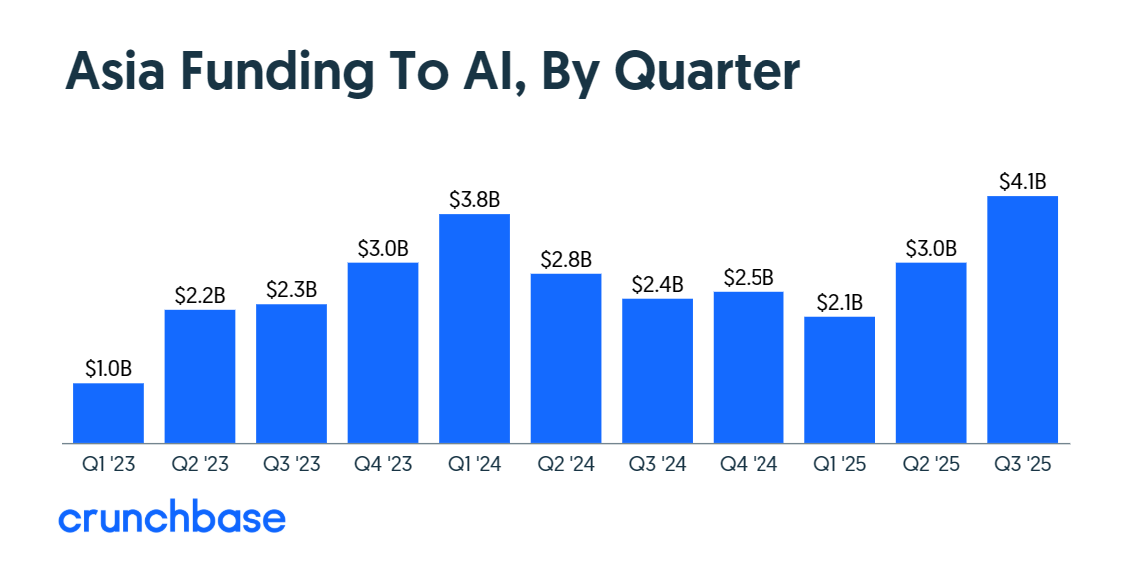 鉴于人工智能这一投资主题在最近几个季度的受欢迎程度,Crunchbase还分析了流向专注于人工智能的公司的亚洲资金份额。在第三季度,人工智能相关投资显著上升,达到了有记录以来的最高总额。