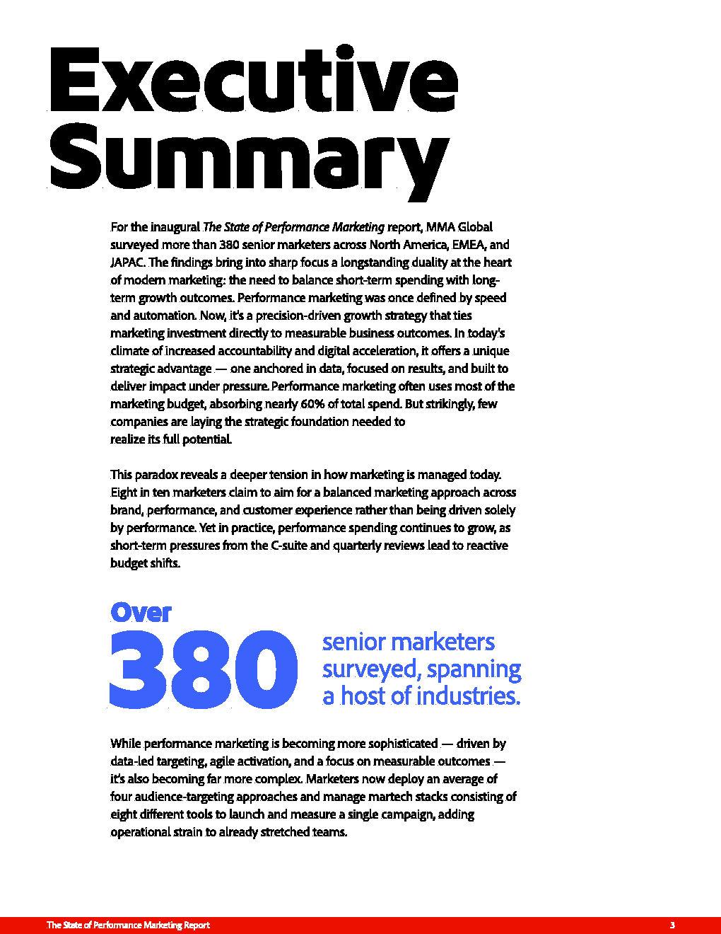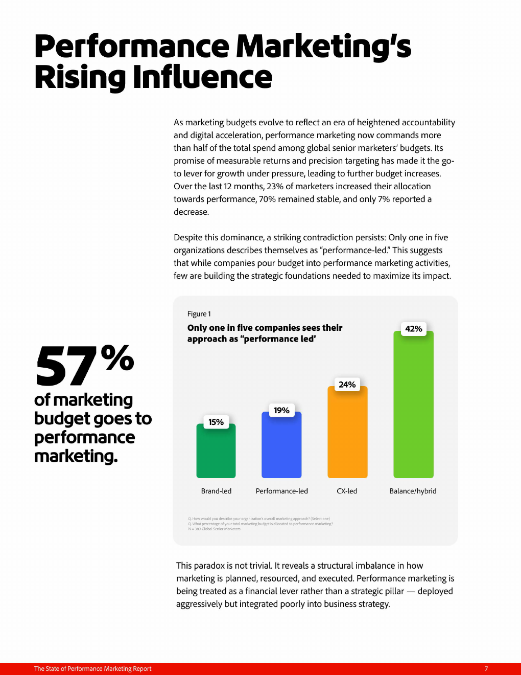 在全球389位高级营销决策者样本中,绩效营销已占据约60%的预算份额,成为企业应对增长压力的核心抓手 。但与资源倾斜形成鲜明对比的是,仅约20%的企业真正以绩效为战略核心,这一“高投入、弱战略”的结构性悖论,揭示了当下营销体系中执行与战略脱节的深层问题。过去一年中,23%的企业增加投入、70%维持稳定,进一步印证其作为“刚性支出”的地位正在强化。