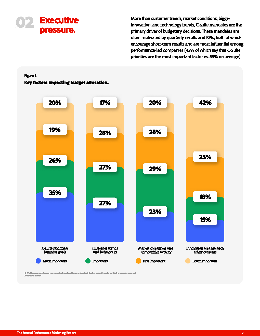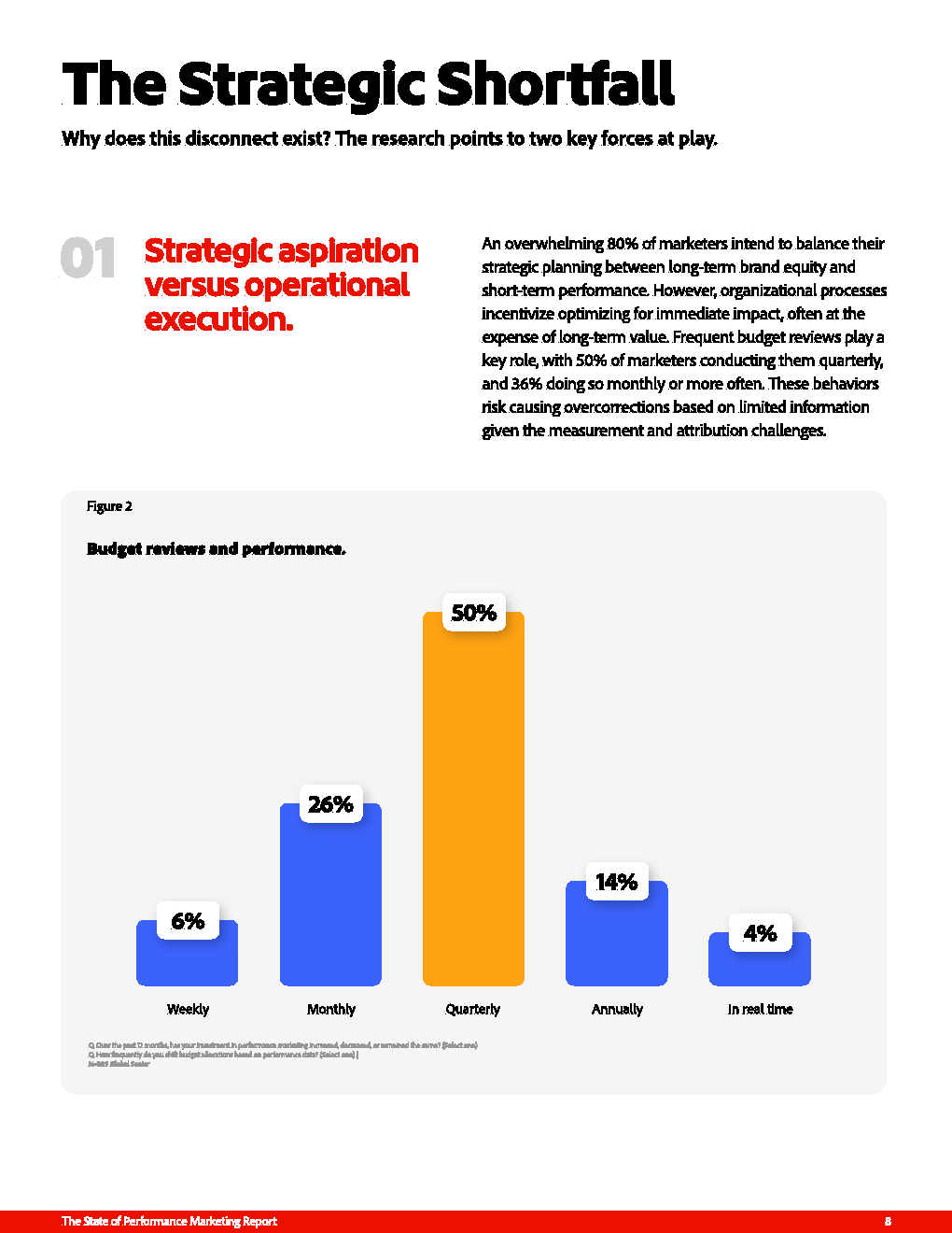 这种失衡的根源在于短期导向对决策体系的持续侵蚀。尽管80%的营销者声称追求品牌、绩效与客户体验的平衡,但预算分配仍高度依赖短期业绩考核。50%的企业按季度调整预算,另有36%更高频动态调整,使资源配置呈现明显的“反应式波动”。与此同时,42%的预算决策直接受C-suite驱动,显著高于客户需求与市场变化因素,导致绩效营销被工具化为短期财务杠杆,而非长期增长支点。