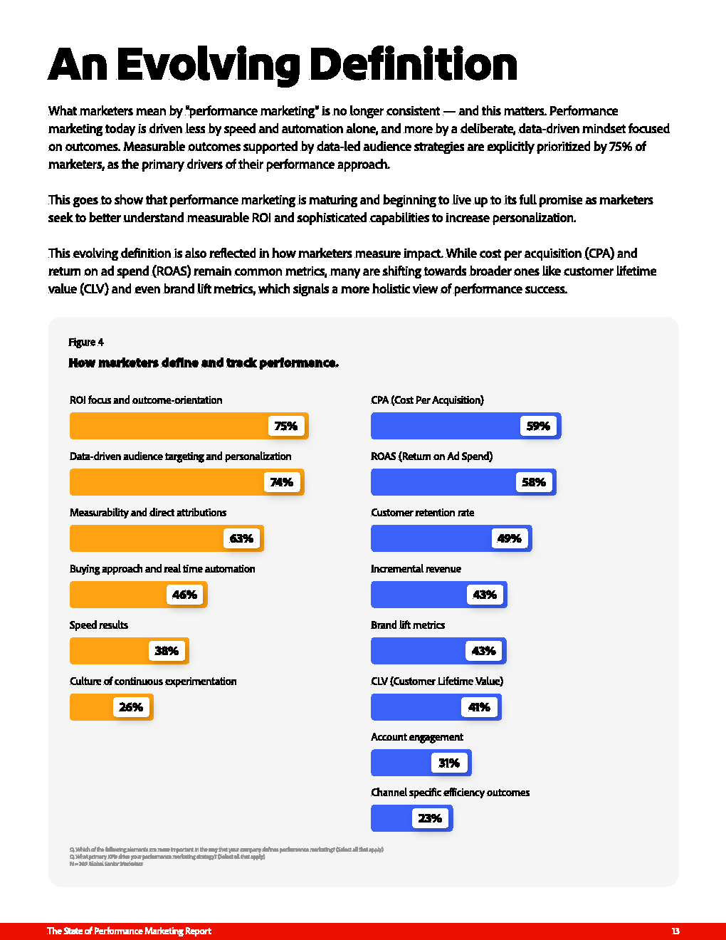 在定义层面,绩效营销正经历重要范式转移。75%的营销者将“可衡量结果”作为核心,74%强调数据驱动的受众策略,标志其从“速度与自动化”向“结果与洞察”转型。指标体系也在升级,从传统CPA与ROAS,延伸至客户生命周期价值(41%)与品牌提升(43%),反映企业开始尝试将短期转化与长期价值统一于同一评估框架之中。
