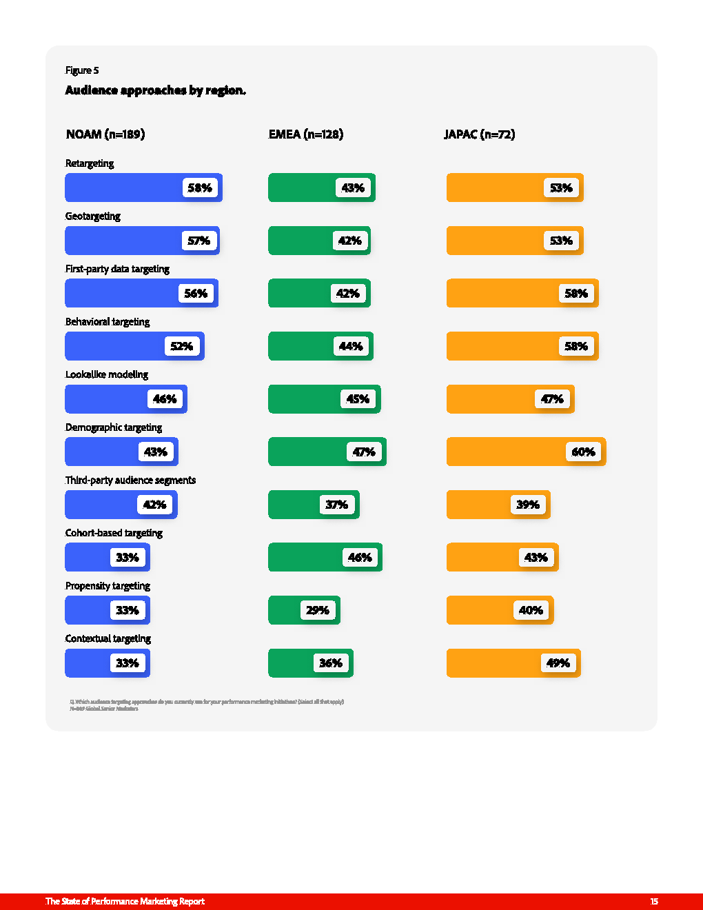 然而,能力体系的复杂化正在侵蚀效率红利。单一营销活动平均依赖8种MarTech工具,并结合至少4种受众定向方式,导致技术栈碎片化与运营成本上升并存。区域差异亦明显,例如北美重定向使用率达58%,而JAPAC市场人口属性定向高达60%,显示全球策略尚未实现统一的数据逻辑与方法论。