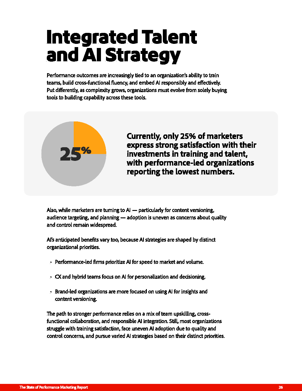 更深层的约束来自能力缺口。仅约50%的营销者对一方与零方数据具备信心,超过70%认为技术整合是关键挑战,而仅25%对人才与培训投入表示高度满意。这意味着,尽管企业在工具层面持续加码,但在数据治理、人才结构与组织能力上的投入明显滞后。AI虽在内容生成与受众定向中加速渗透,但对质量与可控性的担忧,使其尚未成为规模化生产力。