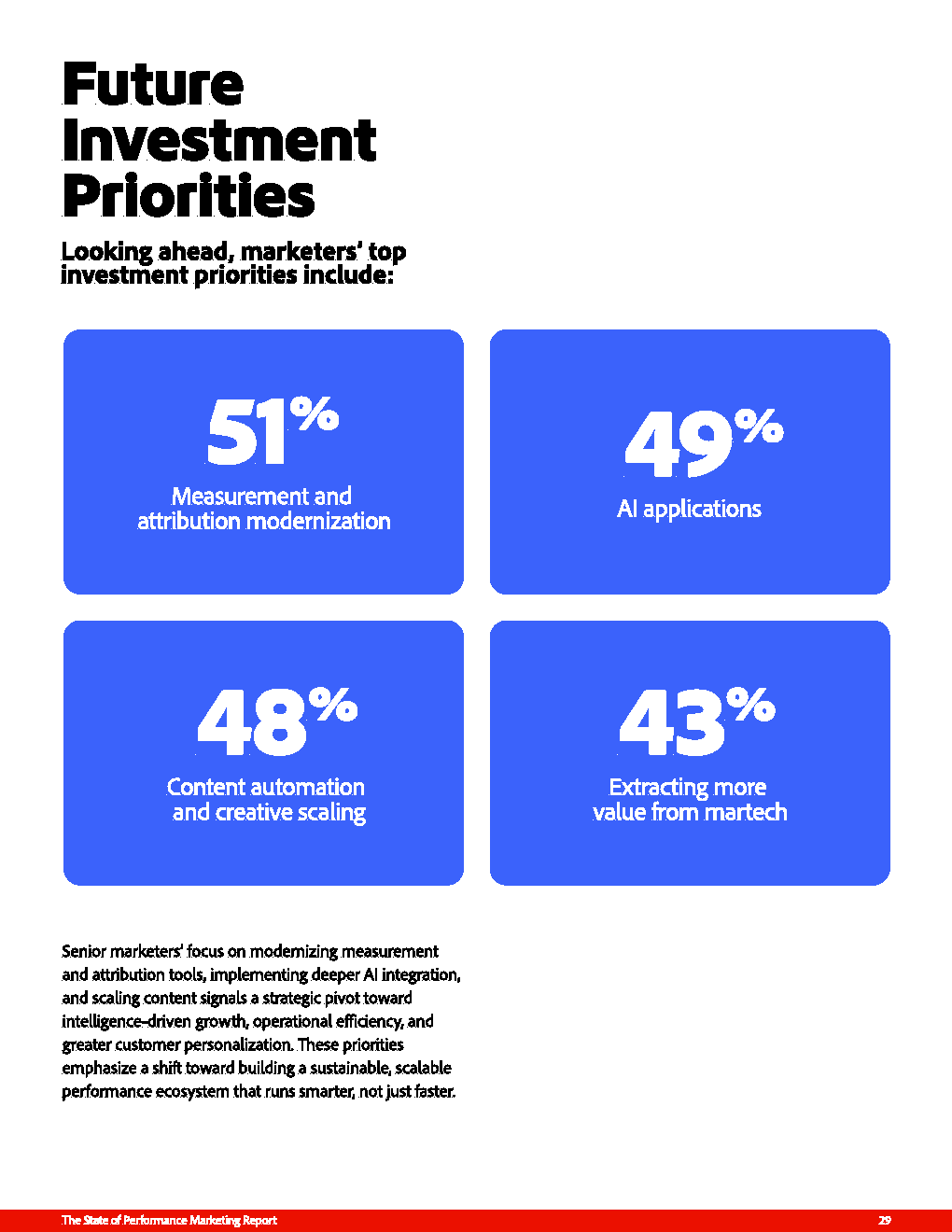 展望未来,企业投资重点已显现结构性转向。51%的营销者优先布局测量与归因体系,49%加大AI投入,48%推进内容自动化,43%聚焦释放MarTech价值。这一组合指向一个更清晰的方向:从“投放效率优化”迈向“系统能力建设”。