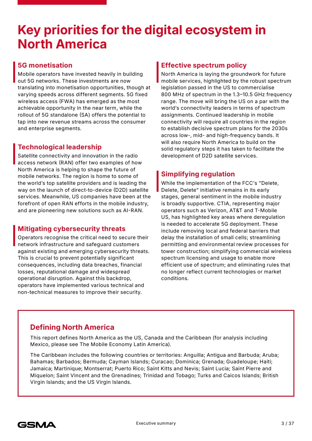 卫星连接和无线接入网络(RAN)的创新提供了北美如何帮助塑造移动网络未来的两个例子。该地区是世界上一些顶级卫星提供商的所在地,并且在发射直接到设备(D2D)卫星服务方面处于领先地位。与此同时,美国公司一直走在移动行业开放RAN努力的前沿,并开创了AI-RAN等新解决方案。