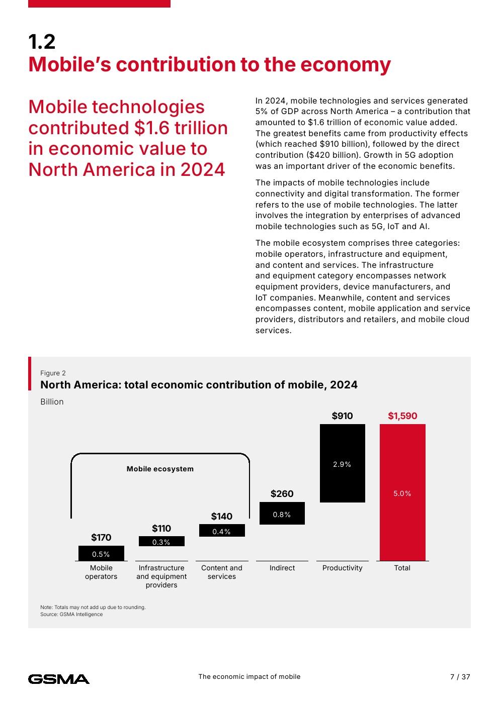 移动技术和服务现在约占北美GDP的5%,这一贡献相当于1.6万亿美元。这在很大程度上源于移动服务的使用所产生的生产力效应,以及移动产业生态系统的直接贡献,到2024年,这一贡献将达到4200亿美元。