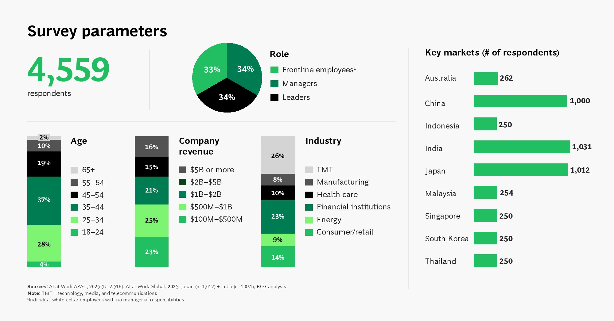 亚太地区正在成为全球AI应用最活跃的区域之一,但其领先优势更多体现在“使用广度”,而非“价值深度”。调研显示,78%的受访者已成为AI高频用户,显著高于全球平均水平。其中,一线员工使用率达到78%,较全球高出19个百分点,反映出AI在基层岗位的快速渗透。分市场看,印度、印尼与中国的使用率均超过87%,构成区域内最强增长极。这一结构意味着,AI正在从管理工具转变为普遍生产力基础设施。