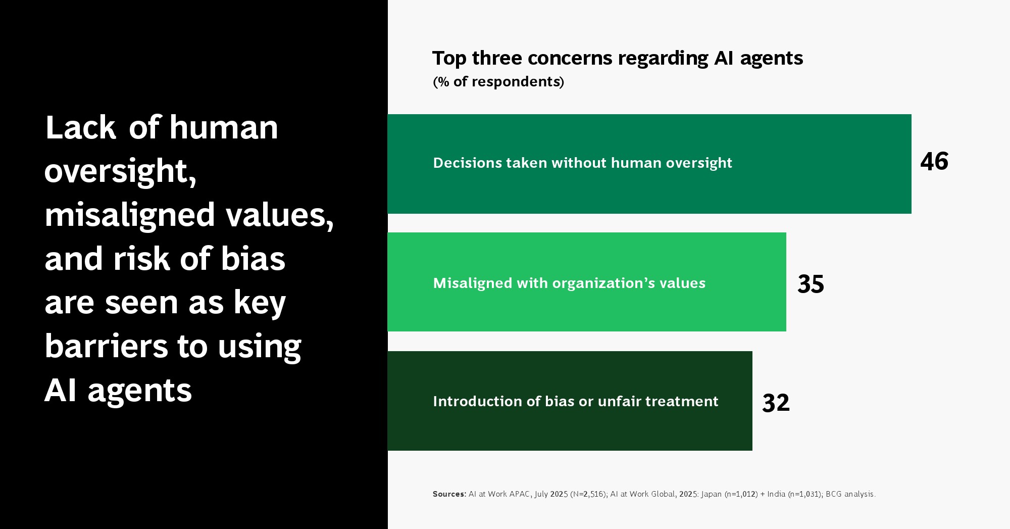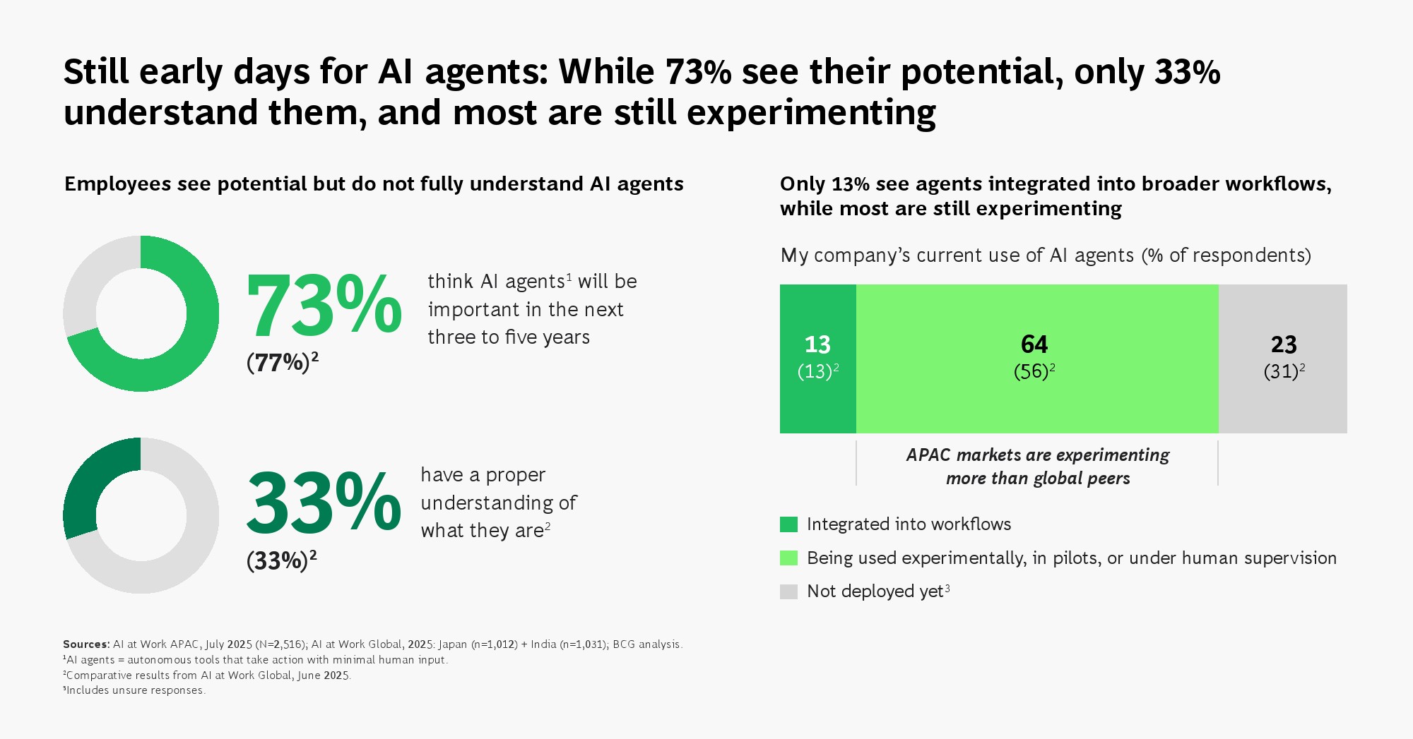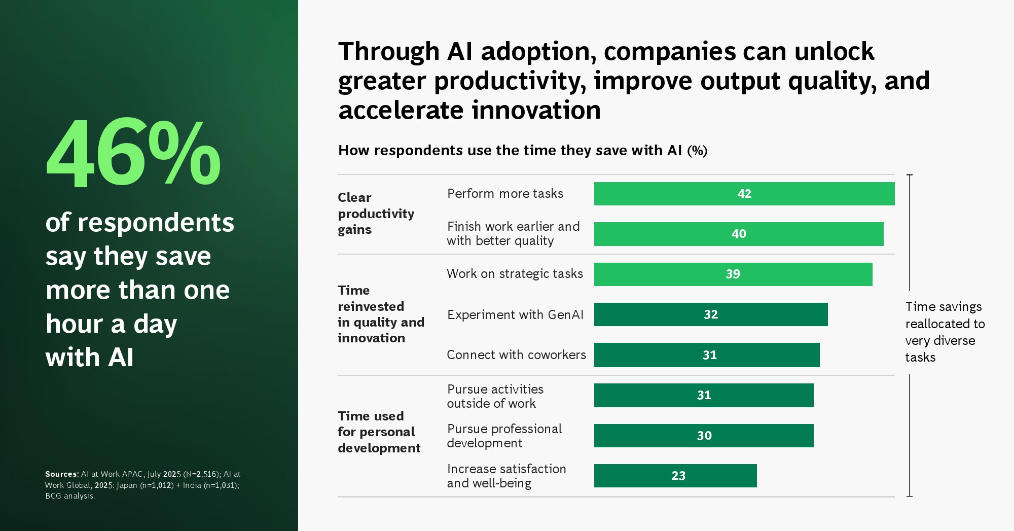 尽管应用广泛,亚太企业在价值转化上仍显滞后。全球领先企业将70%的AI预算投入流程重构与业务创新,而亚太企业仅为57%,更多资源仍集中在单点工具部署。这种结构导致AI收益集中于个体效率,而非组织级变革。换言之,亚太企业已实现“高使用率”,但尚未完成“高转型率”,若缺乏端到端流程再设计,技术红利将逐步触及天花板。