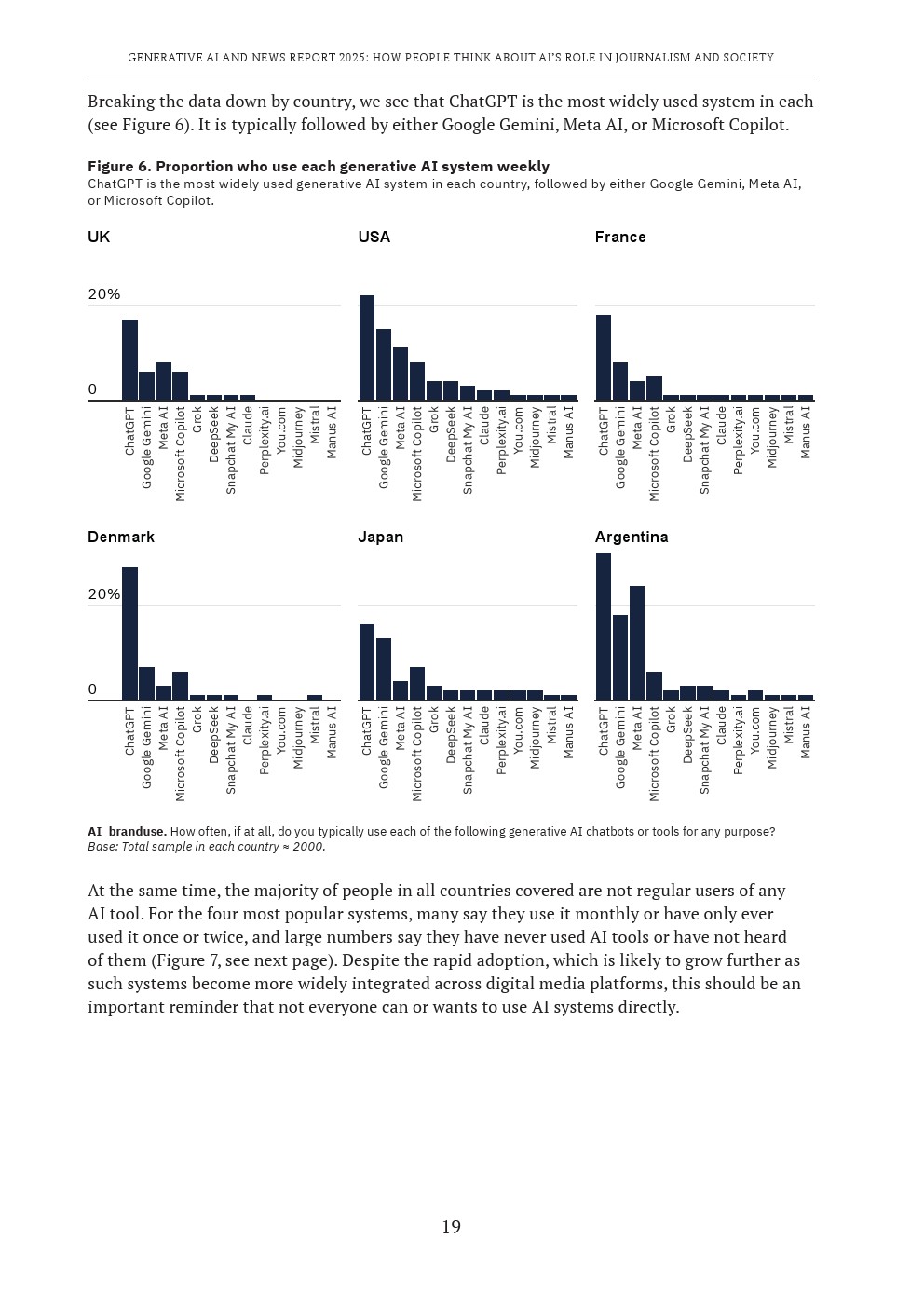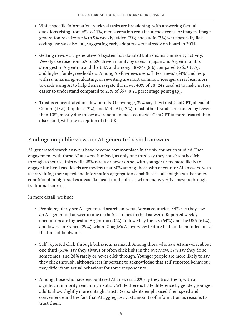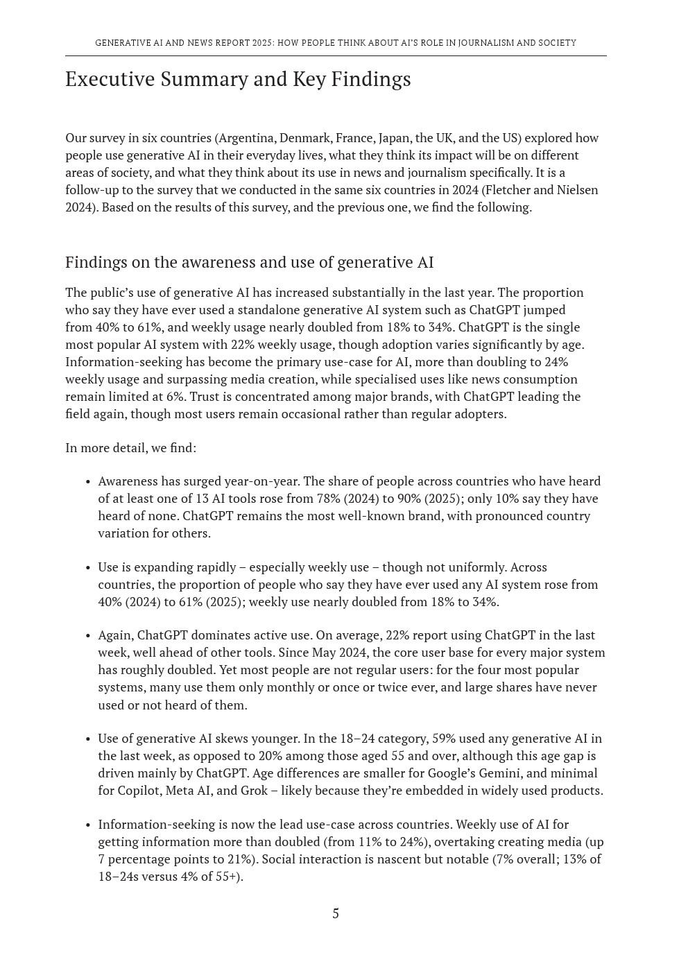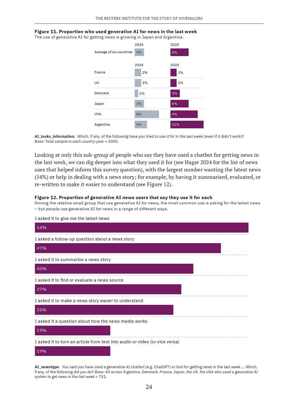 路透社和牛津大学发布了“2025年生成式AI和新闻报告”。路透社在六个国家(阿根廷、丹麦、法国、日本、英国和美国)开展调查,旨在探究人们如何在日常生活中使用生成式人工智能,他们认为生成式人工智能将对社会不同行业产生何种影响,以及他们对其在新闻行业应用的看法。