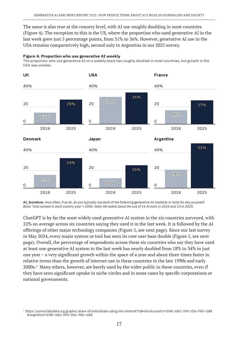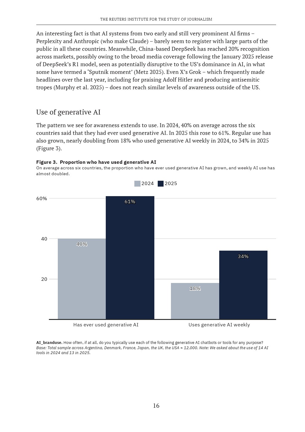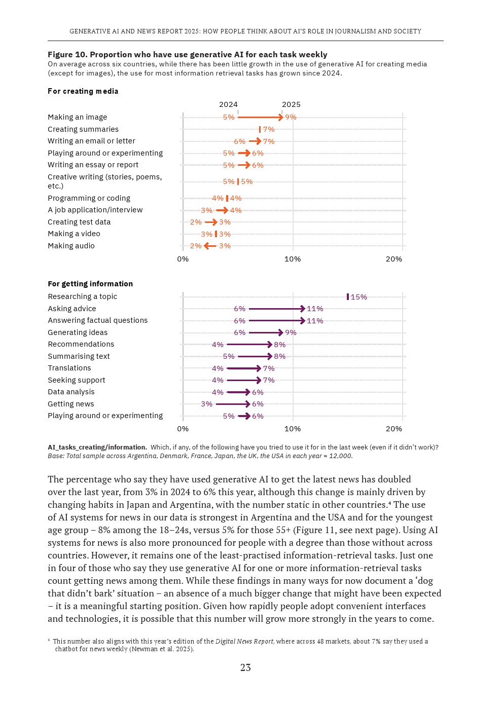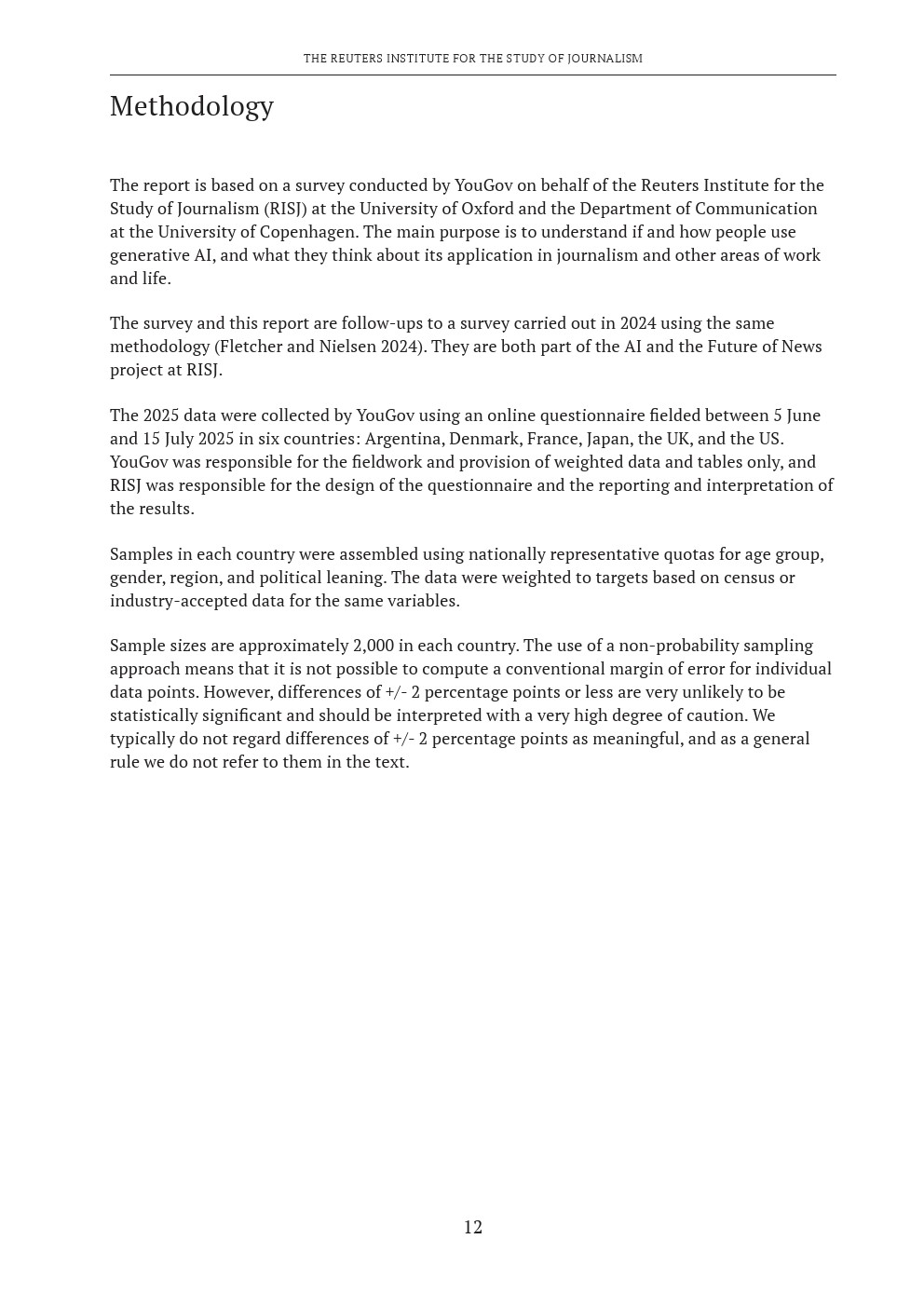 路透社和牛津大学发布了“2025年生成式AI和新闻报告”。路透社在六个国家(阿根廷、丹麦、法国、日本、英国和美国)开展调查,旨在探究人们如何在日常生活中使用生成式人工智能,他们认为生成式人工智能将对社会不同行业产生何种影响,以及他们对其在新闻行业应用的看法。