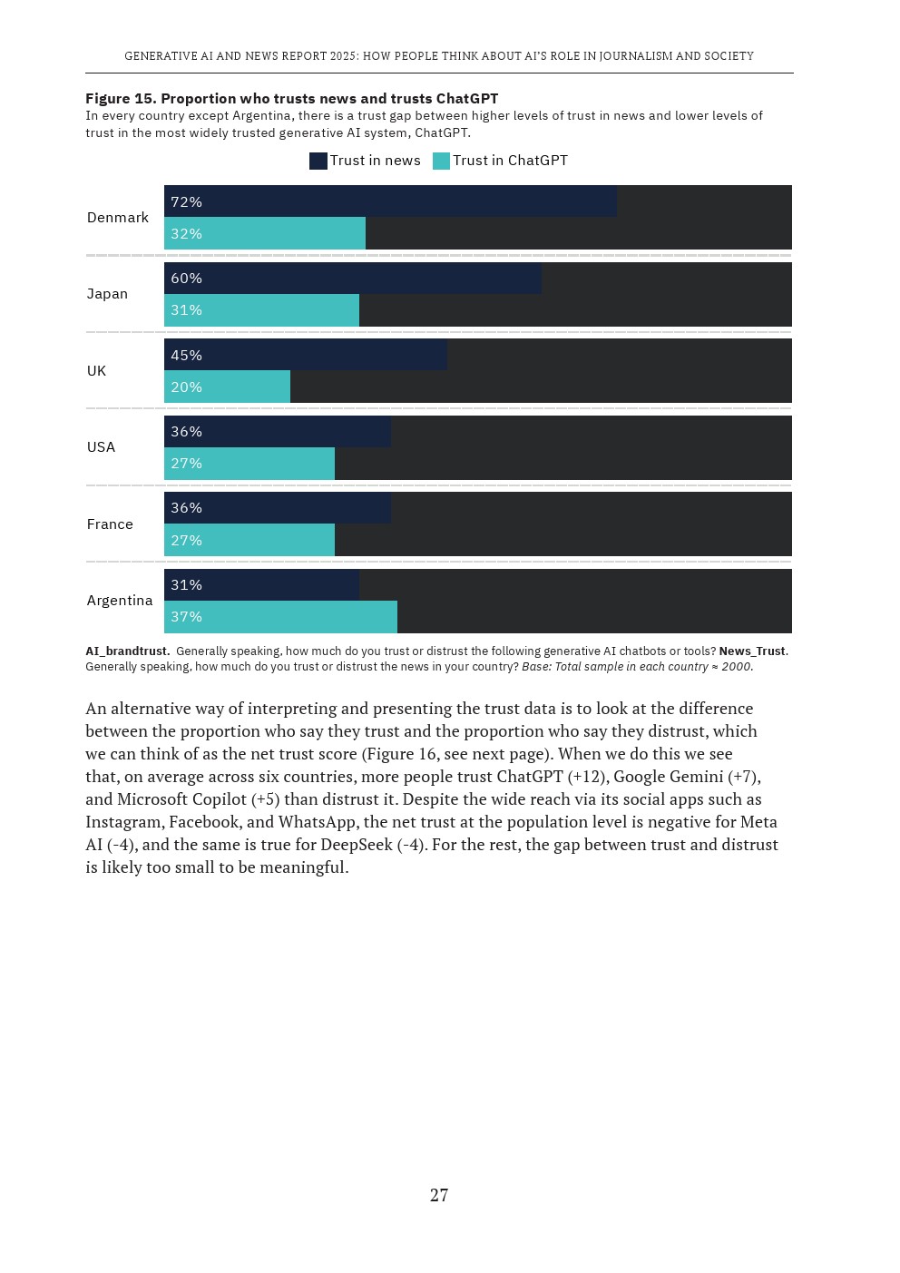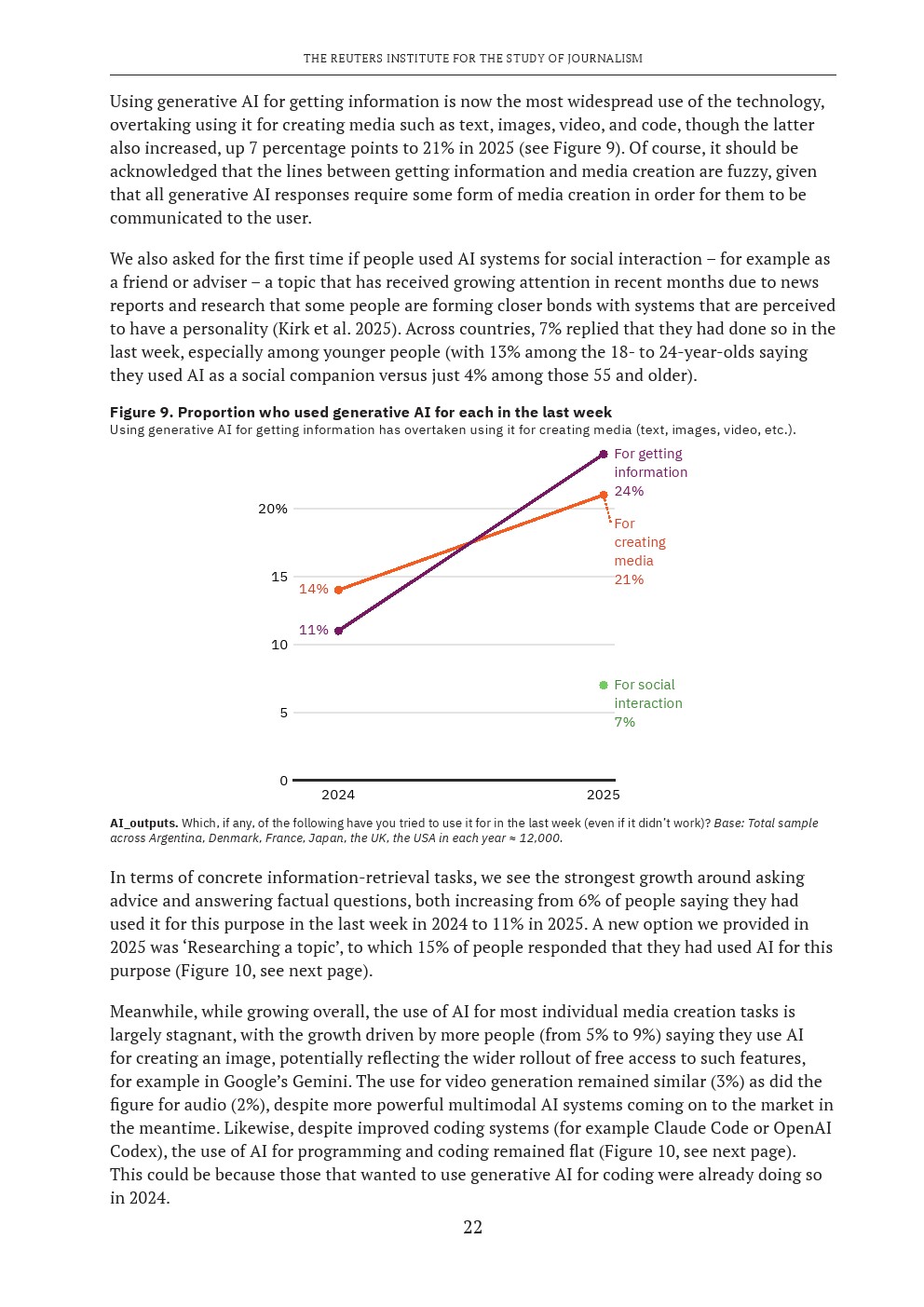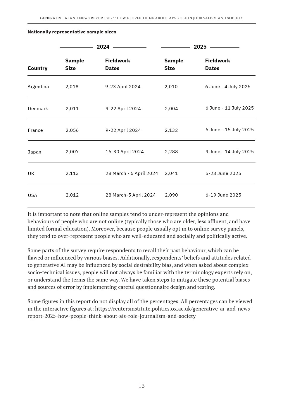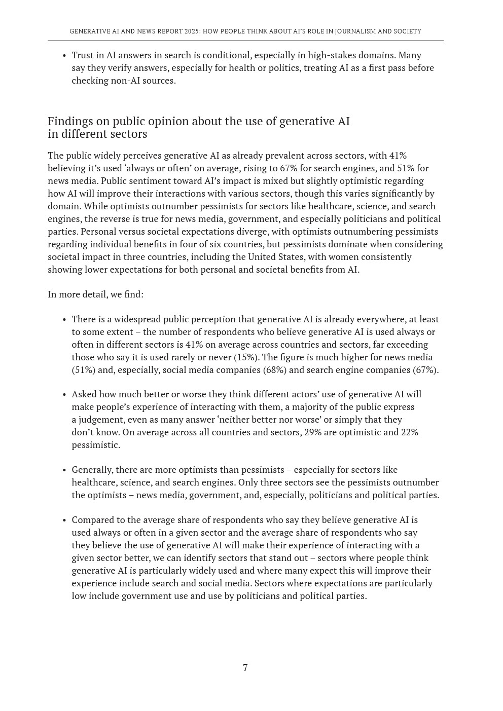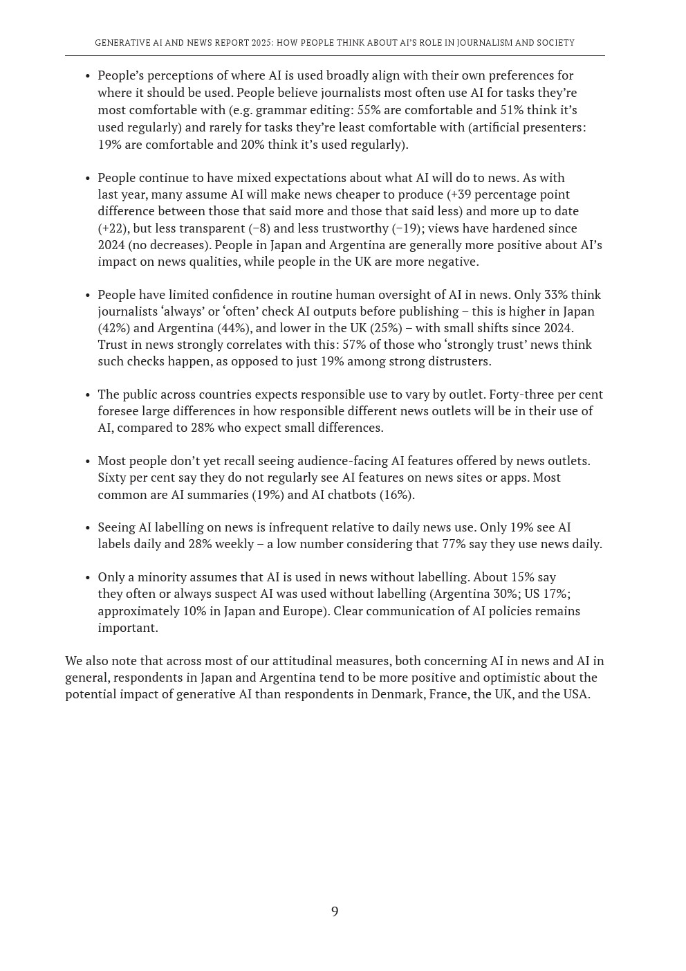 路透社和牛津大学发布了“2025年生成式AI和新闻报告”。路透社在六个国家(阿根廷、丹麦、法国、日本、英国和美国)开展调查,旨在探究人们如何在日常生活中使用生成式人工智能,他们认为生成式人工智能将对社会不同行业产生何种影响,以及他们对其在新闻行业应用的看法。
