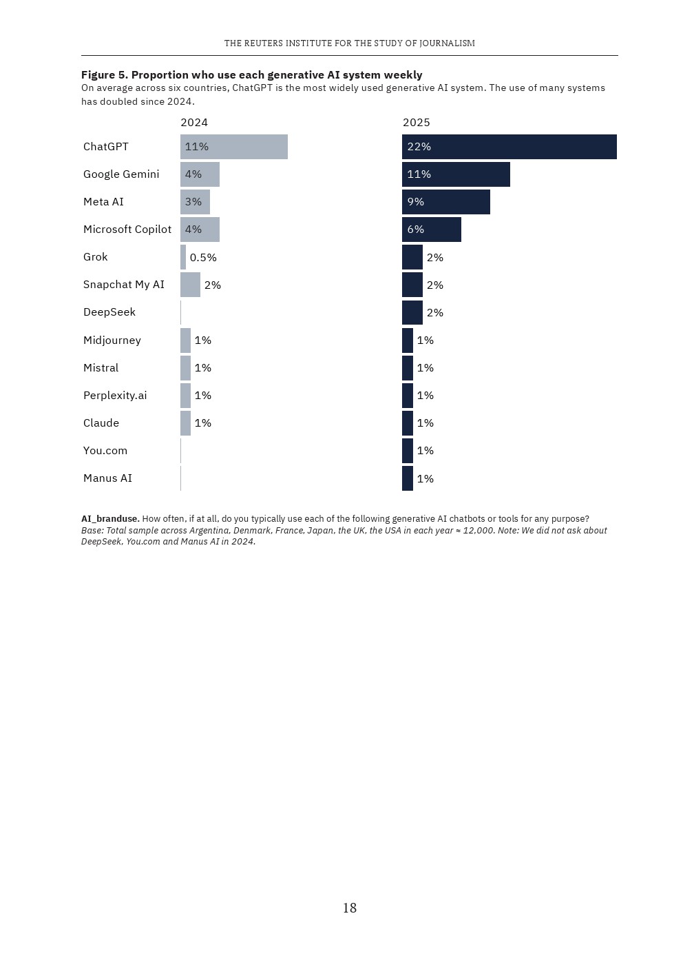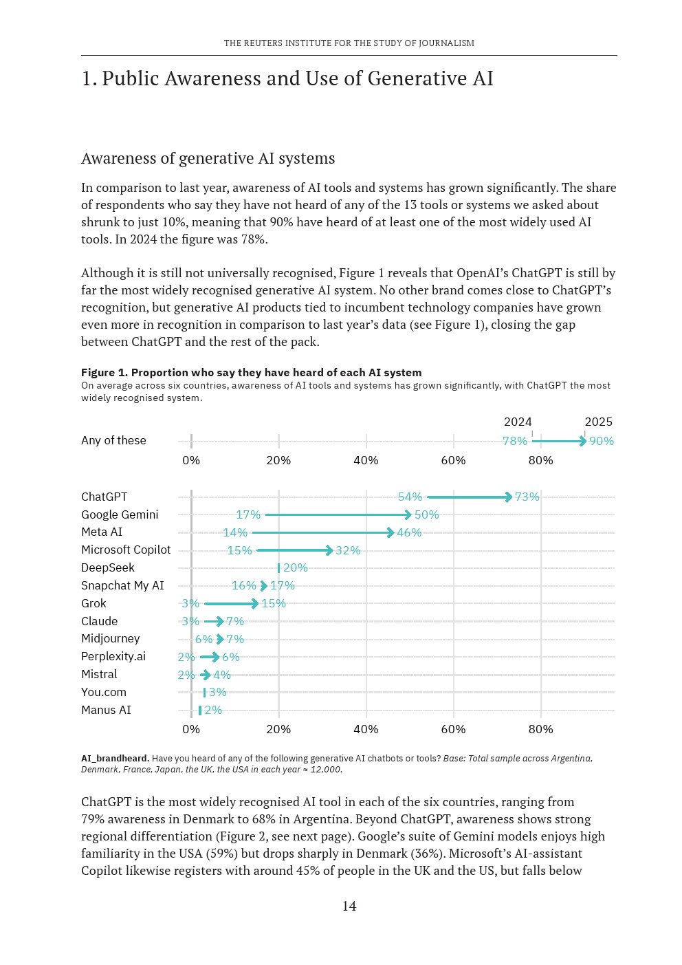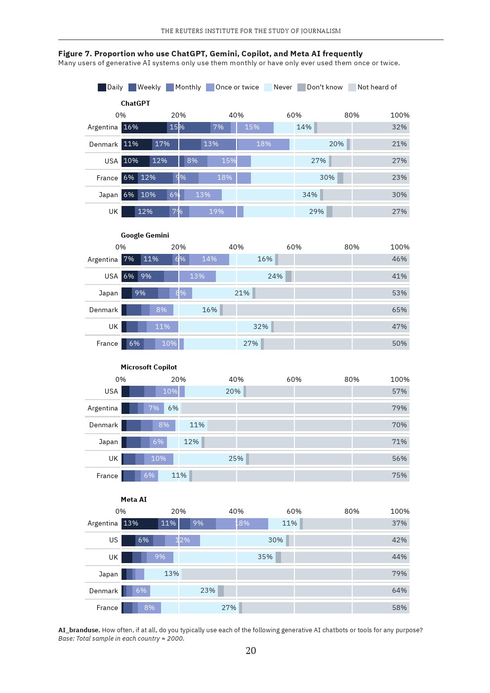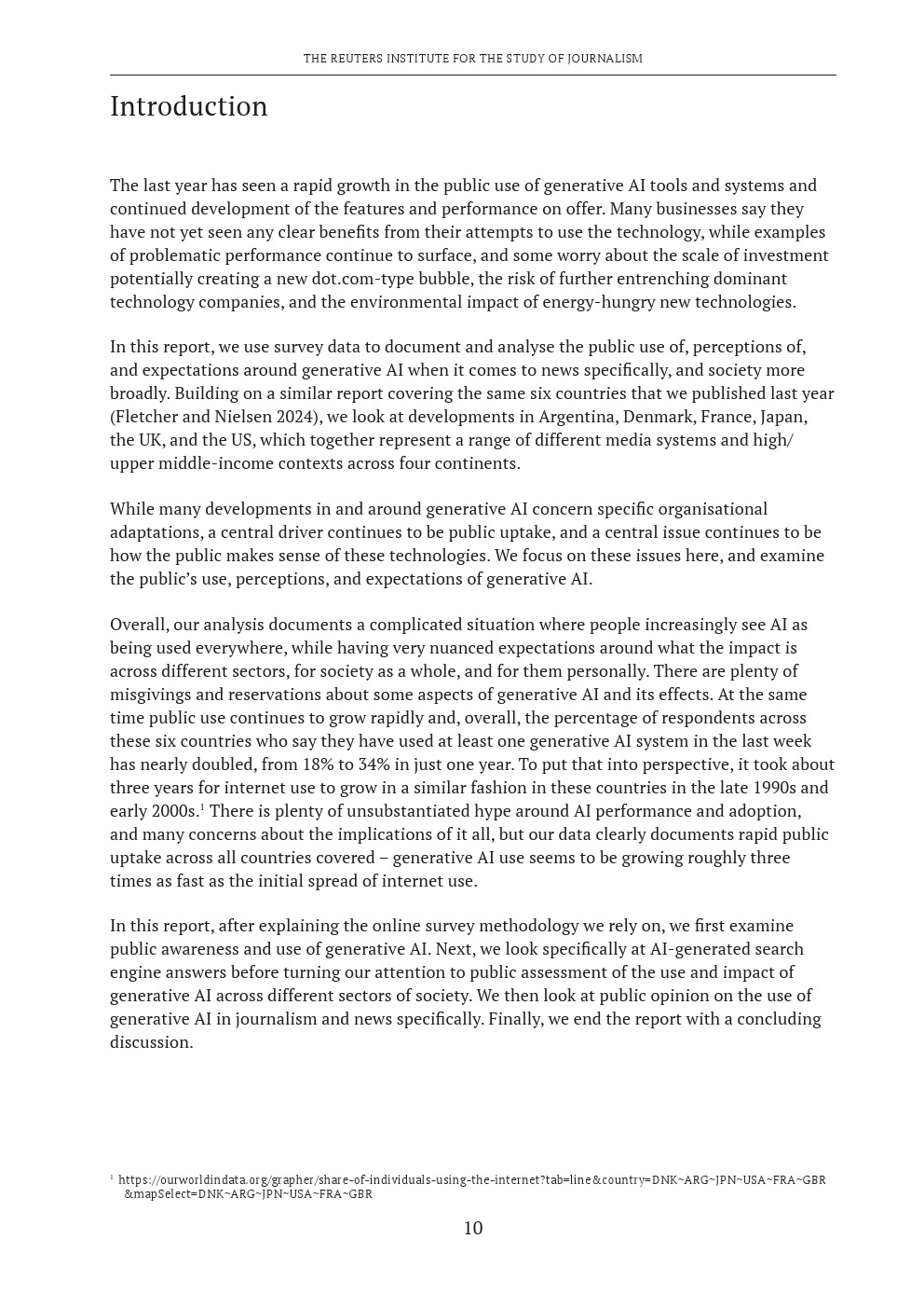 路透社和牛津大学发布了“2025年生成式AI和新闻报告”。路透社在六个国家(阿根廷、丹麦、法国、日本、英国和美国)开展调查,旨在探究人们如何在日常生活中使用生成式人工智能,他们认为生成式人工智能将对社会不同行业产生何种影响,以及他们对其在新闻行业应用的看法。
