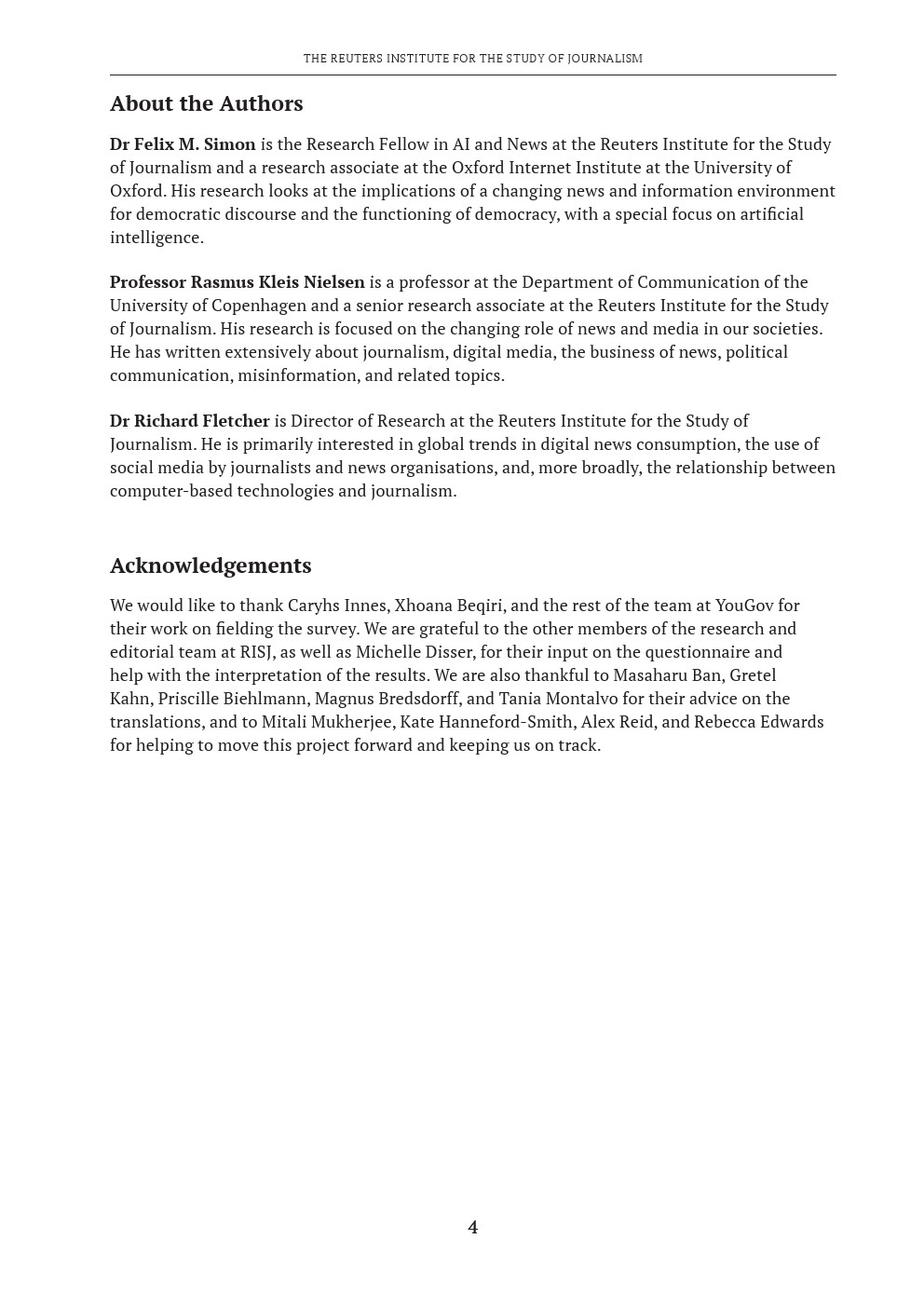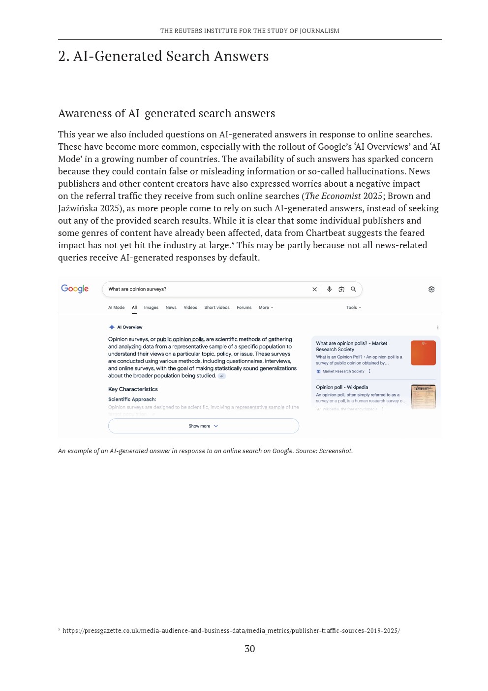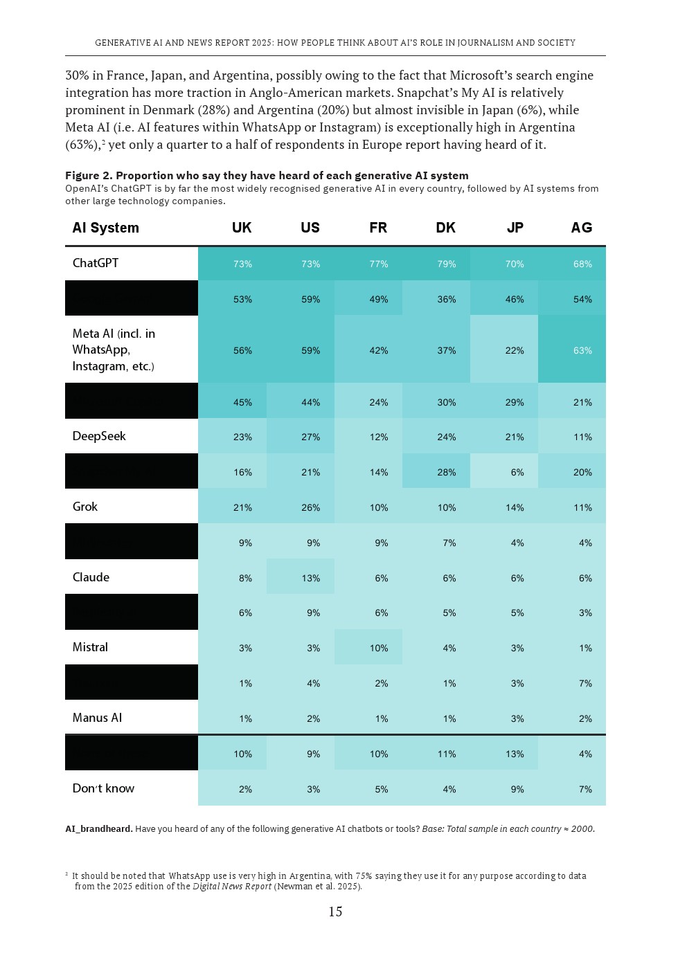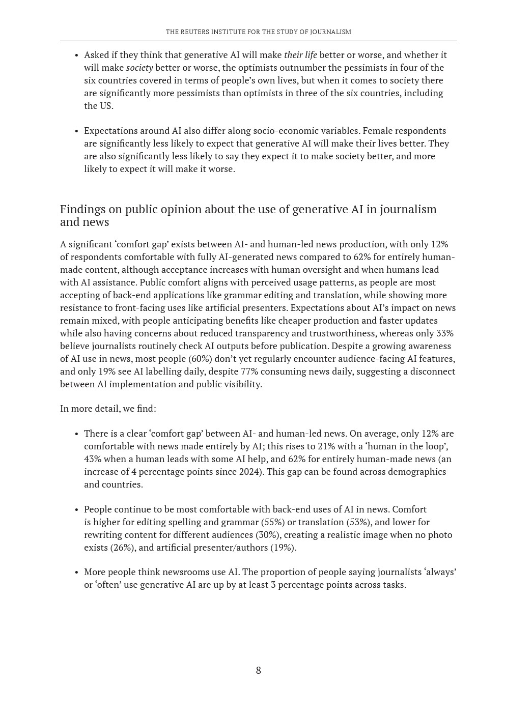 路透社和牛津大学发布了“2025年生成式AI和新闻报告”。路透社在六个国家(阿根廷、丹麦、法国、日本、英国和美国)开展调查,旨在探究人们如何在日常生活中使用生成式人工智能,他们认为生成式人工智能将对社会不同行业产生何种影响,以及他们对其在新闻行业应用的看法。