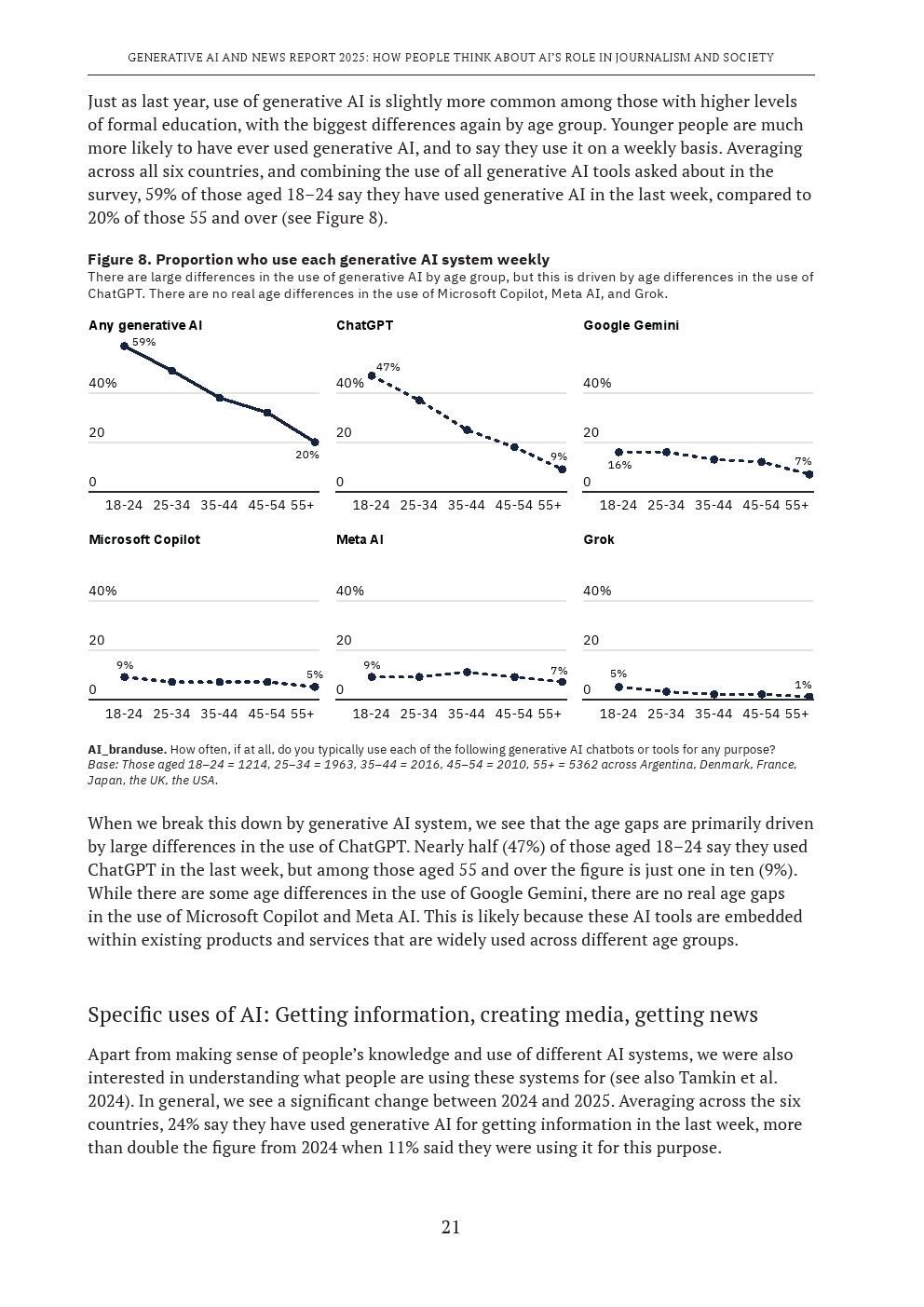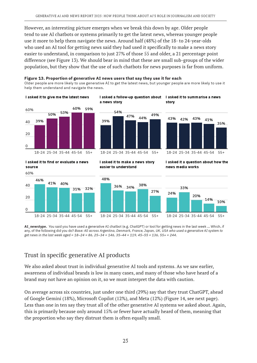 通过生成式AI系统获取新闻的比例翻了一番,但仍属少数人的行为。每周使用率从3%上升到6%,主要由日本和阿根廷的用户推动;这在阿根廷和美国最为普遍,在18-24岁群体中(8%)高于55岁以上群体(5%),并且拥有学位者中使用率更高。在使用AI获取新闻的用户中,”最新新闻”(54%)以及帮助总结、评估或重写新闻是最常见的用途。年轻用户更倾向于使用AI来帮助他们浏览新闻:48%的18-24岁用户使用AI使新闻报道更容易理解,而在55岁以上用户中这一比例为27%(相差21个百分点)。