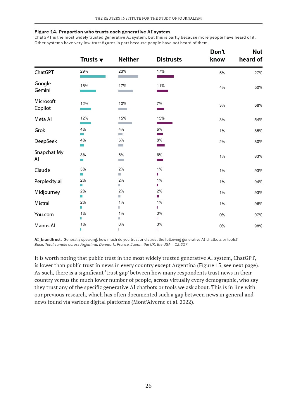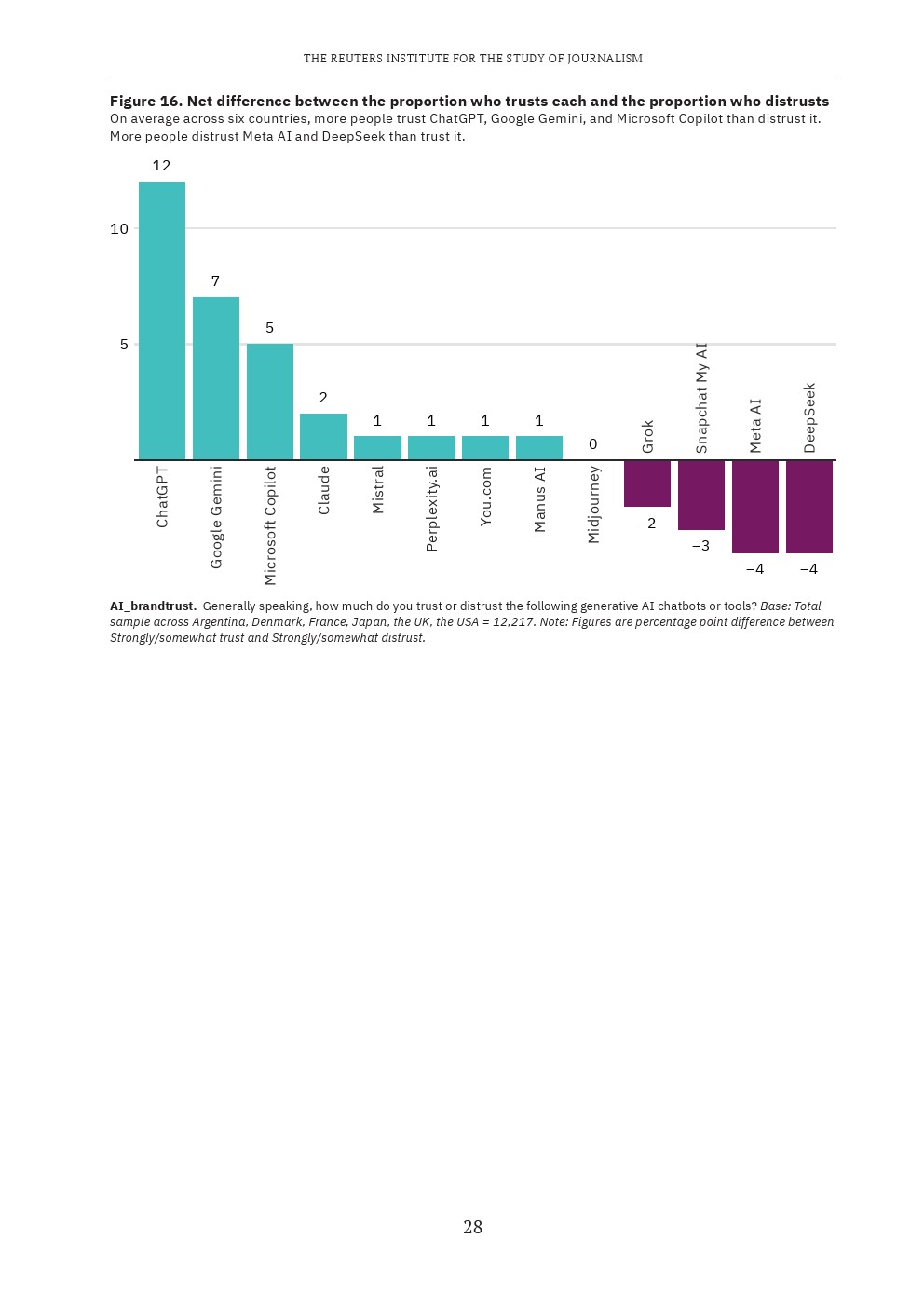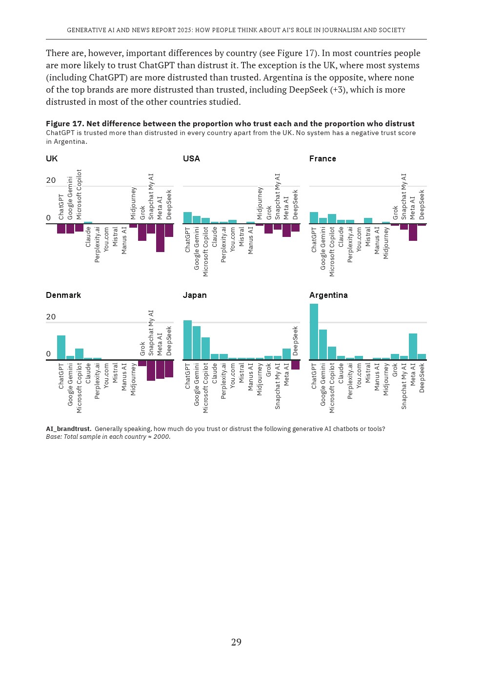 信任集中在少数几个品牌。平均29%的受访者表示他们信任ChatGPT,其次是Gemini(18%)、Copilot(12%)和Meta AI(12%);大多数其他品牌的信任度低于10%,主要原因是认知度低。在大多数国家,对ChatGPT持信任态度的人多于不信任的人,英国除外。