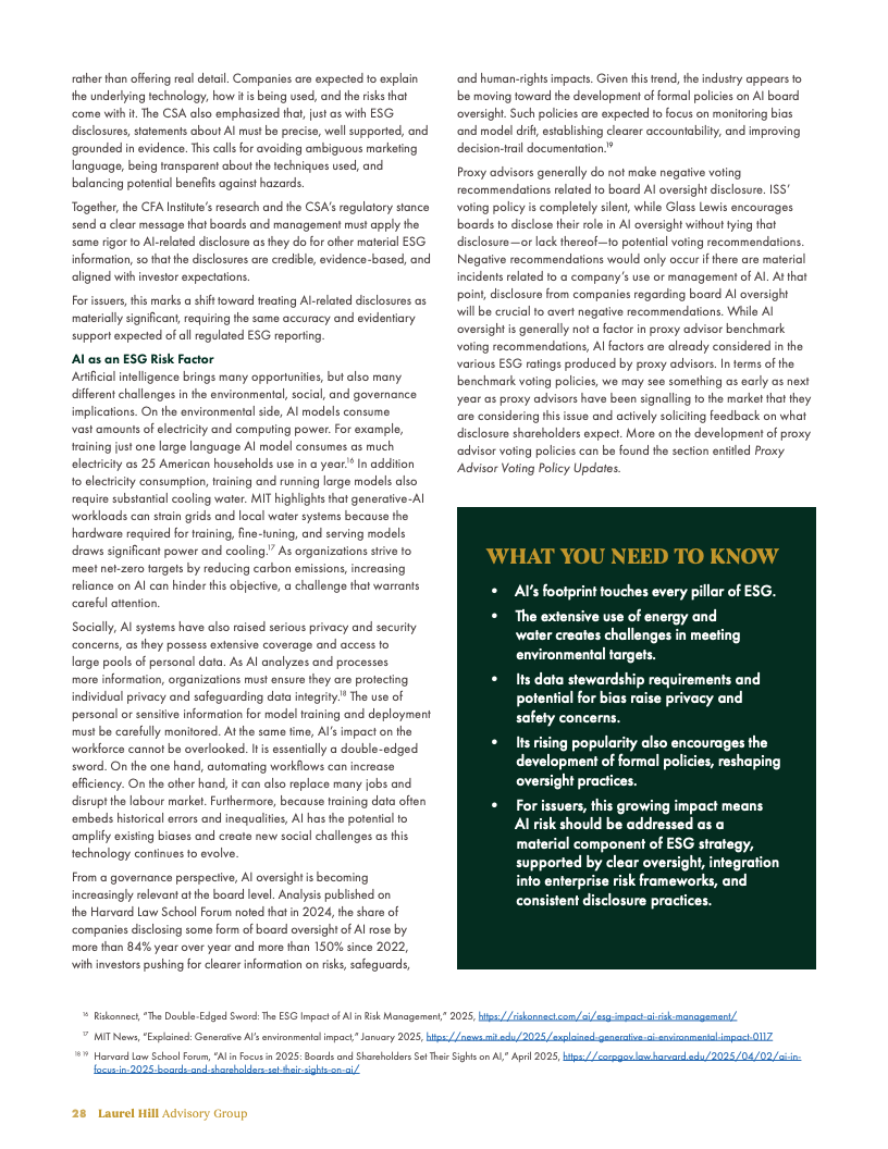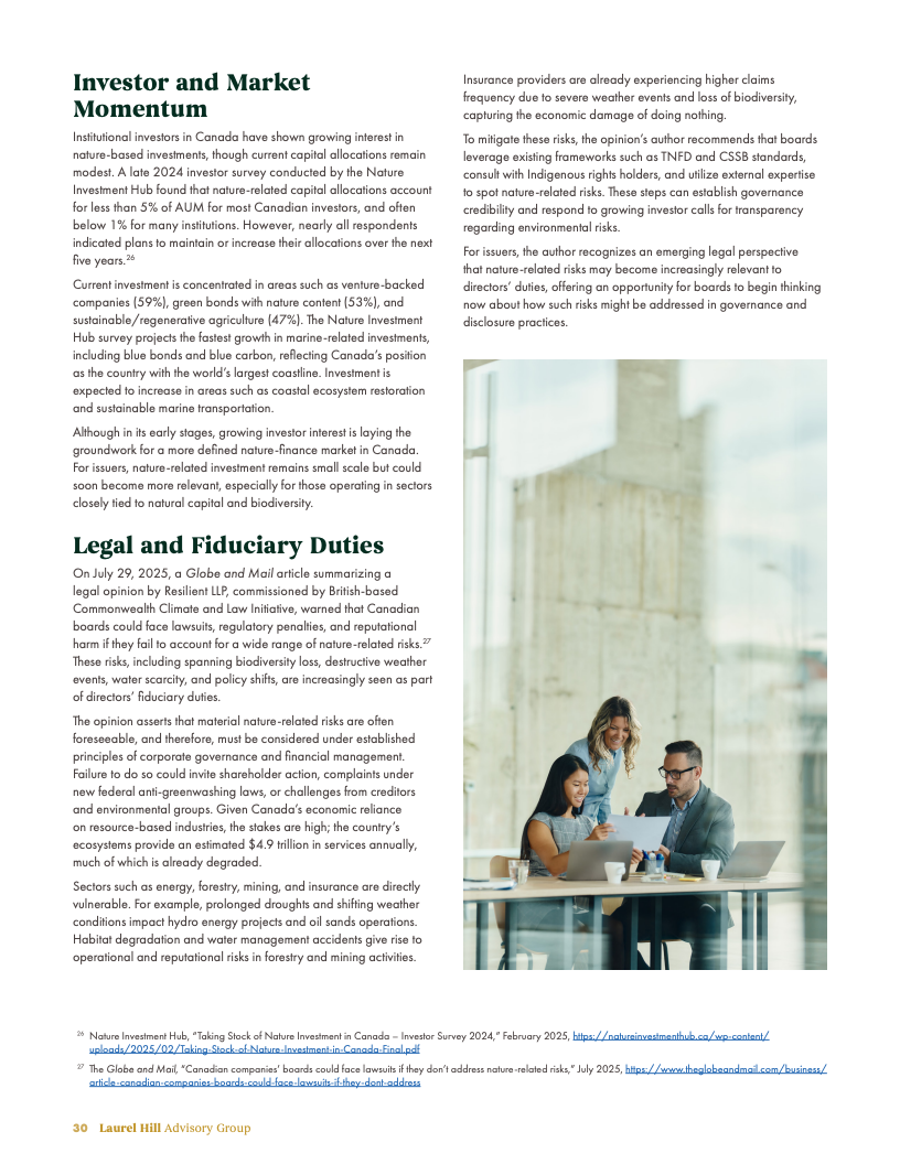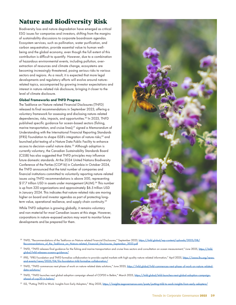 ESG领域政策趋于碎片化,AI与ESG议题融合显著。董事会监督AI披露企业同比增长84%。自然与生物多样性风险开始影响企业治理,大多数投资者配置比例低于5%,未来有加码意愿。网络安全纳入董事会战略治理,合规风险升级。
