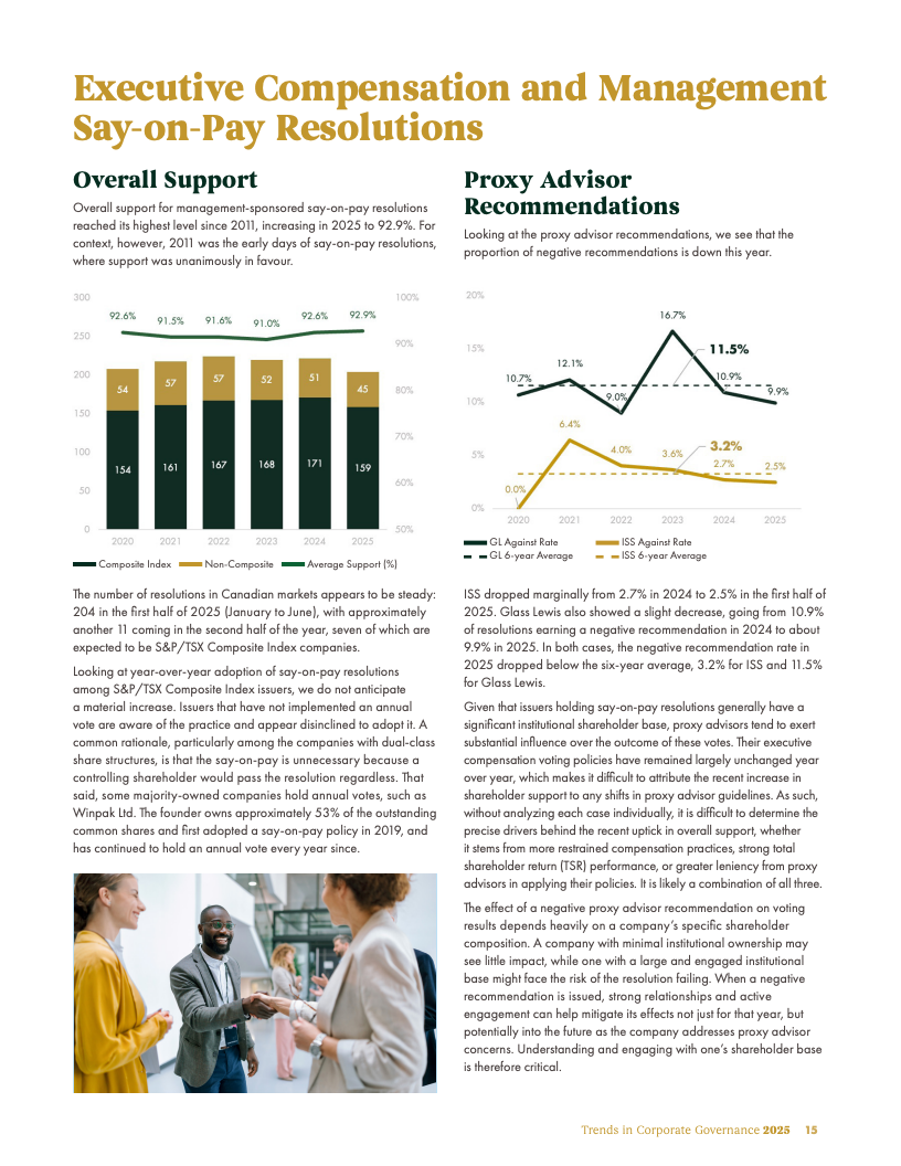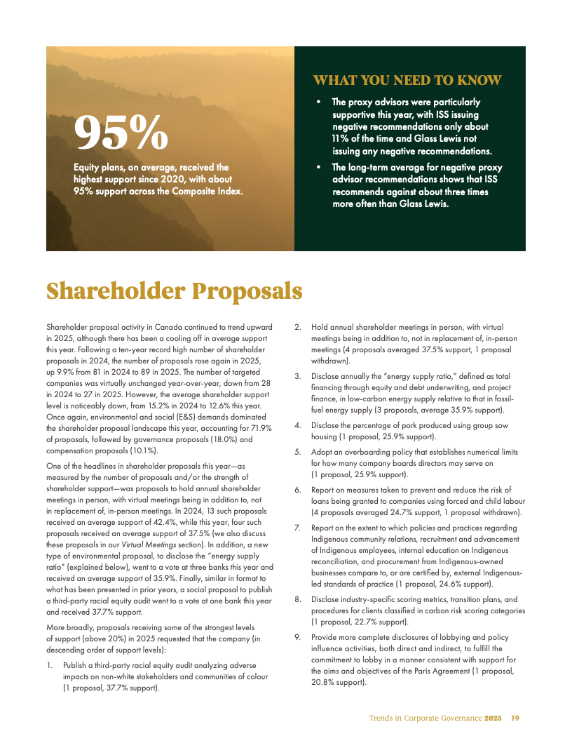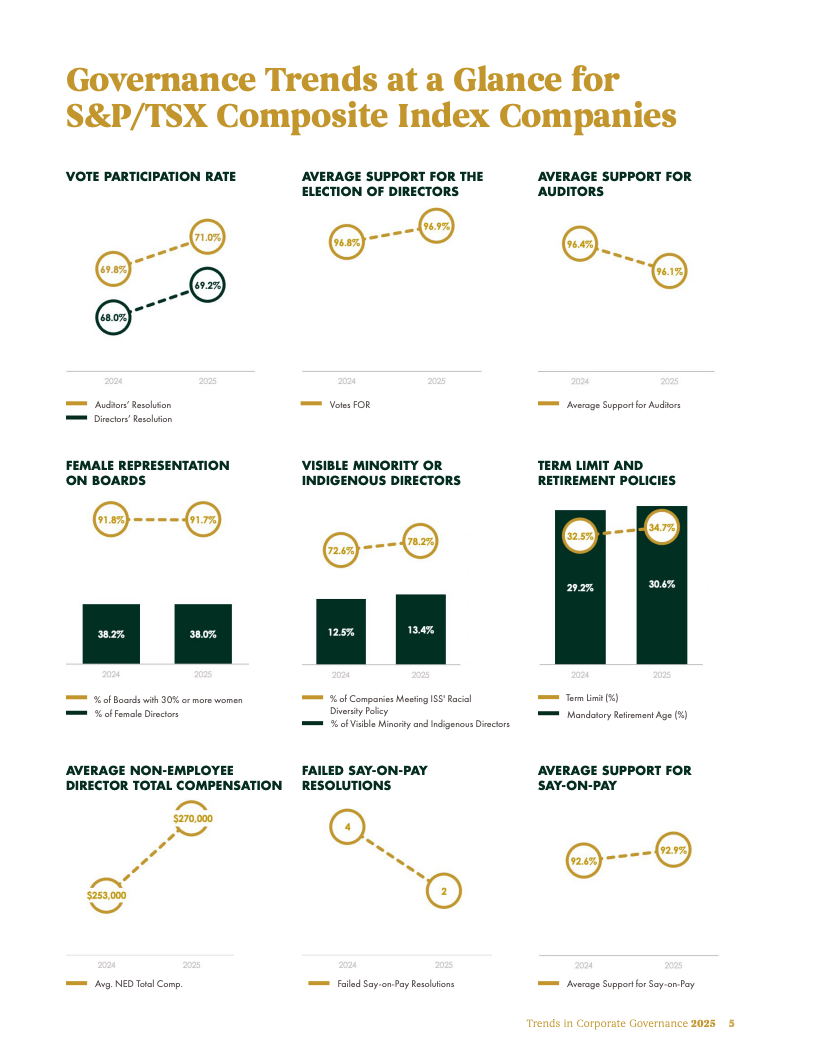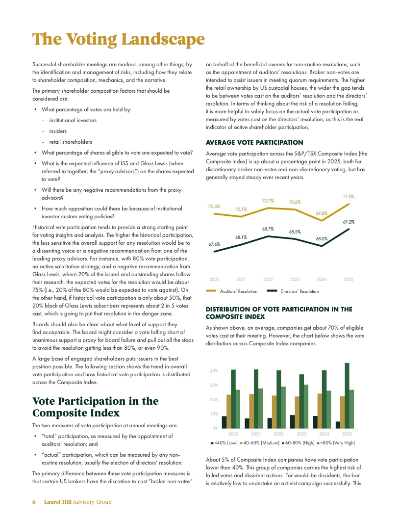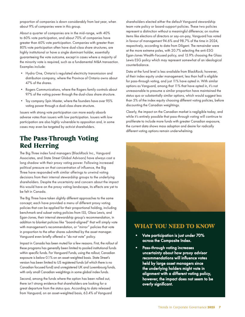 2025年加拿大企业治理持续深化,S&P/TSX公司投票参与率接近70%。其中,5%的公司参与率低于40%,为决议失败和激进投资者行动的高风险群体。代理顾问影响力在50%参与率下,Glass Lewis反对票占实际投票数40%,可致决议陷入危险。2025年“代理投票传递”机制影响有限,Vanguard仅0.1%参与,资产63.4%选择默认政策,显示激进政策需求不足。